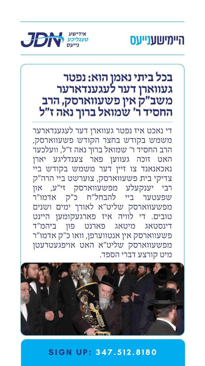 בד"ה: צוויי אידישע פילאטן באשטעטיגט אלס אומגעקומענע אין העליקאפטער קראך אין ניו דזשערסיניו דזשערסי - זונטאג פארמיטאג האט פאסירט א שווערע עקסידענט צווישן צוויי העליקאפטערס הארט נעבן די "האמינטאן מוניציפאליטעט" לופטפעלד, אין רעזולטאט האבן ביידע העליקאפטערס אראפגעקראכט, היינט מאנטאג איז ארויסגעקומען די אידענטיטעט פון די אומגעקומענע פילאטן און עס איז ליידער באשטעטיגט געווארן אז זיי זענען אידן.די צוויי פילאטן זענען אידענטיפיצירט געווארן אלס דער 71 יעריגער מייקל גרינבערג ע"ה פון סועל, ניו דזשערסי, און דער 65 יעריגער קענעט קירש ע"ה פון קארניס פוינט, ניו דזשערסי, גרינבערג איז אומגעקומען אויפן ארט און קריש איז אין איילענישט אפגעפירט געווארן מיט א העליקאפטער צו די קופער יוניווערסיטי שפיטאל וואו ער איז שפעטער אומגעקומען פון די וואונדן.די צוויי פילאטן זענען געווען גוטע פריינט וועלכע פלעגן אפט פליען מיט זייערע העליקאפטער, נעכטן זונטאג זענען זיי ארויסגעפלויגן איינע נעבן די אנדערע און זייענדיג צו נאנט האבן זיך די העליקאפטער אנגעשטויסן און אראפגעקראכט א מייל אוועק פונעם לופטפעלד.מתעסקים פון סענטראל דזשערסי ארבעט אינאיינעם מיט די זיכערהייט אויטעריטען צו פארזיכערן כבוד המת.בשורות טובות.