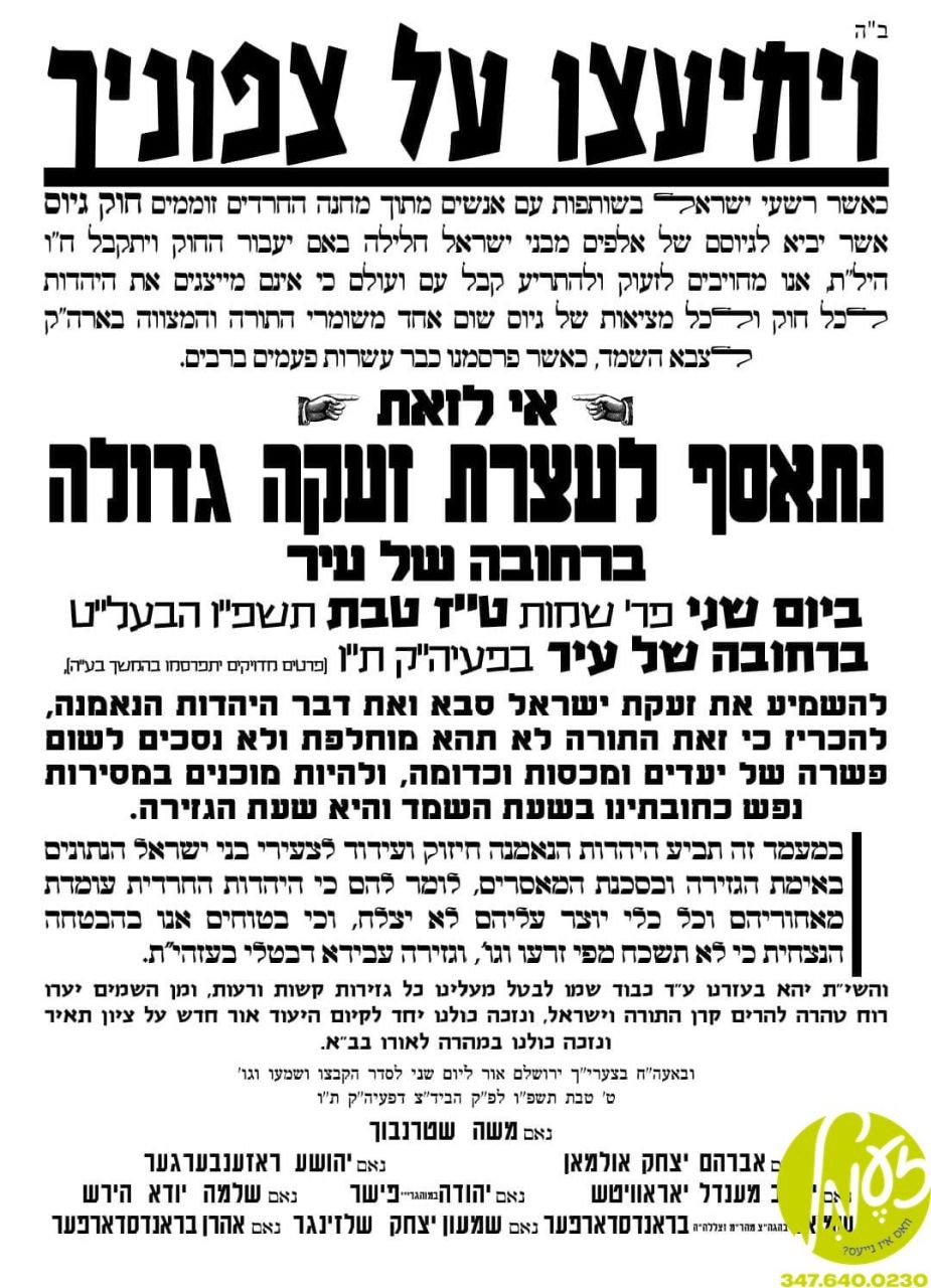ירושלים - נאך וואס עס איז געמאלדן געווארן ביים נעכטיגע כינוס גדולי ישראל א מאסן עצרת מחאה קומענדיגע וואך מאנטאג, איז ערשינען א קול קורא פון די בד"ץ עדה החרדית זיך צו באטייליגן ביים עצרת.