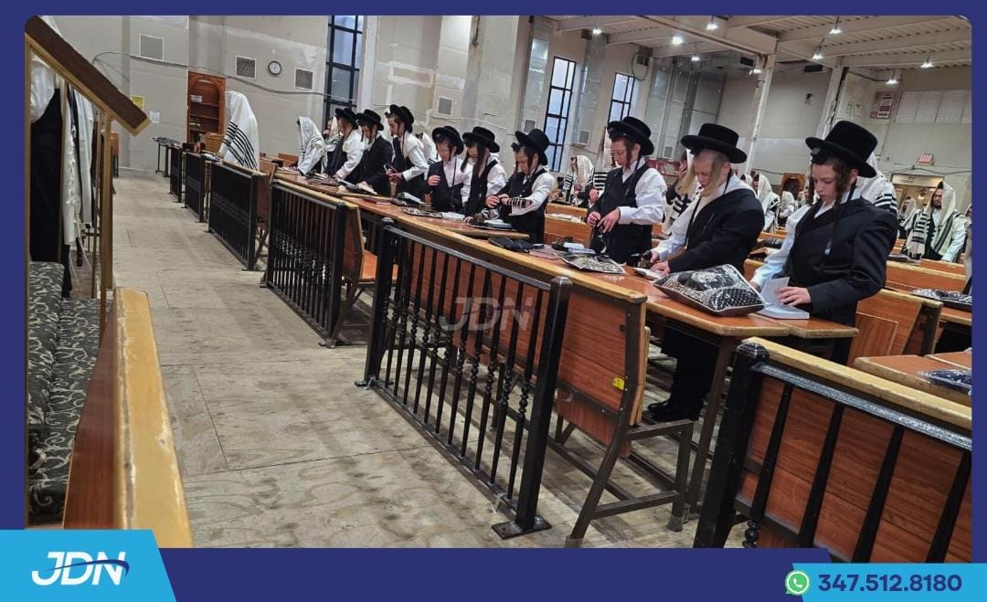 מערערע בר מצוה בחורים היינט ביי תפילת שחרית אין ביהמ"ד הגדול ד'סאטמאר, נאכן תפילין לייגן ביי האדמו"ר מסאטמאר, וועלכע האט געוויילט די לעצטע וואכן אויף אפרו.