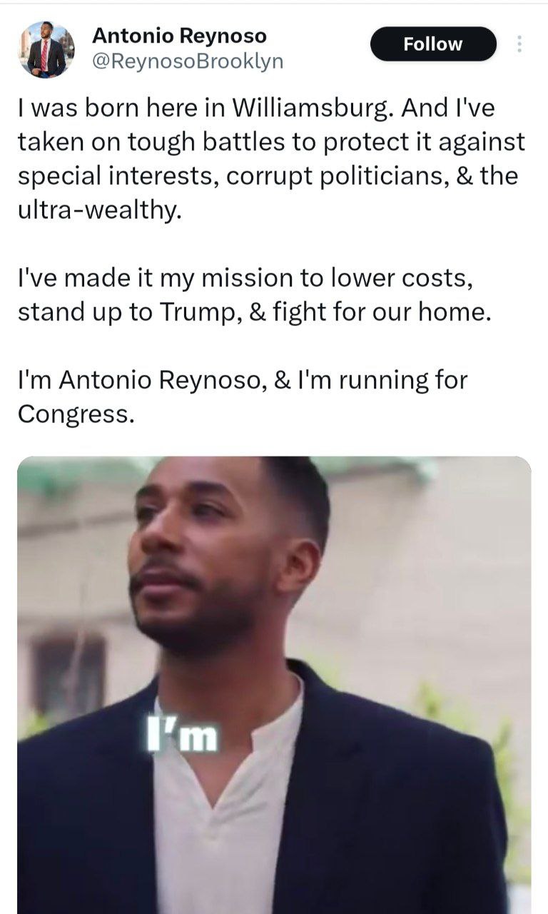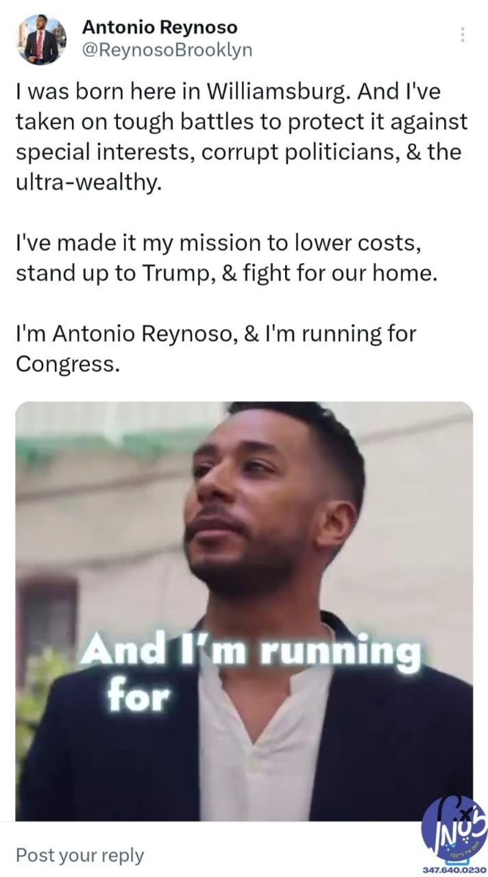 ברוקלין בארא פרעזידענט אנטאניא רעינאזא האט געמאלדן זיין קאמפיין צו איבערנעמען לאנגיעריגע קאנגרעספרוי נידיא וועלאזקעז, ווערנדיג דער ערשטער קאנדידאט צו אריינגיין אין דער פארמעסט. רעיזאנא שרייבט אז "ער האט געמאכט זיין מיסיע צו נידערן קאסט און זיך שטעלן קעגן פרעזידענט טראמפ".אידישער ווינקל: https://wa.me/13473456278?text=Join