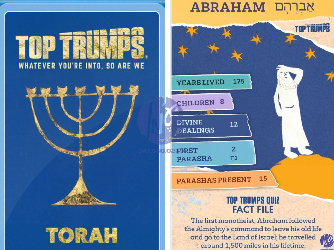 ענגלאנד - מיט א יאר צוריק איז א 24 יעריגער אידישער סטודענט פון לאנדאן דזשאודזשאו שוגערמאן געזעסן ביי די שבת סעודה ווען זיין 10 יעריגער שוואגער האט אים געפרעגט פארוואס עס איז נישט פארהאן א אידישע ווערסיע פון די אלגעמיינע ׳טאפ טראפמס׳ קארטל שפיל, שוגערמאן האט באשלאסן דאס צו נעמען פאר א מיסיע און די וואך איז צום ערשטן מאל ערשינען די שפיל אין א אידישע ווערסיע. די שפיל איז גאר פאפולער און איז פארהאן אין פילע ווערסיעס און האט זיך שוין פארקויפט 80 מיליאן דערפון, עס פארמאגט דרייסיג קארטלעך מיט נעמען פון מענטשן אדער אביעקטן, יעדע קארטל פארמאגט פינף פאקטן איבער יענעם און דער שפילער דארף אויסרופן די פאקט וועלכע ער מיינט איז די העכסטע ציפער צו געווינען די קארטלעך פון די אנדערע שפילער. די נייע אידישע ווערסיע פארמאגט די נעמען פון די דורות פון אדם הראשון ביז יהושע און כלב, עס פארמאגט פינף פאקטן דערויף גענומען געווארן פון די תורה אדער מדרשי חז"ל, די פאקטן זענען ווי לאנג יענער האט געלעבט, וויפיל קינדער ער האט געהאט, וויפיל מאל זיי האבן גערעדט מיטן אויבערשטן, די ערשטע פרשה און אין וויפיל פרשיות זיי ווערן דערמאנט.