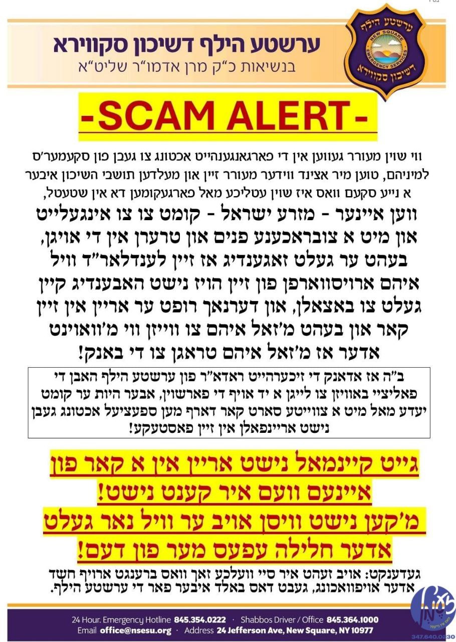שיכון סקווירא - די 'ערשטע הילף' ארגאניזאציע האט ארויסגעשטעלט א סקעם אלערט פאר איינוואוינער פון שטעטל.