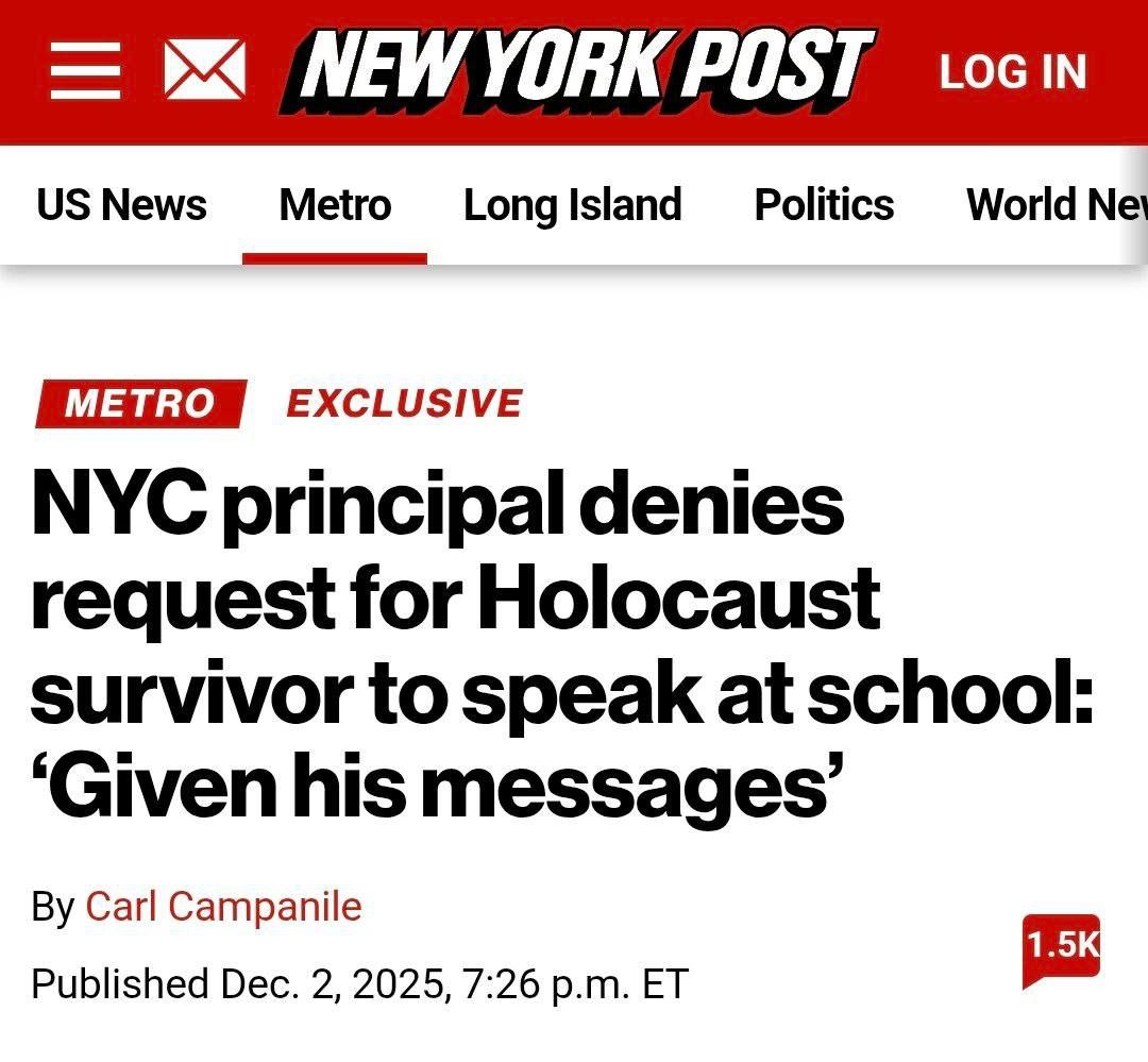 א ברוקלין מידל סקול פרינציפל האט בלאקירט א מלחמה איבערלעבער פון געבן א רעדע פאר סטודענטן. מידל סקול 447 פרינציפל, ארין ראש האט געזאגט פאר עלטערן פון די שולע אז מלחמה איבערלעבער, מיט'ן נאמען סעמי סטייגמאן און זיין מעסעדזש איבער מדינת ישראל און פאלעסטינע מאכט אים 'אומעקצעפטירבאר' פאר א פובליק שולע אויפטריט. סטייגמאן איז 85 יאר אלט, ער האט איבערגעלעבט א נאצי ארבעט לאגער אלס קינד, און ער רעדט נישט איבער יעצטיגע פאליטיק און אקטועלע פאסירונגען, זיינע רעדעס לויפן ארום איבערלעבן די האלאקאסט, אויפשטיין קעגן האס און וואס פאסירט ווען אנטיסעמיטיזם ווערט איגנארירט. אידישער ווינקל: https://wa.me/13473456278?text=Join