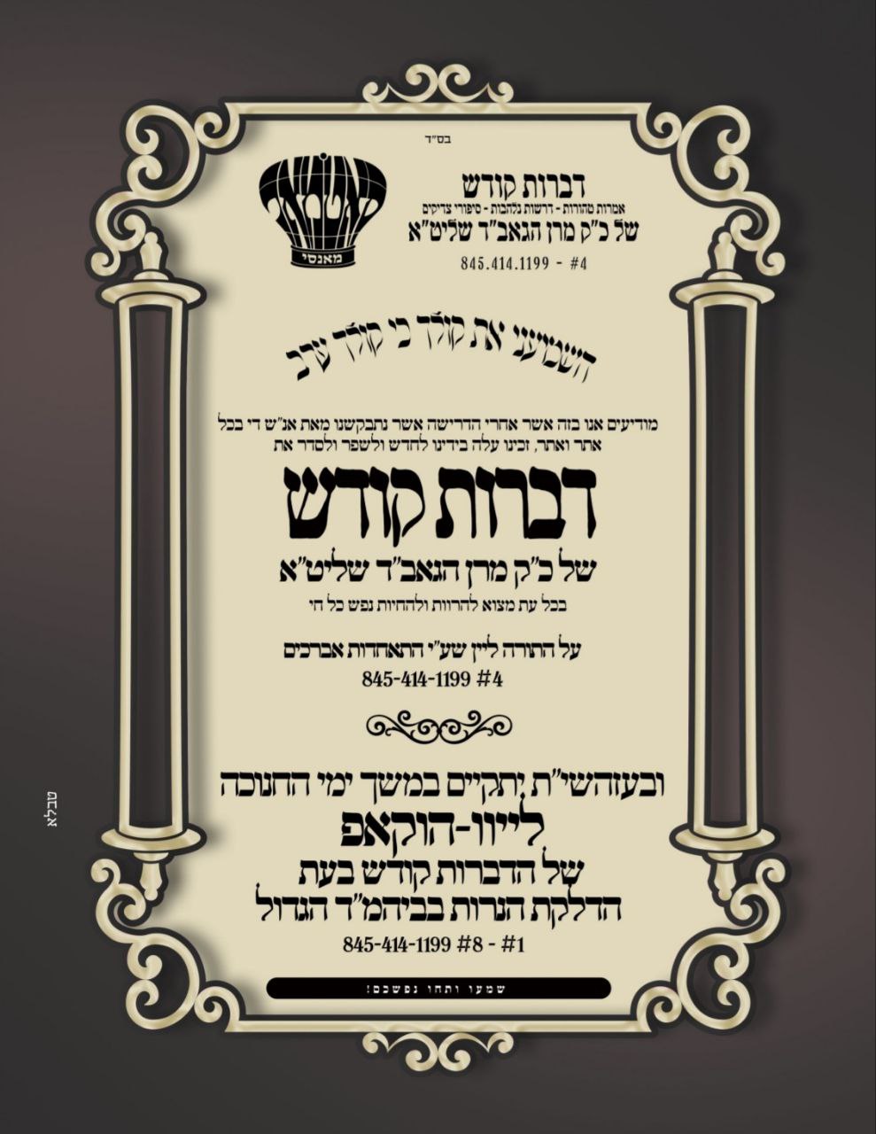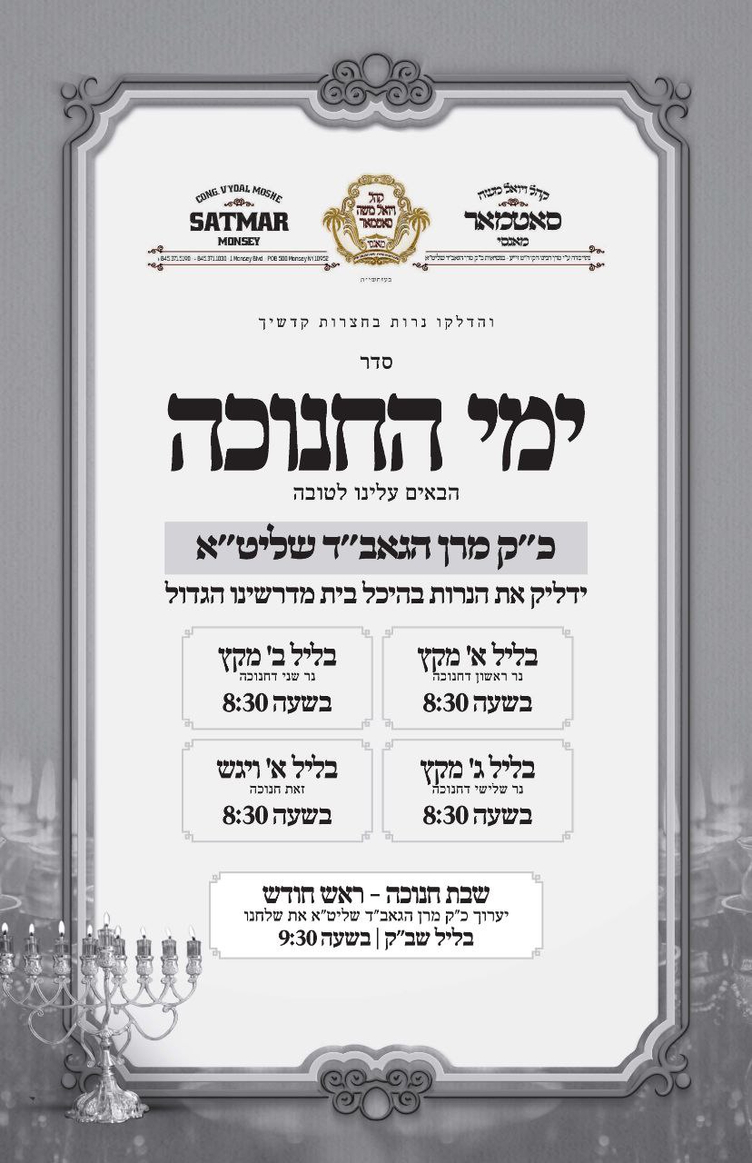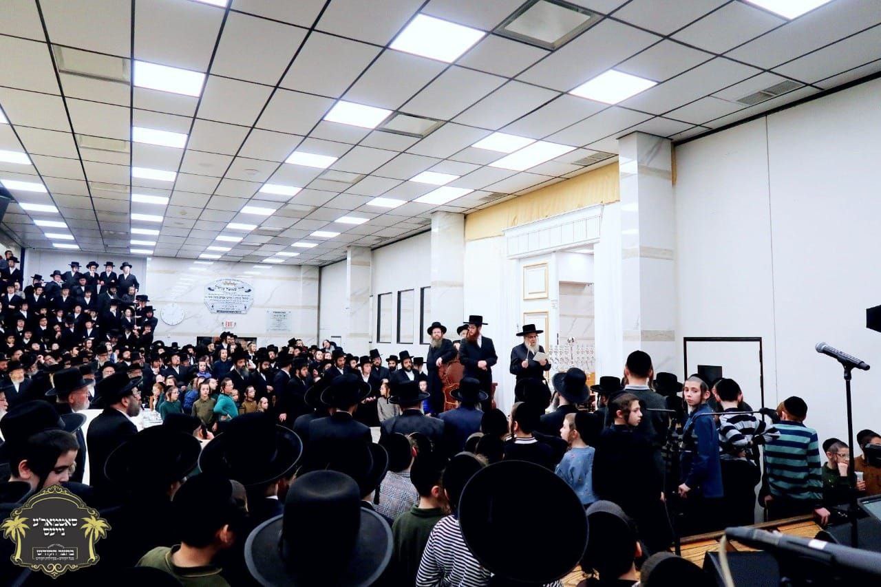 =שבת קודש פרשת וישב - מבה"ח טבת=ארום 5:05 איז דער רבי אריינגעקומען צו מנחה ערב שבת קודש, ווי דער רבי איז צוגעגאנגען צום עמוד.קבלת שבת: הרה"ג ר' אברהם שלמה כ"ץ שליט"א - אב"ד ריסקעווע ב"ב.מען האט געענדיגט דאווענען ארום 6:40.נאכן דאווענען איז פארגעקומען די אפיעל פאר ת"ת משאת בנימין אין קוממיות עטה"ק.דערנאך איז דער ציבור אריבער זאגן גוט שבת און דער רבי איז אהיים לביתו נאוה קודש.ארום 8:35 איז דער רבי אריינגעקומען צום שלחן הטהור בהיכל המתיבתא אינאיינעם מיט די תלמידי הישיבה. מיט אשת חיל האט דער רבי מכבד געווען דעם אייניקל הב' ישכר בער ט"ב ני"ו בן חדב"ן הגה"צ רב דביהמ"ד ברך משה שליט"א.מיט הגבהת הכוס איז מכובד געווארן הרה"ג ר' אברהם שלמה כ"ץ שליט"א.מיט כל מקדש האט דער רבי מכבד געווען הרה"ג ר' אברהם שלמה כ"ץ שליט"א. מנוחה ושמחה: הרה"ח ר' טובי' שעהנפעלד הי"ו - וומ"ס.דערנאך האט דער רבי געזאגט תורה אויפן פסוק וישב יעקב בארץ מגורי אביו און עס אויסגעטייטשט בדרך דרוש אינעם סוגיא פון דרשינן טעמא דקרא.קה אכסוף: הרה"ח ר' אהרן פראנקל הי"ו - וומ"ס.ברכת המזון: האדמו"ר מלייפניק שליט"א פון ב"ב.דערנאך האט דער רבי דערציילט עובדות וסיפורים פון זקינו הרה"ק רבי יואל אשכנזי זצ"ל - אב"ד זלאטשוב וואס די יארצייט איז געפאלן ערש"ק כ"ב כסלו. קה רבון עלם: הרה"ח ר' מענדל עקשטיין הי"ו.מען האט אויפגעגעבן פירות און די פרישע חתנים זענען אריבער נעמען שיריים.אז ביום השביעי: הר"ר משולם שרגא כ"ץ שליט"א - ירושלים.מען האט געענדיגט די טיש ארום 11:20.=וביום השבת=דער רבי איז אריינגעקומען צום דאווענען ארום 9:20.ברכות ופסוקי דזמרה: הרה"ח ר' מענדל וואלף טייטלבוים הי"ו.דער רבי איז צוגעגאנגען צום עמוד צו תפילת שחרית.ביים ליינען זענען נתכבד געווארן:הוצאה והכנסה: הרה"ח ר' דוד שלמה בערגער הי"ו.פסוקי שמע ישראל: הרה"ח ר' זלמן לייב אינדיג הי"ו.כהן: הרה"ג ר' אברהם שלמה כ"ץ שליט"א. לוי: הר"ר שלמה לייב גרובער שליט"א. שלישי: הרה"ח ר' חיים יאקאב הי"ו - וומ"ס. רביעי: הרה"ח ר' ישראל העניך קרויס הי"ו. חמישי: ר' משה אהרן בר"י פילאפף הי"ו, און דער רבי האט קורא שם געווען לרגל הולדת בתו למז''ט.שישי: רבינו שליט"א.שביעי: ר' מאיר בוכינגער הי"ו, און דער רבי האט קורא שם געווען לרגל הולדת בתו למז''ט.אחרון: נכד רבינו הרה"ג ר' חיים הערש טייטלבוים שליט"א מראצפערט. מפטיר: הרה"ח ר' יצחק עהרנפעלד הי"ו. הגבה: הרה"ח ר' נחמן פיש הי"ו.גלילה: הרה"ח ר' ישראל שלום אונגאר הי"ו.נאכן ליינען האט רבינו שליט"א ראש חודש געבענטשט מיט גרויס התעורורות.צו תפילת מוסף איז צוגעגאנגען הרה"ח ר' חיים יאקאב הי"ו.פתיחה צו אנעים זמירות: הר"ר משולם שרגא כ"ץ שליט"א.מען האט געענדיגט ארום 12:10.דער רבי איז אריינגעקומען צו תפילת מנחה ארום 5:05.צום עמוד איז צוגעגאנגען הר"ר משה אפרים הערשקאוויטש שליט"א - וומ"ס.ביים ליינען איז מכובד געווארן,הוצאה והכנסה: הרה"ח ר' יוקל ברי"ד הירש הי"ו.כהן: הרה"ח ר' יצחק יעקב כ"ץ הי"ו.לוי: הרה"ח ר' משה מאיר גאטליעב הי"ו. שלישי: הר"ר אברהם הערש זאלדאן שליט"א.דער רבי איז געגאנגען הגבה.גלילה: הרה"ח ר' אברהם יושע ווייס הי"ו - וומ"ס.ביי של"ס האט דער רבי מכבד געווען מיט אודה הרה"ח ר' נח גפן הי"ו.שיר המעלות: הרה"ח ר' משה גאלדשטיין הי"ו.דער רבי האט זיך געשטעלט אויפן פסוק וינס ויצא החוצה און ארויסגעברענגט אז ווען יוסף הצדיק האט געהאט די נסיון איז ער ארויסגעלאפן אין גאס צו מאכן א קידוש השם און זיך מוסר נפש זיין ברבים, און די כח האט ער געהאט אין די זכות פון מצות ציצית וואס ער איז געגאנגען דערמיט בפומבי, דער רבי האט ממשיך געווען מיט דברי הכנה צום יו"ט חנוכה און געזאגט אז דערפאר איז די ענין צו צינדן נר חנוכה בשמאול ומזוזה בימין 'ובעה"ב מצויצת באמצע' וויבאלד חנוכה איז א יו"ט געמאכט אריינצוברענגען א כח פון מסירות נפש פאר כבוד שמים.ידיד נפש: הרה"ח ר' עקיבא הירש הי"ו - וומ"ס.קל מסתתר: הר"ר משולם שרגא כ"ץ שליט"א.דער רבי האט געבענטשט על הכוס.הגבהת הכוס: החתן מרדכי דוב בהר"ר י