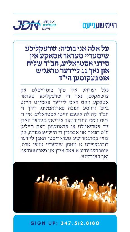 די מדינת ישראל כנסת באלאכטן אין די אויסטראלישע קאלירן, אין סאלידאריטעט מיט די קרבנות הי"ד, אין די היינטיגע טראגישע אטאקע. אידישער ווינקל: https://wa.me/13473456278?text=Join