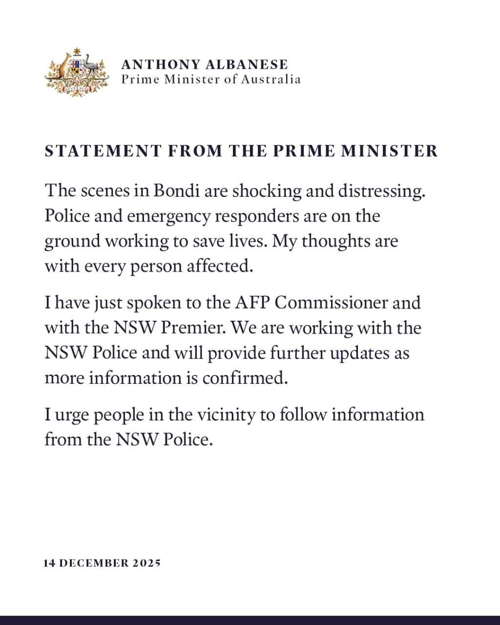אוסטראליע - פרעמיער מיניסטער ענטאני אלבאניז מיט א סטעיטמענט איבער די היינטיגע שרעקליכע טעראר אטאקע אין סידני.