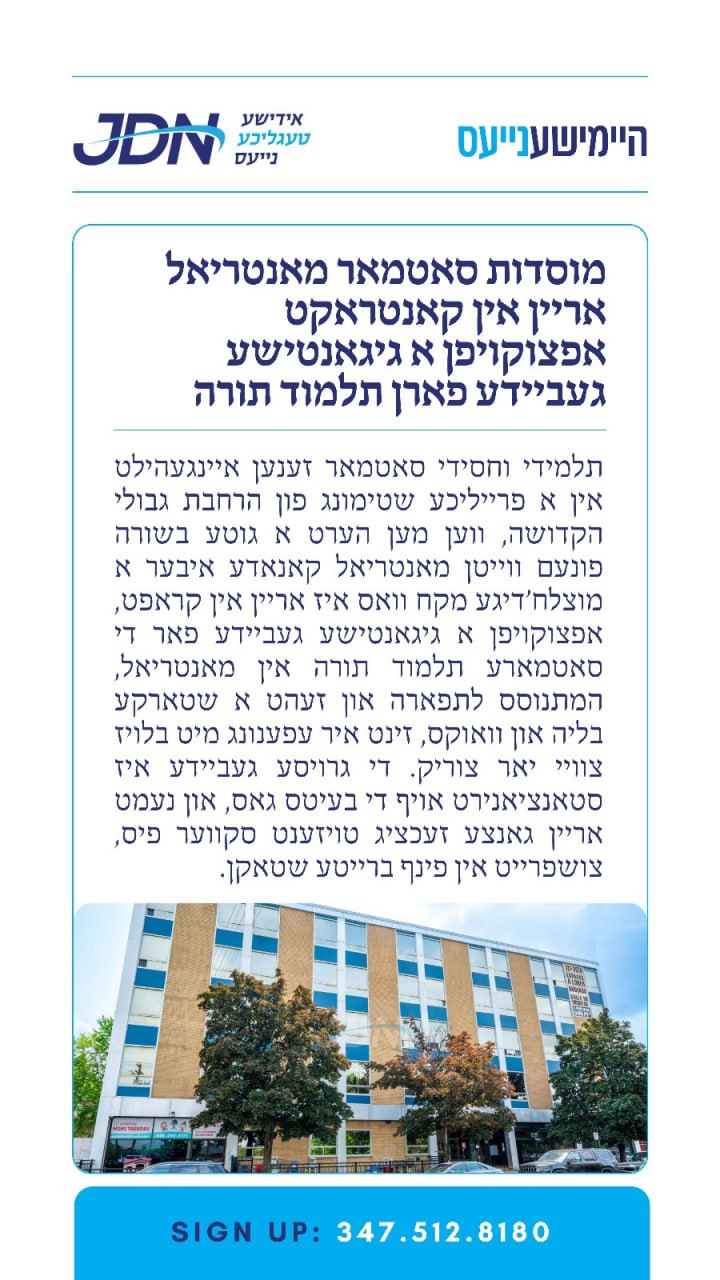 הנהלת קהלתינו הק' אין מאנטרעאל אריין אין קאנטראקט בשעה טובה ומוצלחת אויף א בנין מפואר אין צענטער פון שטאט וואס וועט אי"ה דינען אלס אכסניא של תורה פאר די תלמוד תורה.▫️ סאטמארע נייעס 🌴 ▫️https://chat.whatsapp.com/IpFlOyC5SJ30eoFk1ggspC