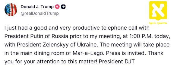 פרעזידענט טראמפ מעלדט אז ער האט געהאט א טעלעפאן שמועס מיט רוסישער פרעזידענט וולאדימיר פוטין און דאס באצייכנט אלס גוט און זייער פראדוקטיוו. די קרעמלין האט אויך באשטעטיגט די טעלעפאן געשפרעך. פרעזידענט טראמפ איז ערווארטעט צו אויפנעמען אוקראינע'ס פרעזידענט וולאדימיר זאלענסקי אין זיין רעזידענץ אין מאר-א-לאגא, אין פלארידא. אידישער ווינקל: https://wa.me/13473456278?text=Join