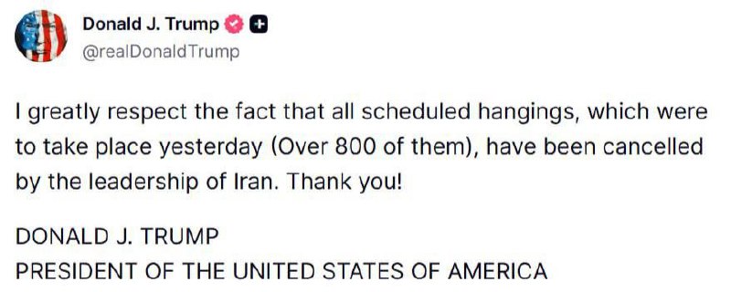 פרעזידענט טראמפ באדאנקט זיך פאר די רעזשים אין איראן אז זיי האבן נישט דערמארדעט 800 מענטשן. אידישער ווינקל *סטאטוס*:https://wa.me/13473456278?text=Joinאידישער ווינקל *גרופע*:https://chat.whatsapp.com/BN4IyLfXAN92HpIy00tQ1Q