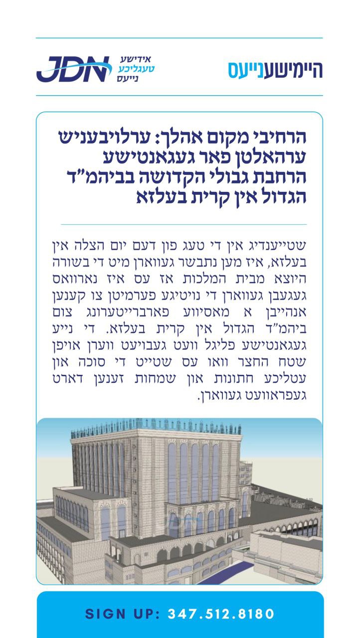 ירושלים - חסידי בעלזא איבער די וועלט האבן מיט גרויס פרייד אויפגענומען די נייעס אז נאך לאנגע יארן פון שתדלנות און צוזאמענארבעט מיט די פלענינג באורד פון די ירושלימער שטאטראט, איז די וואך ענדליך אנגעקומען די ענדגילטיגע פערמיטן צו קענען אונטערנעמען דער מאסיווע בוי פראיעקט צו דראסטיש פארברייטערן דעם היכל ביהמ"ד הגדול און די גרויסע שטוב. די פארברייטערונג וועט עטוואס לינדערן דעם געדרענג וואס מען שפירט יעדע שיינע שבת און אום ימים טובים אין ביהמ"ד הגדול און די גרויסע שטוב, וואס קען שוין נישט אקאמאדירן דעם ציבור הרבבות. די פלענער נעמט אריין דאס פארברייטערן דעם היכל צו די דריי זייטן, מזרח, דרום און מערב, און אויך גענצליך איבערבויען דעם היכל הטישן ׳די גרויסע שטוב׳ מיט גאלעריעס אויף אלע זייטן.די בשורה מרנינה איז אנגעקומען אין די יעצטיגע טעג ווען מ׳צייכנט אפ די יום הצלה פון די אחים הקדושים הרה"ק רבי אהרן מבעלזא זצ"ל און הרה"ק רבי מרדכי מבולגרייא זצ"ל וועלכע זענען אנגעקומען קיין ארץ ישראל נאכן ביטערע קריג און אויפגעבויט חצר הקודש בעלזא פון דאסניי.