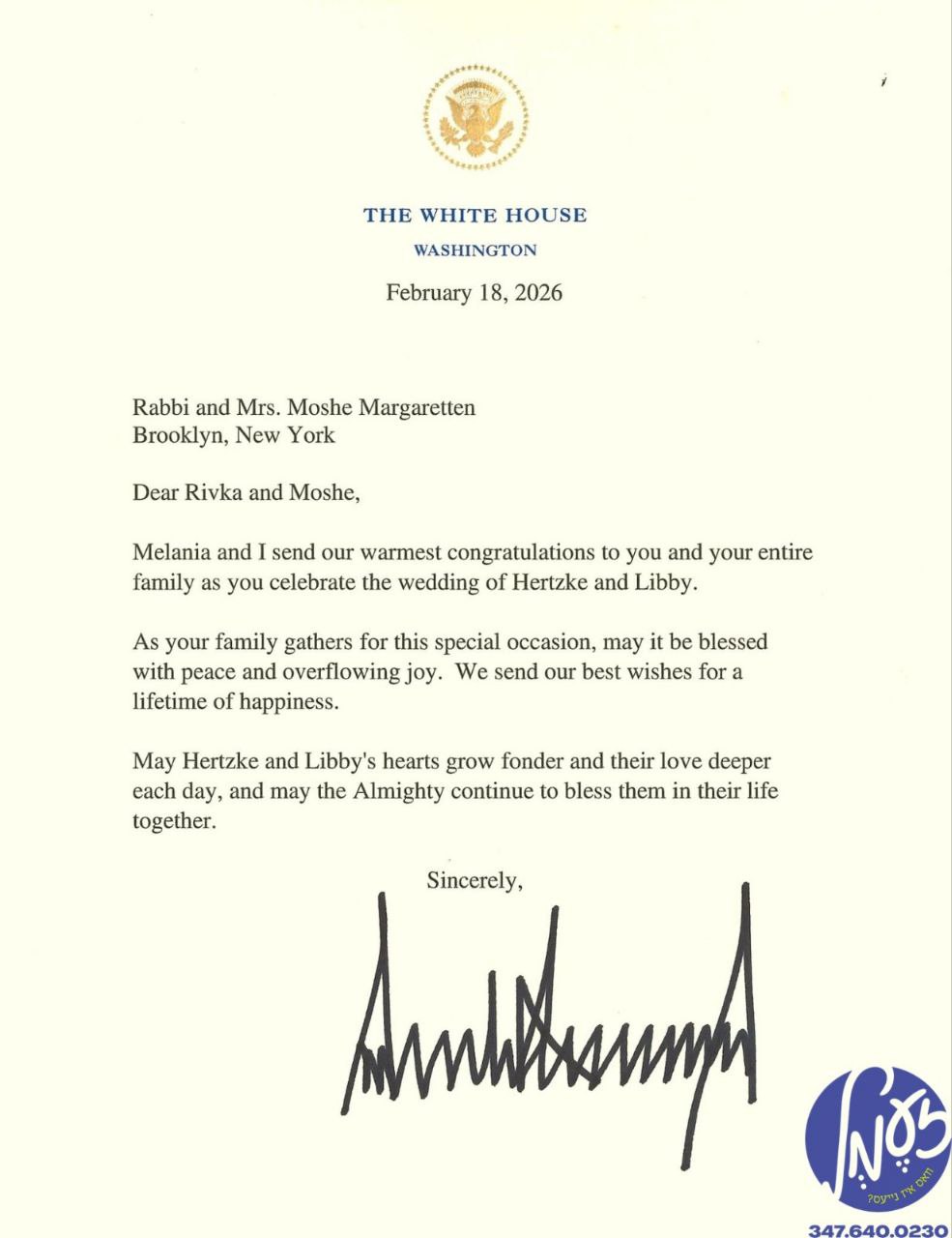 וואשינגטאן - פרעזידענט טראמפ האט געשיקט א וואונטש בריוו צו הרב משה מארגארעטן פארזיצער פון 'צדק' לכבוד די חתונה פון א טאכטער וואס קומט פאר היינט.