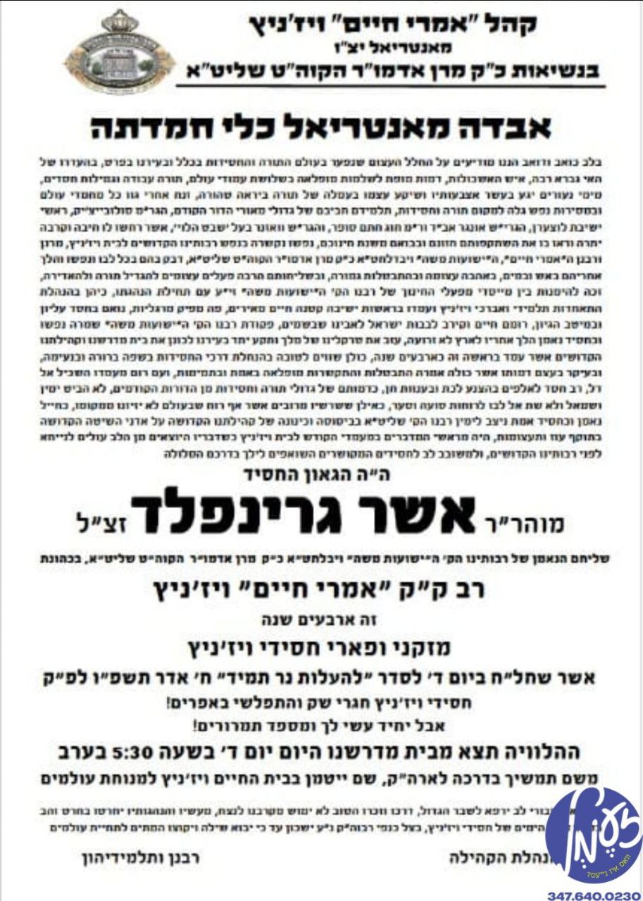 מיט גרויס צער און ווייטאג ווערט אויפגענומען די ביטערע בשורה איבער די פטירה פון הגאון הצדיק רבי אשר גרינפעלד ז"ל, אב"ד וויזניץ מאנטריאל, וועלכע איז נסתלק געווארן אין עלטער פון 82דער רב ז"ל איז געווען א שטארקער מקורב און אפטער גאסט אין טאהש, מיטהאלטענדיג כסדר די טישן און מאורעות בחצרות קדשינו. כמים פנים אל פנים האט יבלחט"א כ"ק רבינו שליט"א שטענדיג ארויסגעוויזן צום רב א גאר שטארקע קענטיגע חביבות והערצה. נאך גאנץ לעצטענס האט רבינו שליט"א אפגעשטאט א באזוך ביים רב אינדערהיים אין מאנטריאל צו מבקר חולה זיין, אזוי אויך האט דער רבי זיך כסדר נאכגעפרעגט אויפן מצב הבריאות, און געריפן אויפן טעלעפאון צום רב דורש זיין בשלומו, און מתפלל געווען לרפואתו.די לויה וועט פארקומען היינט אויפדערנאכט ארום 7:00 ביינאכט ביי ביהמ"ד וויזניץ אין מאנטריאל, אויפן וועג קיין ארץ ישראל וואו דער רב וועט קומען לקבורה.שנשמע ונתבשר בשורות טובות.אויפן בילד: דער רב ביים שלחן הטהור פארגאנגענעם ז"ך אב תשפ"ה בביהמ"ד הגדול