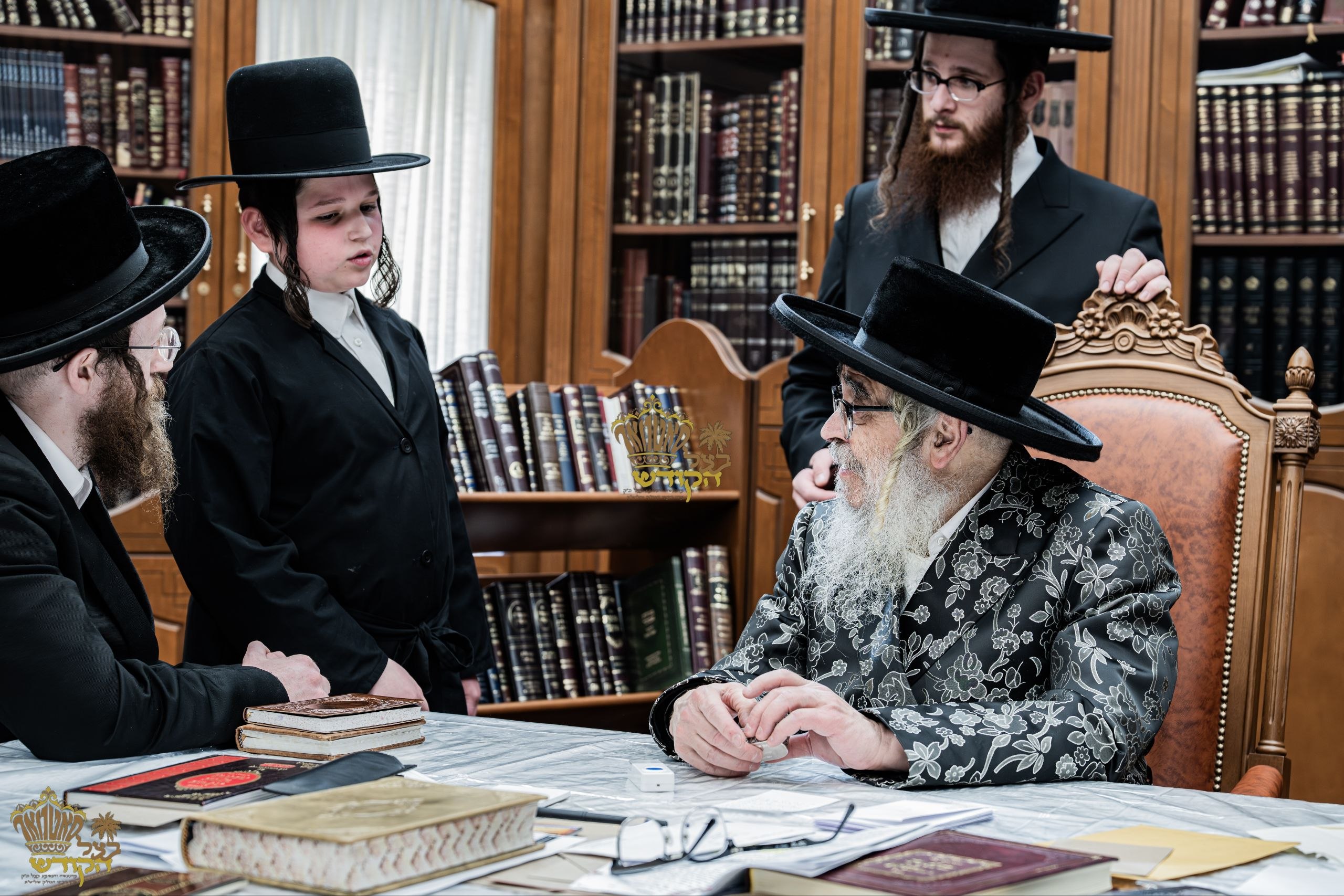 קרית יואל - האדמו"ר מסאטמאר נאך א ברית פון אן אייניקל, ווען דערנעבן זעט זיך אהן ישיבה גדולה בחורים וועלכע גייען ארום פאר צדקה, פארשטעלט.