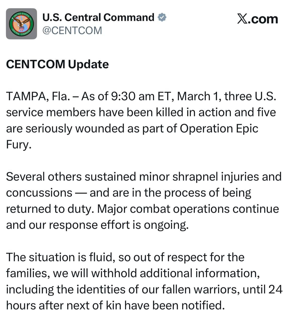 ברעיקינג: די אמעריקאנער מיליטער (CENTCOM) האט באשטעטיגט די שווערע נייעס אז דריי זעלנער זענען געשטארבן און פינף אנדערע זענען ערנסט פארוואונדעט געווארן אין לויף פון "אפעראציע עפיק פיורי" (Operation Epic Fury).אידישער ווינקל *סטאטוס*:https://wa.me/13473456278?text=Joinאידישער ווינקל *גרופע*:https://chat.whatsapp.com/BN4IyLfXAN92HpIy00tQ1Q