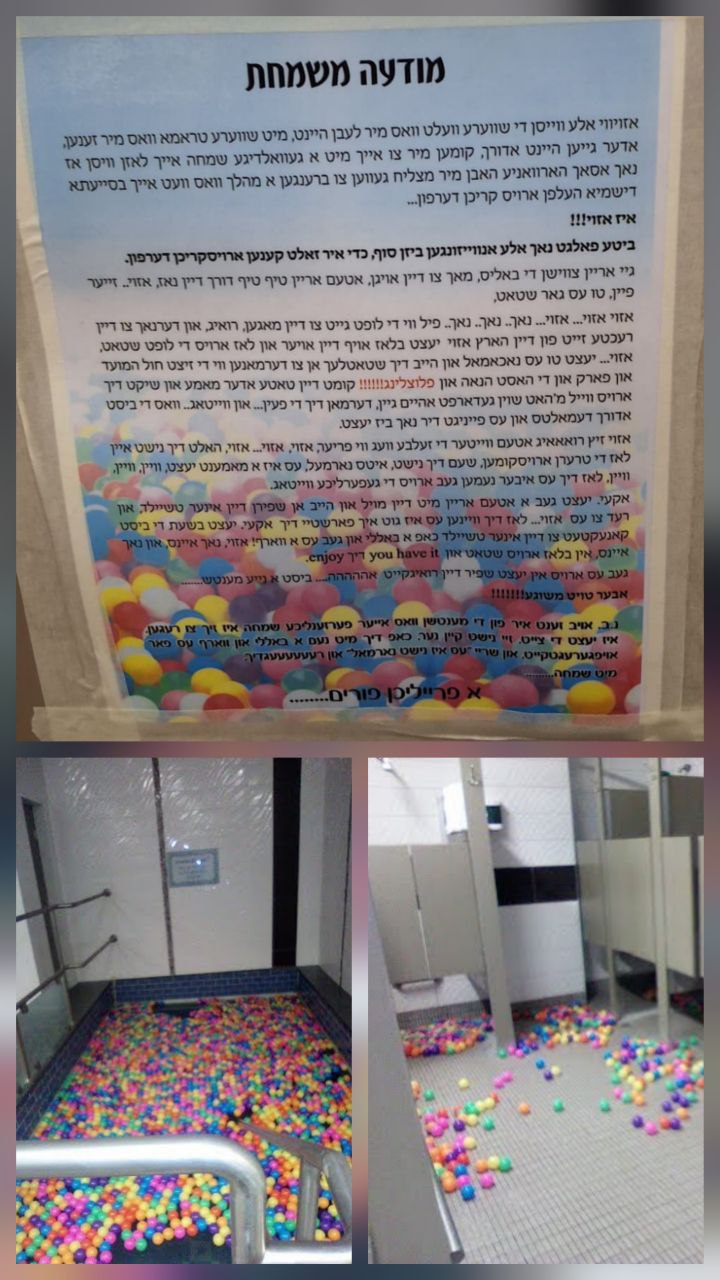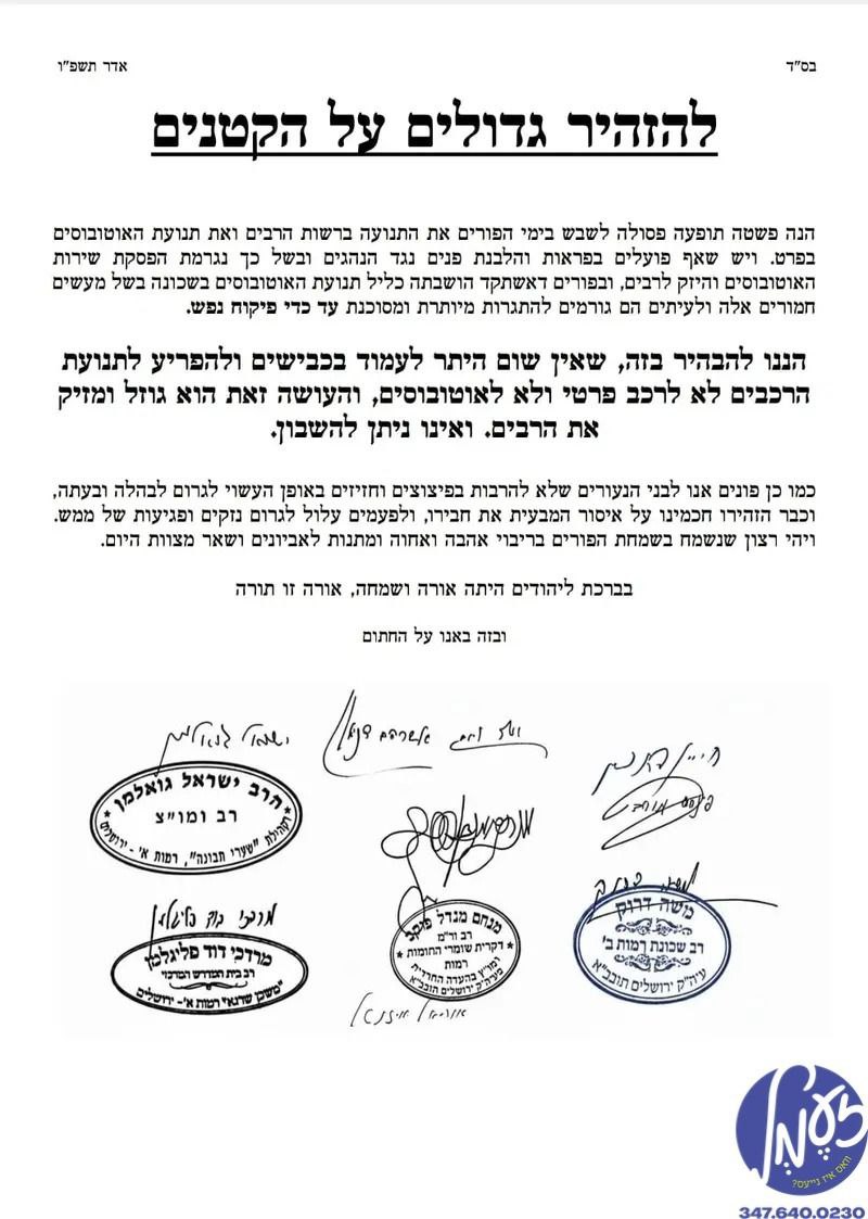 ירושלים - אין בעפארברייטונג צו פורים, איז די וואך ערשינען א בריוו אונטערגעשריבן דורך די רבני הקהילות פון אלע קרייזן אין די רמות געגנט ׳להזהיר גדולים על הקטנים׳ צו נישט ווילדעווען אויף די גאסן אום פורים.