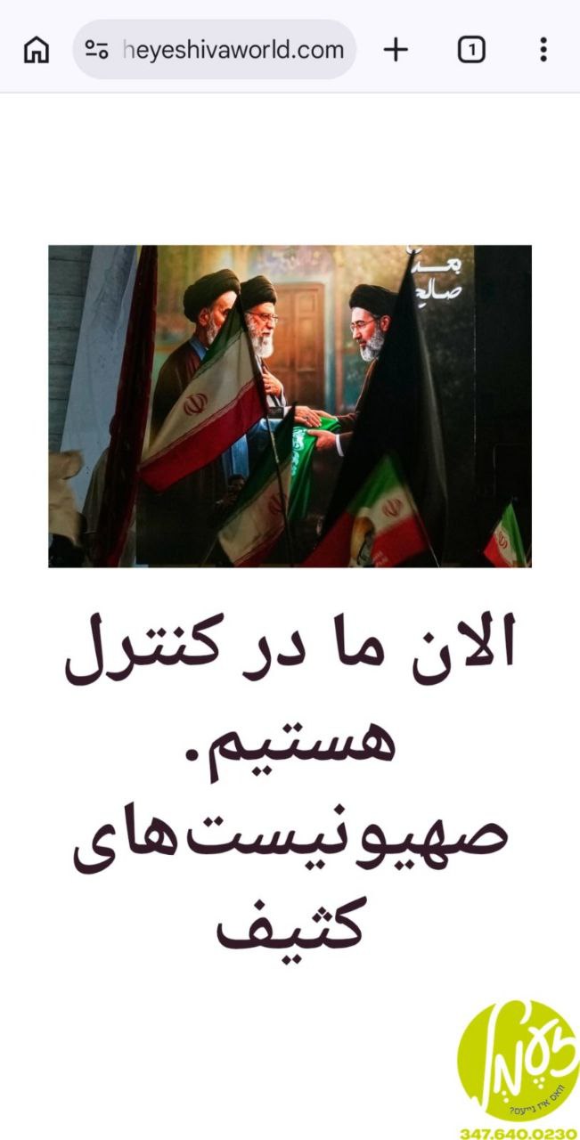 די באקאנטע ׳ישיבה ווארלד׳ וועבזייטל איז געהעקט געווארן דורך איראנער העקערס וועלכער האבן ארויפגעשטעלט א בילד פון די דריי איראנער גייסטליכע פירער און געשריבן אויף פערסיש: ׳מיר זענען אצינד אין קאנטראל - שמוציגע ציוניסטן׳.