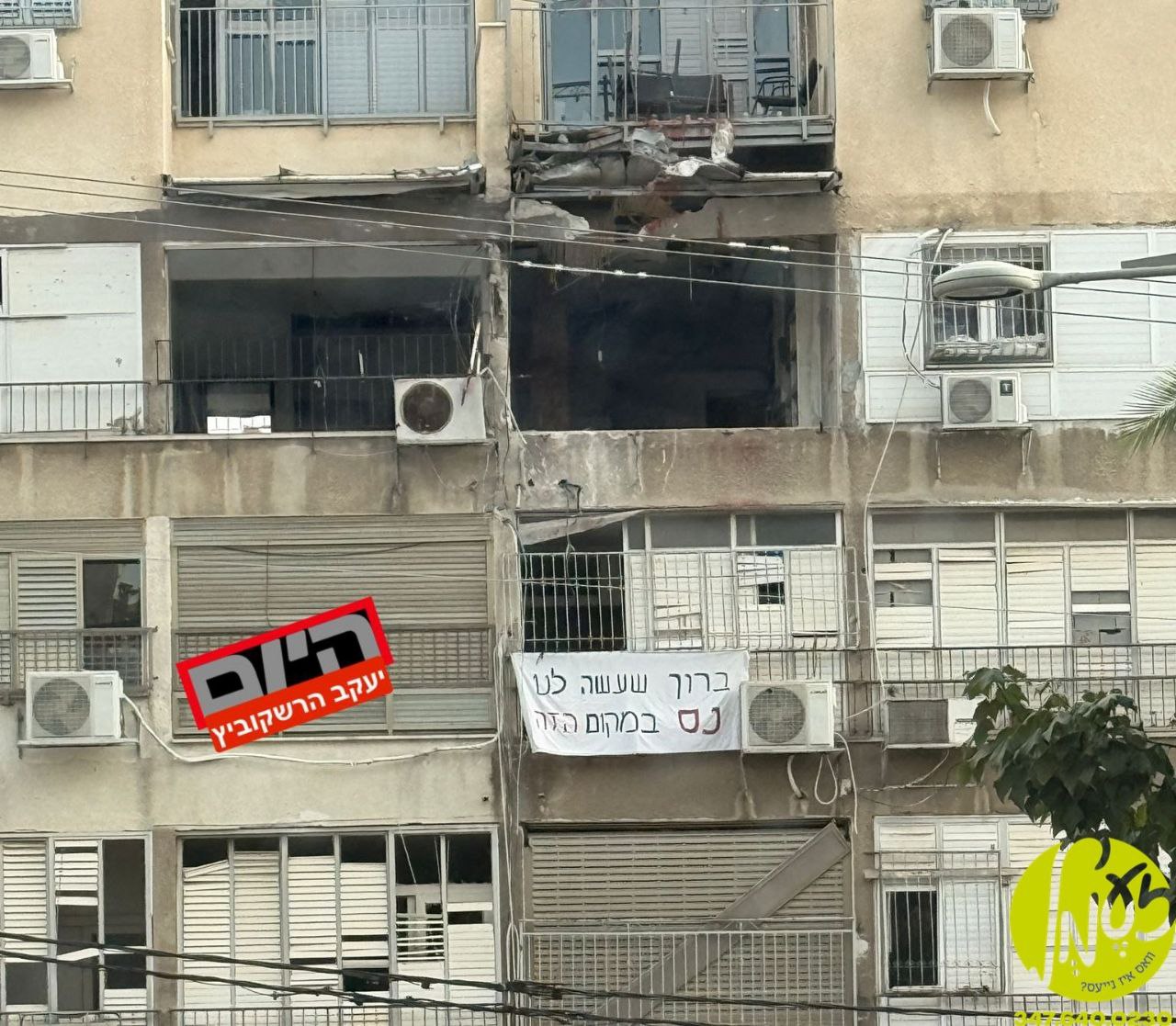 בני ברק - א פאמיליע וועלכער וואוינט א שטאק אונטער די געביידע וואס איז פארניכטעט געווארן פון אן איראנער מיסיל האט ארויסגעשטעלט א שילד ׳ברוך שעשה לנו נס במקום הזה׳.