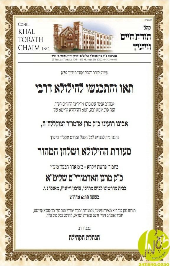 מאנסי - צום 8'טע יארצייט פון הרה"ק בעל תורת מרדכי מוויזניץ זצ"ל, וועלן בניו האדמורי"ם שליט"א היינט פראווען דער טיש אינאיינעם אין ביהמ"ד הגדול וויזניץ.