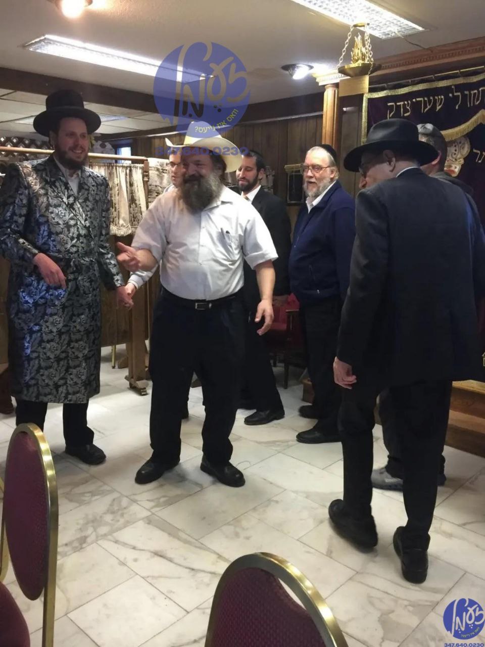 האדמו"ר מוויזניץ לאנדאן ביי תפילת שחרית און מסיבת לחיים אין ביהמ"ד עובדי השם אין די פעביווואד פאבריק, אין ניו זשערסי.