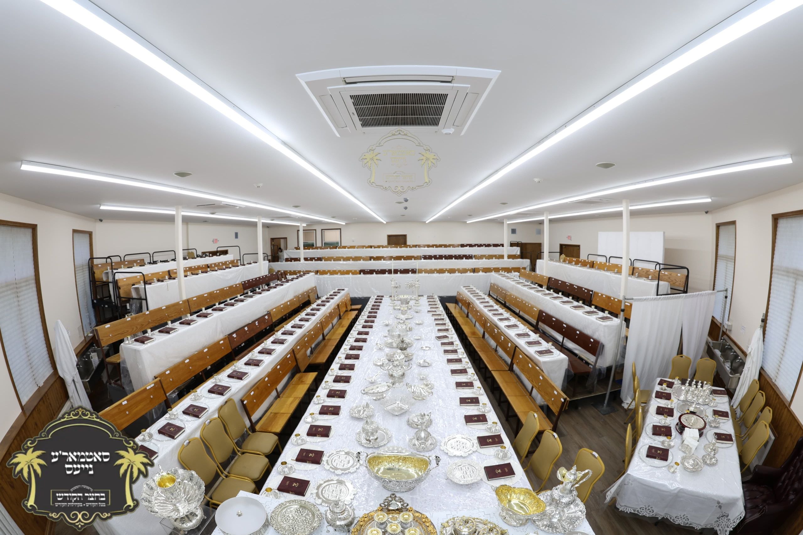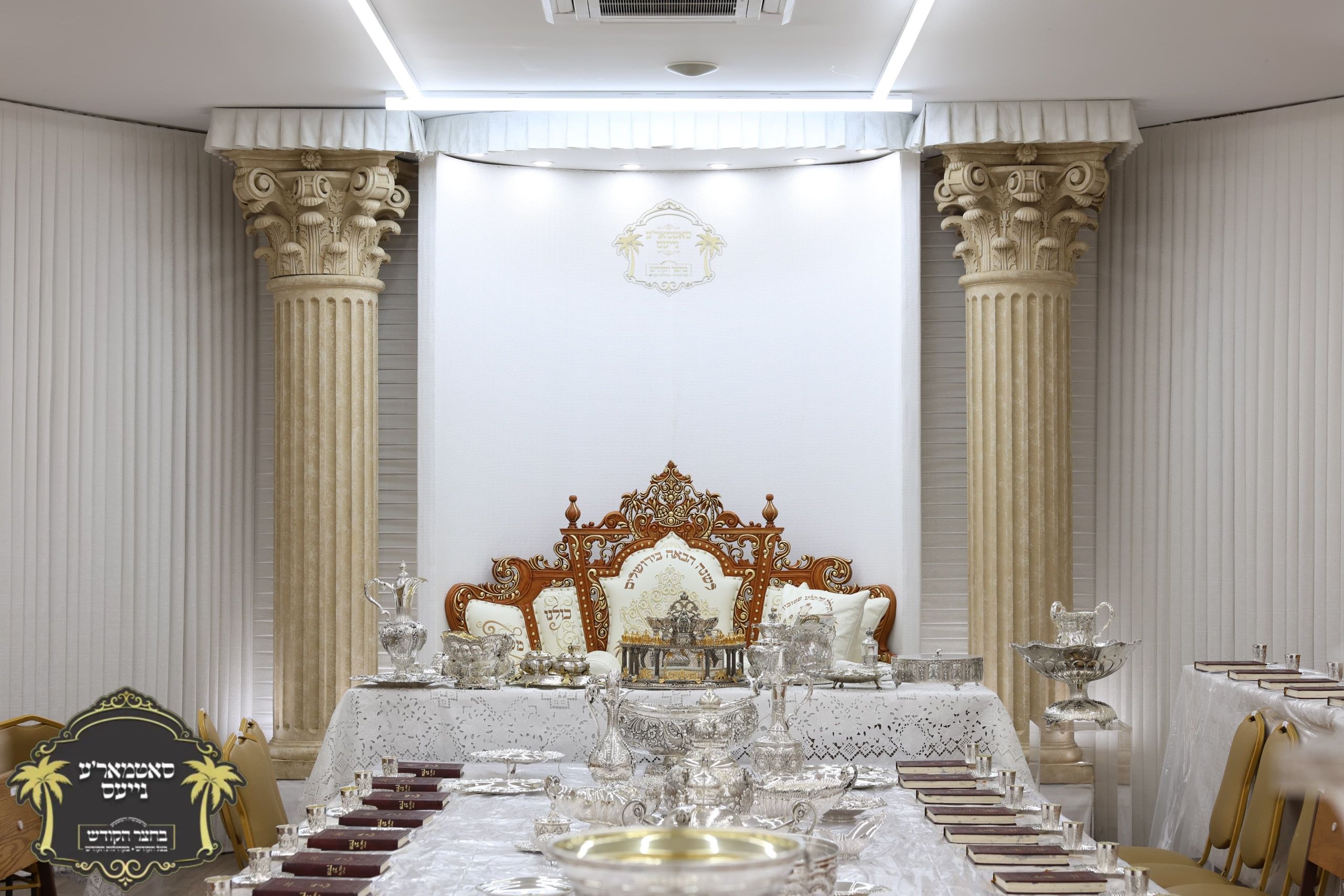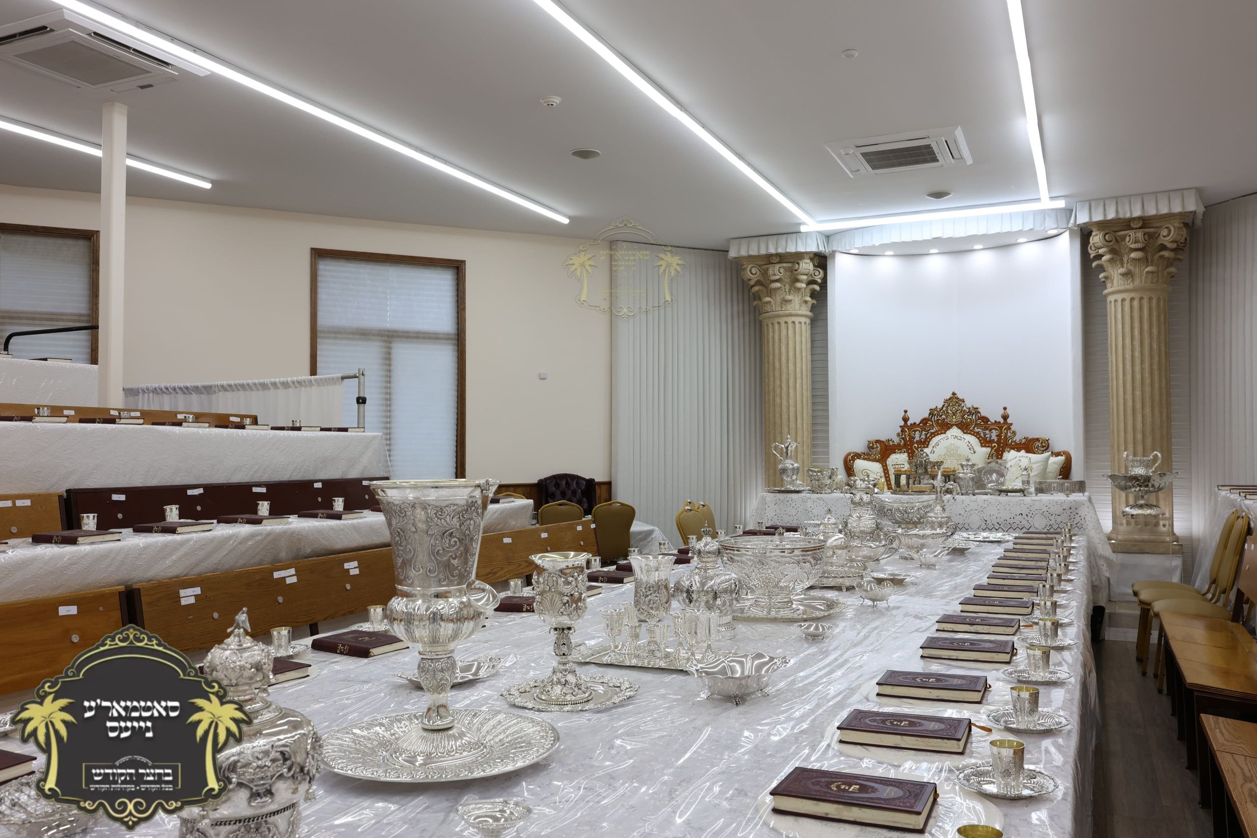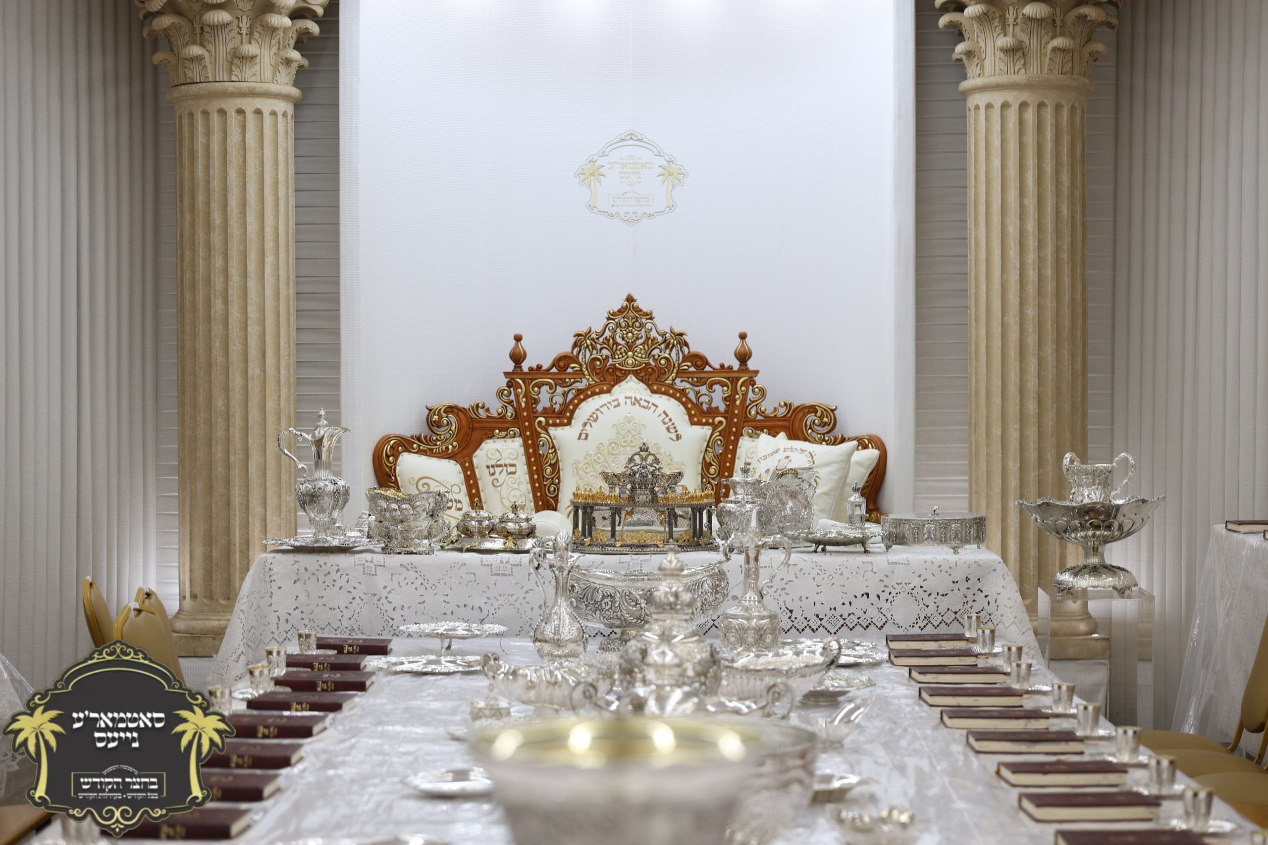 מלכות'דיגע סדר טיש אנגעגרייט אינעם זאל בביתו נאוה קודש ווי רבינו שליט"א וועט פראווענען די ליכטיגע סדרים אינאיינעם מיט די הונדערטער חתנים תלמידי ישיבתינו הק'. ~🌴~