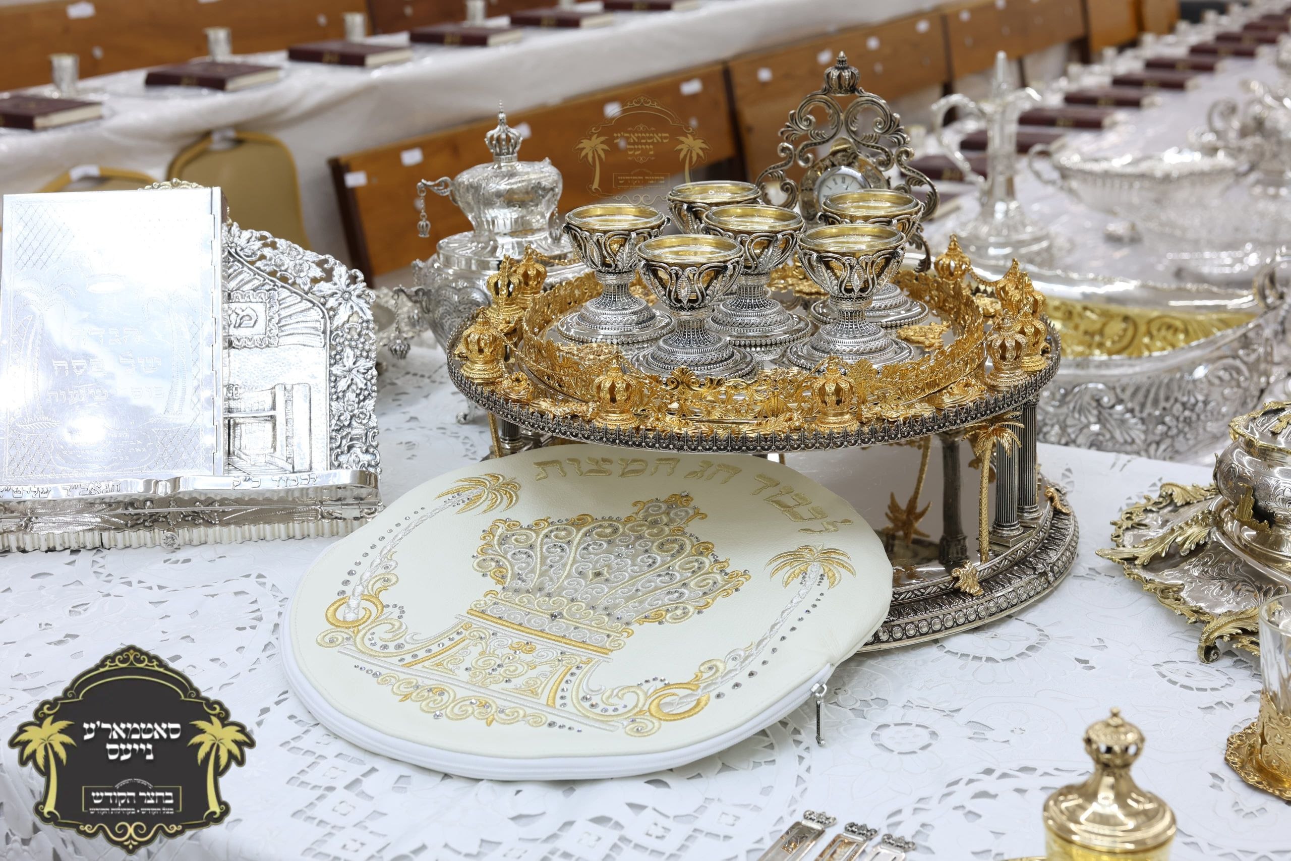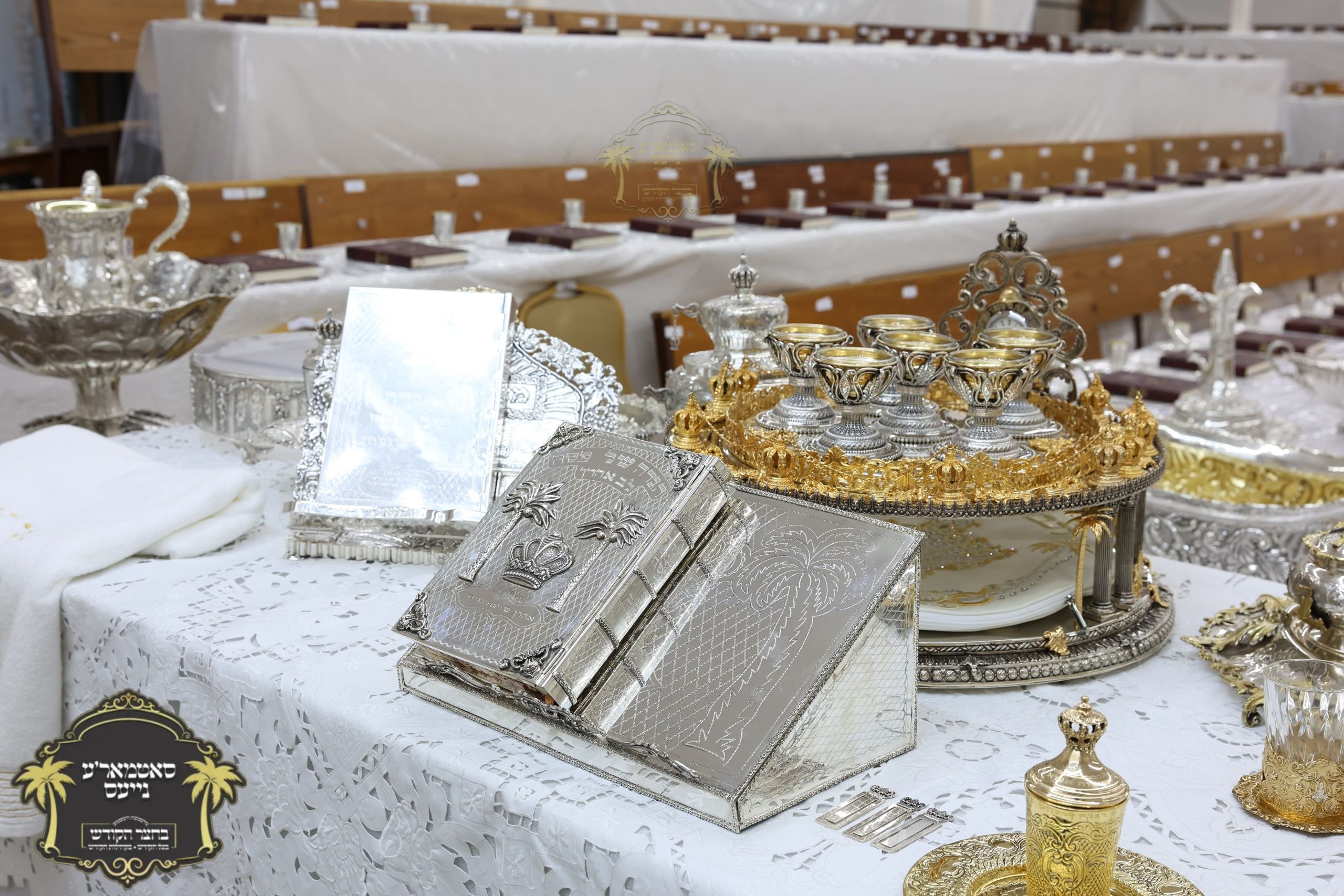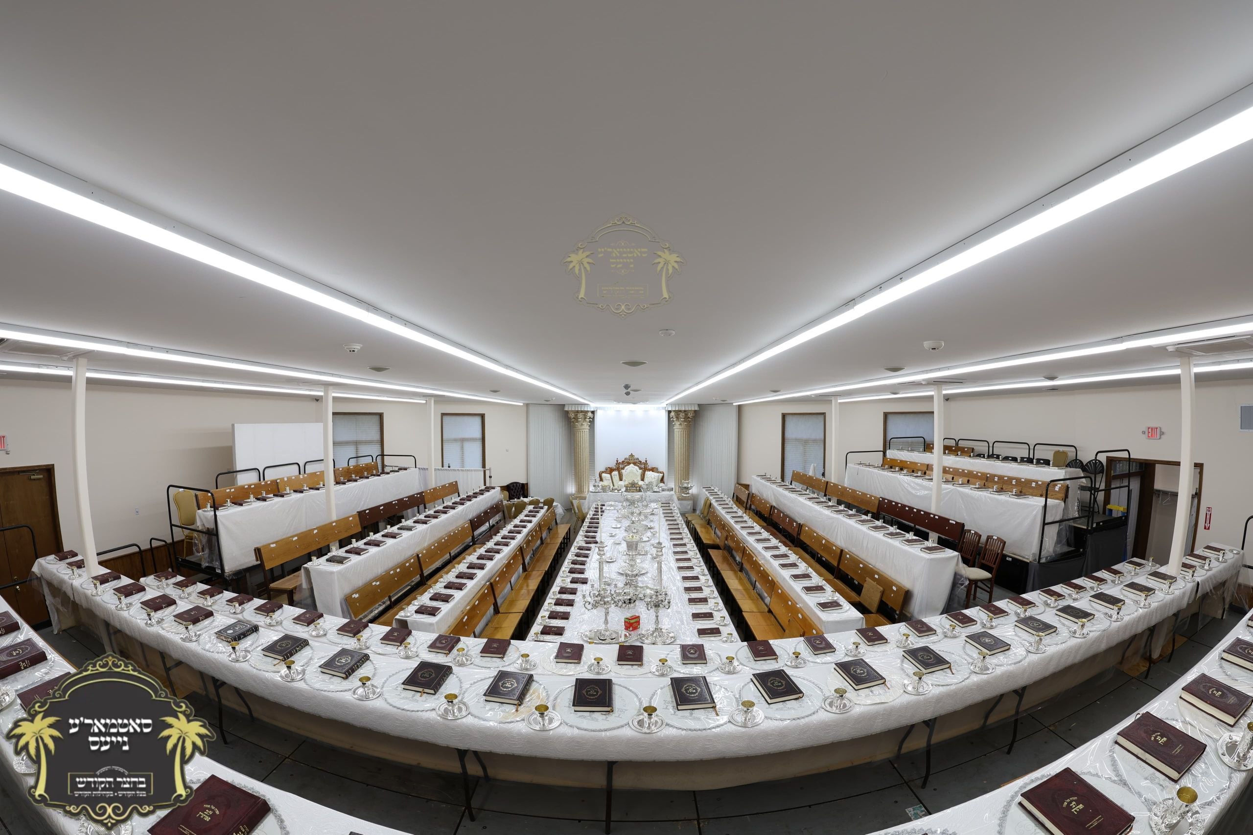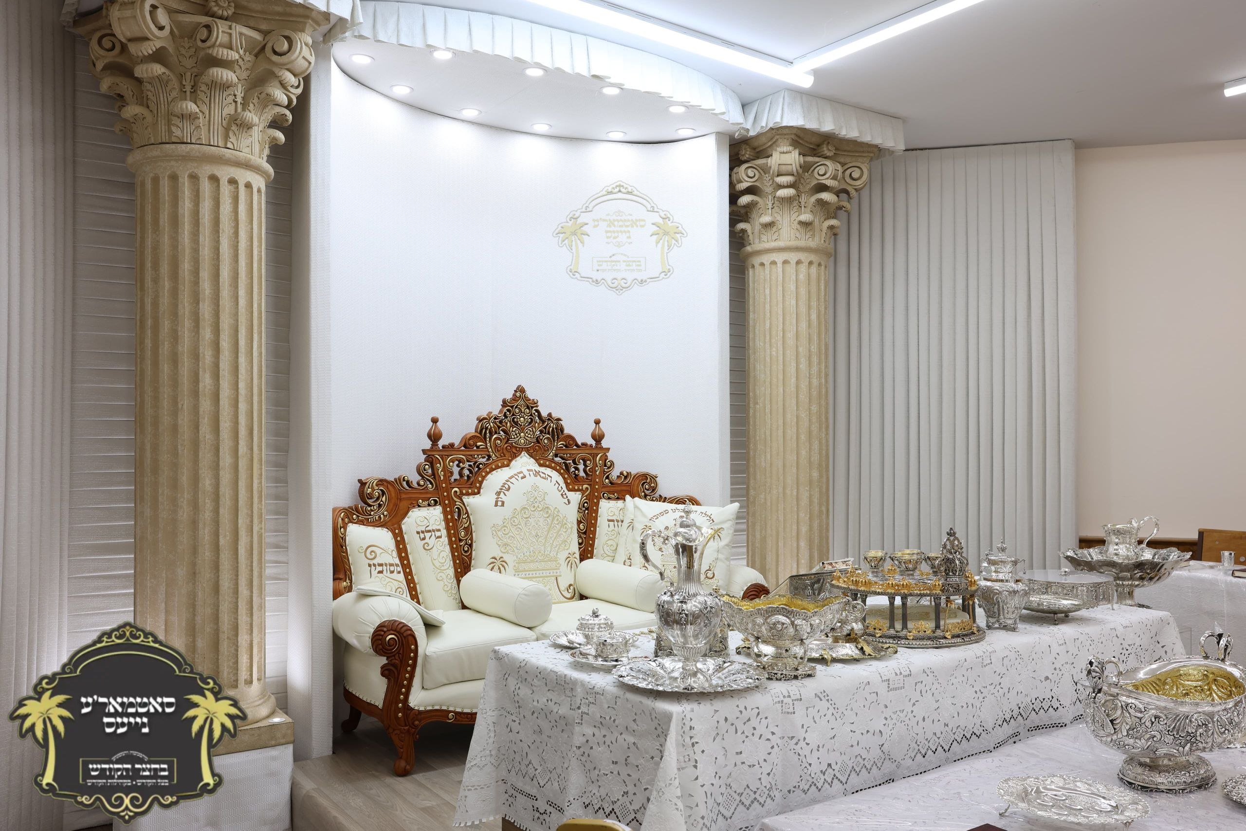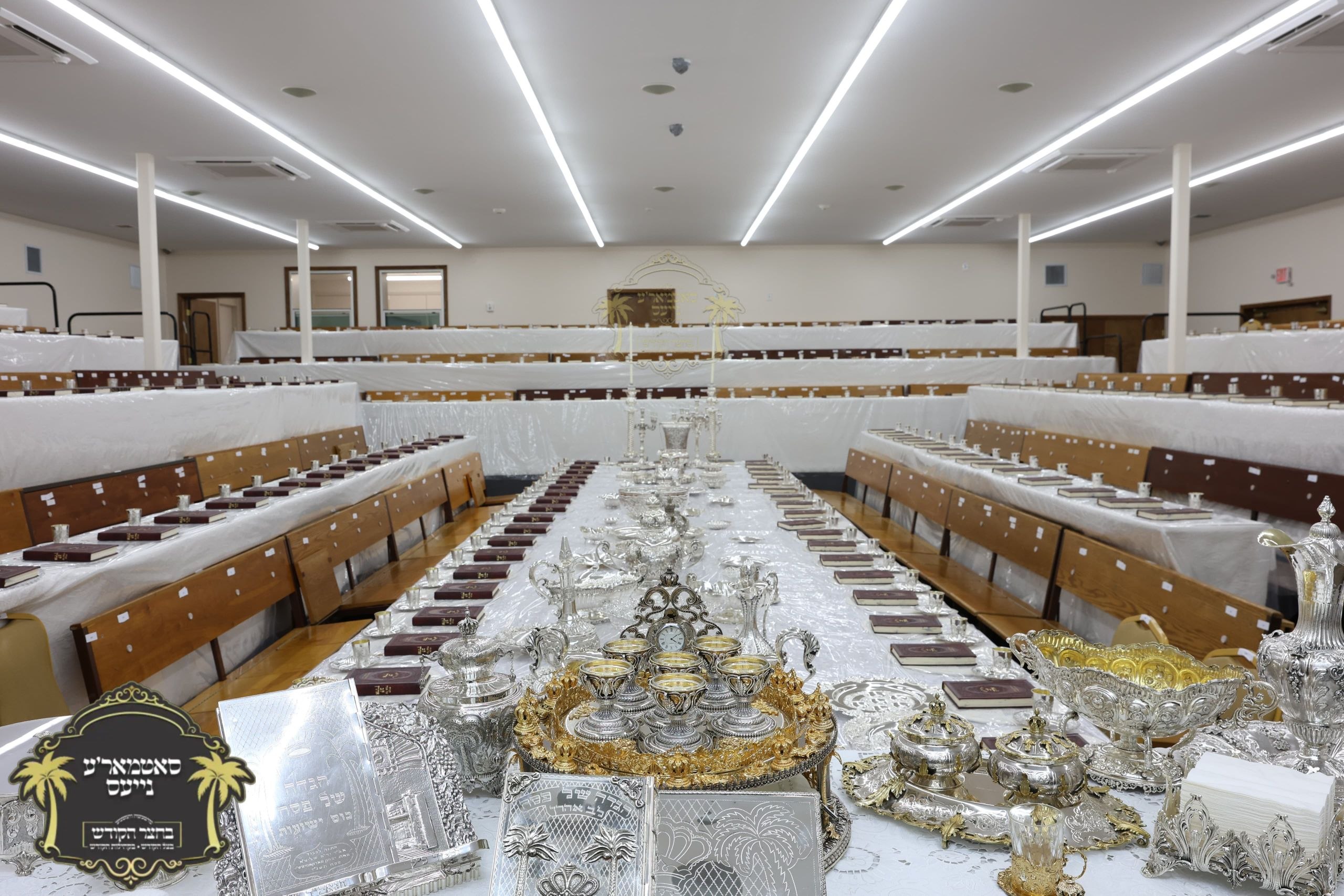מלכות'דיגע סדר טיש אנגעגרייט אינעם זאל בביתו נאוה קודש ווי רבינו שליט"א וועט פראווענען די ליכטיגע סדרים אינאיינעם מיט די הונדערטער חתנים תלמידי ישיבתינו הק'. ~🌴~