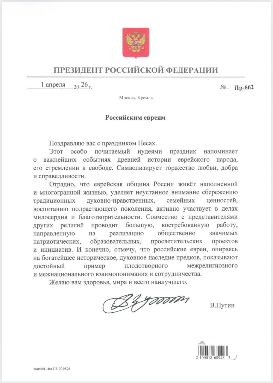 דער רוסישער פרעזידענט וולאדימיר פוטין האט אפגעשיקט א שיינע בריוו לכבוד פסח פארן הויפט רב הגר"ב לאזאר שליט"א, וואו ער באצייכנט דעם יום טוב אלס א סימבאל פון "זיג, אחדות און גערעכטיגקייט." אין זיין בריוו לויבט דער פרעזידענט די אידישע קהילה אין רוסלאנד פארן היטן די מסורה און פאר זייערע אקטיוויטעטן אין חינוך און חסד, באטאָנענדיג אז די אידן דינען אלס א דוגמא פון פרידליכע לעבן צווישן אנדערע פעלקער. די בריוו וועט געלייענט ווערן היינט נאכט ביים צענטראלן סדר אין מאסקווע, אינדערצייט וואס טויזנטער אידן איבער'ן לאנד גרייטן זיך צו פראווען דעם חג החירות מיט די הילף פון די שלוחים.אידישער ווינקל *סטאטוס*:https://wa.me/13473456278?text=Joinאידישער ווינקל *גרופע*:https://chat.whatsapp.com/BN4IyLfXAN92HpIy00tQ1Q