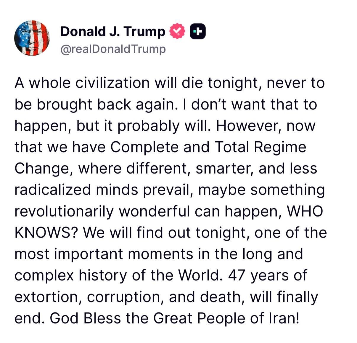 פרעזידענט טראמפ: "א גאנצע ציוויליזאציע וועט שטארבן היינט נאכט."אידישער ווינקל *סטאטוס*:https://wa.me/13473456278?text=Joinאידישער ווינקל *גרופע*:https://chat.whatsapp.com/BN4IyLfXAN92HpIy00tQ1Q