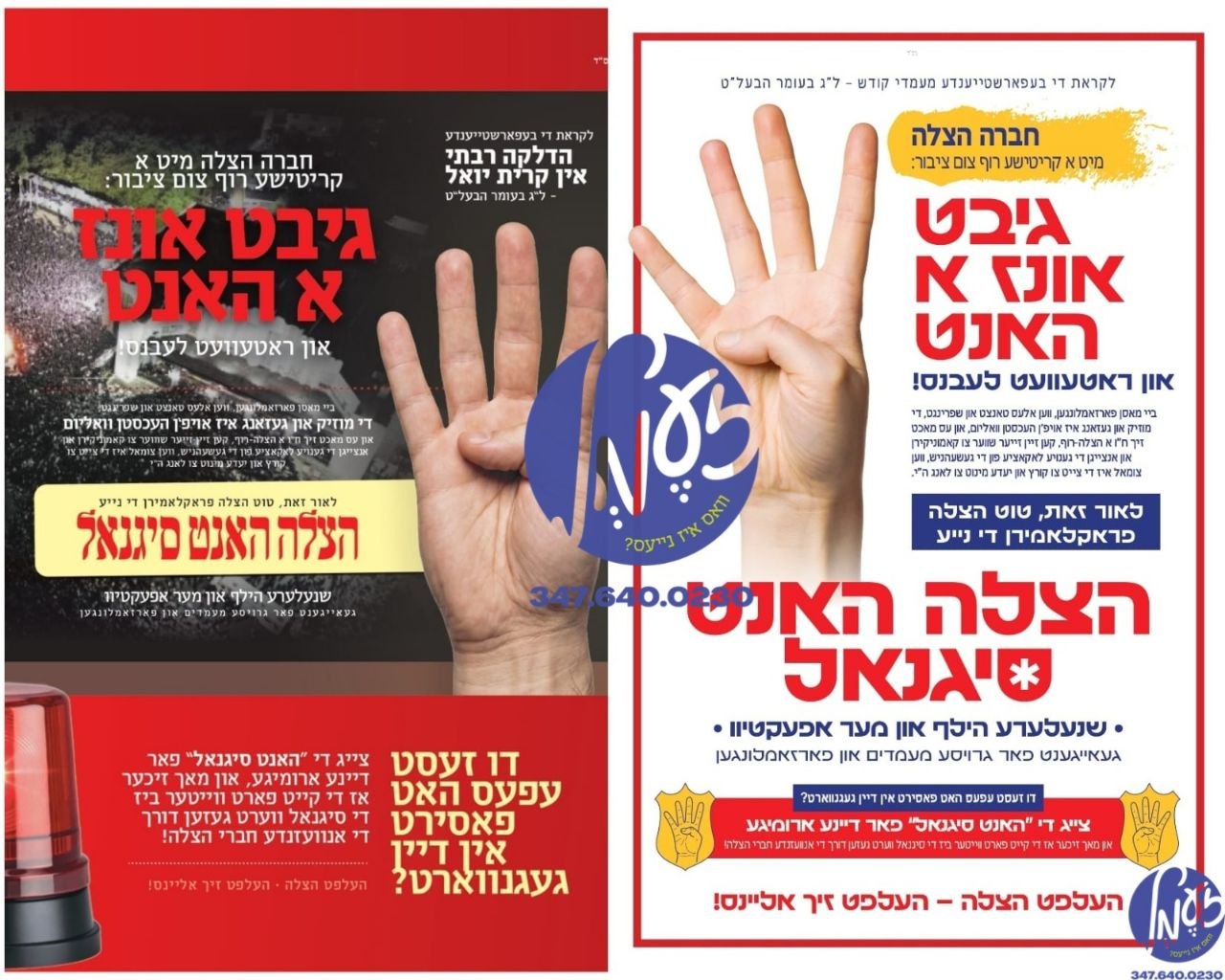 ווי מיר האבן פריער באריכטעט, אצינד שטייענדיג לקראת די גרויסע הדלקות ומעמדי קודש ל"ג בעומר, איז חברה הצלה ערשינען מיט אפיציעלע מעלדונגען צו צייגן דער "פיר פינגער - האנט סיגנאל", ווען עס מאכט זיך אן עמערזשנסי און יעדע סעקונדע איז קריטיש, זייענדיג די שנעלסטער וועג אנצוקומען באצייטנס.