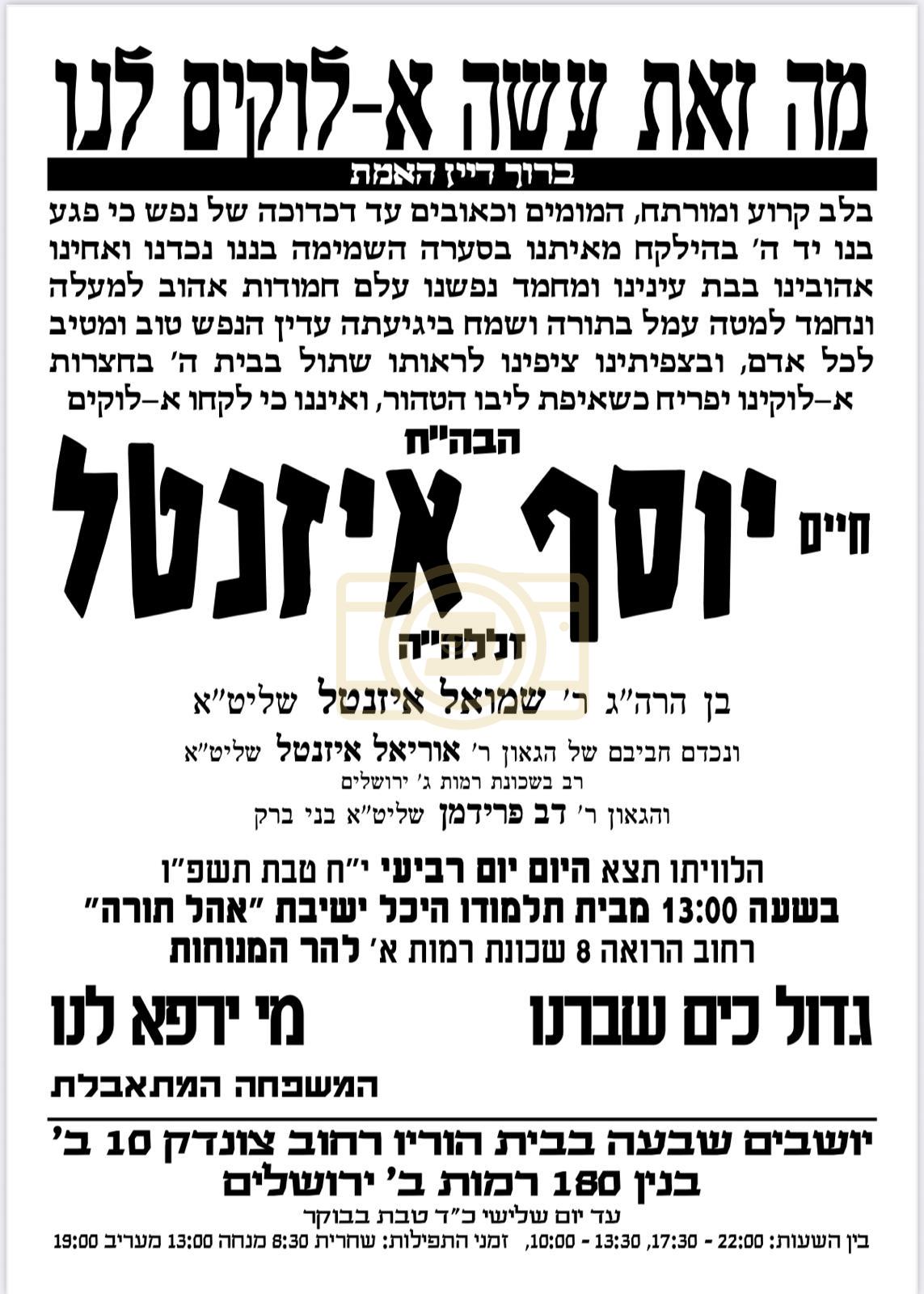 לויה פון הבחור יוסף אייזנטאל הי"ד וואס איז נעכטן אומגעקומען ביי די עצרת קעגן גזירת הגיוס