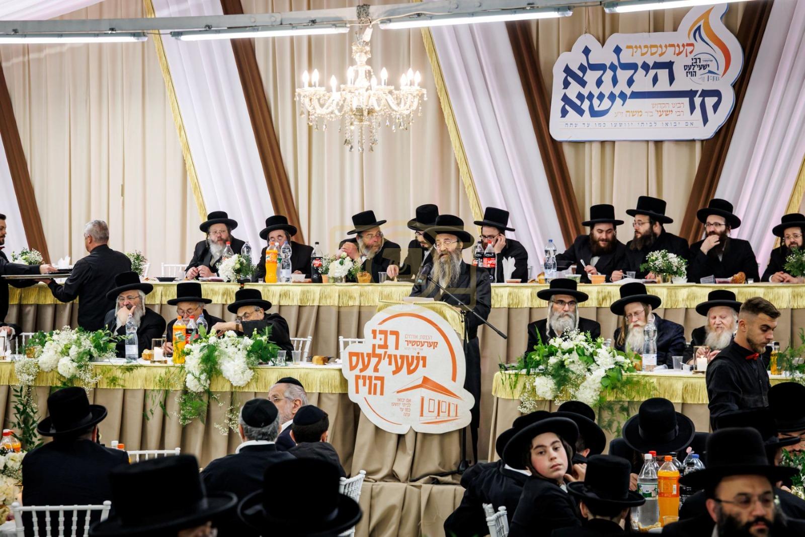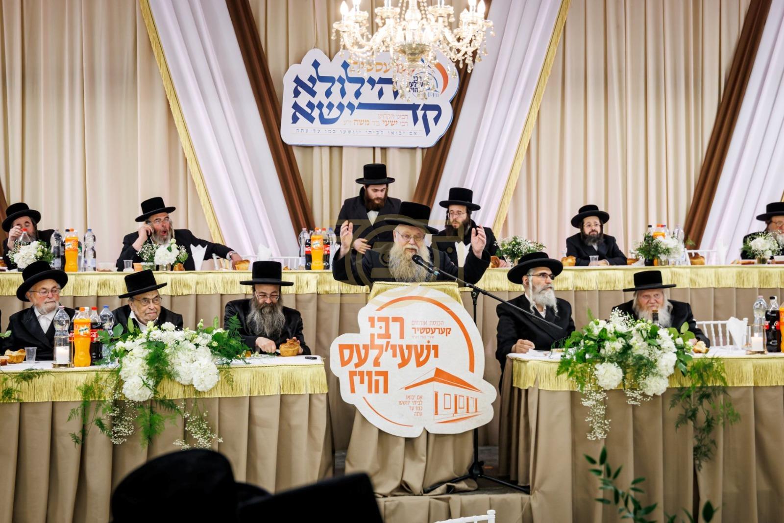 ערשטע בילדער: תפילת מעריב אין די נייע גיגאנטישע בית המדרש פון הרה"ק ר' ישעי'לע זי"ע. יארצייט סעודה ברוב עם הדרת מלך אין אהל גאלדבערגער דורך די אייניקלעך פונעם צדיק, פון 'רבי ישעי'לעס הויז' הכנסת אורחים. די מאסן געווירבל אין קערעסטיר בליל ההילולא.