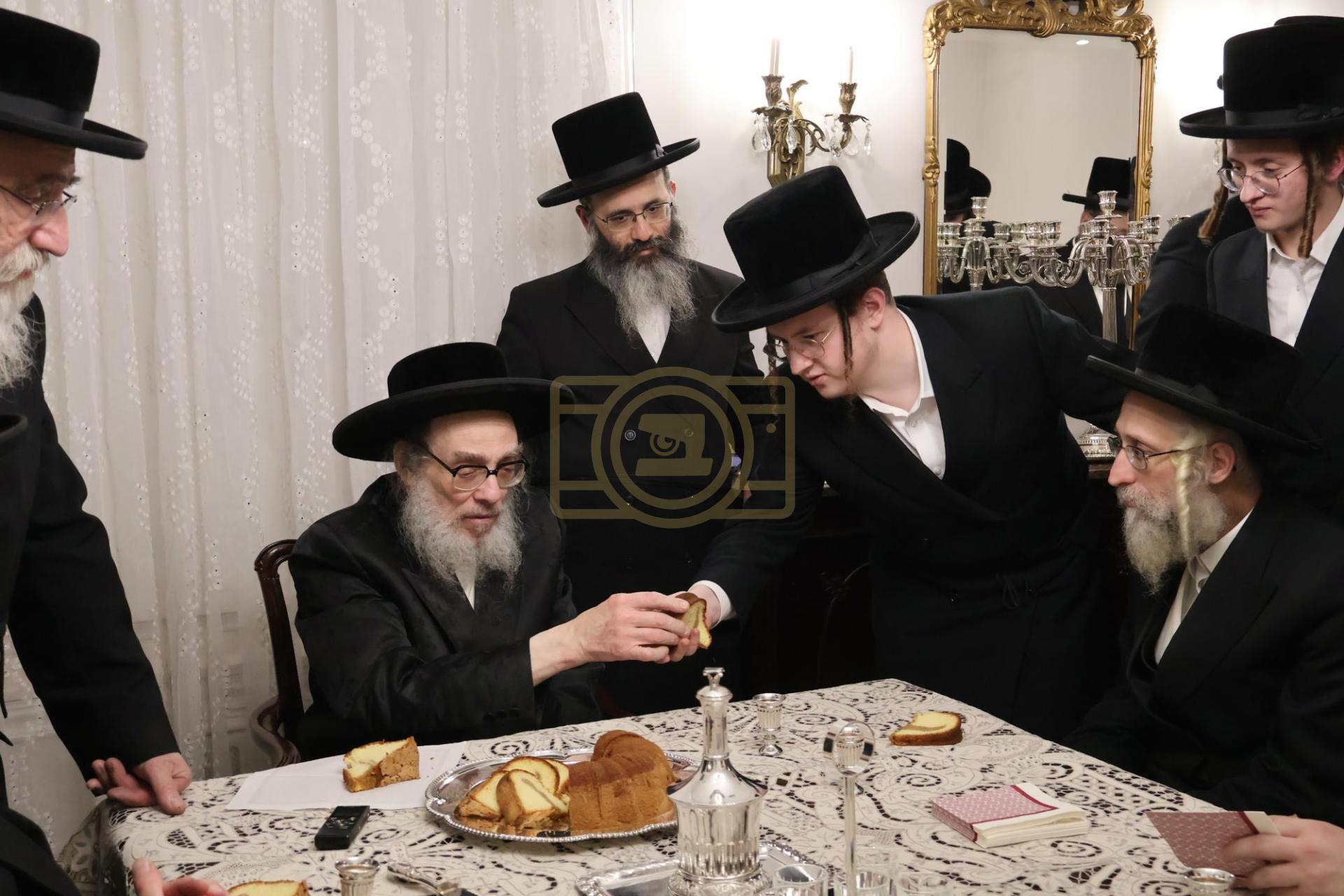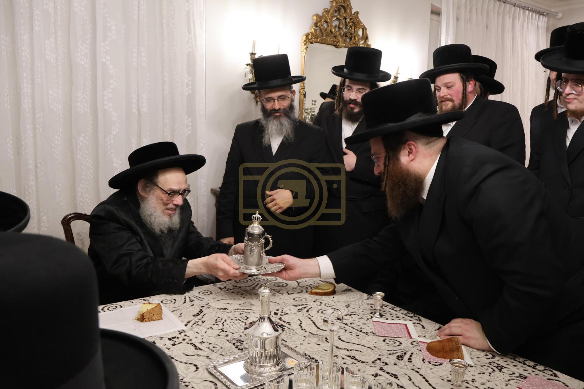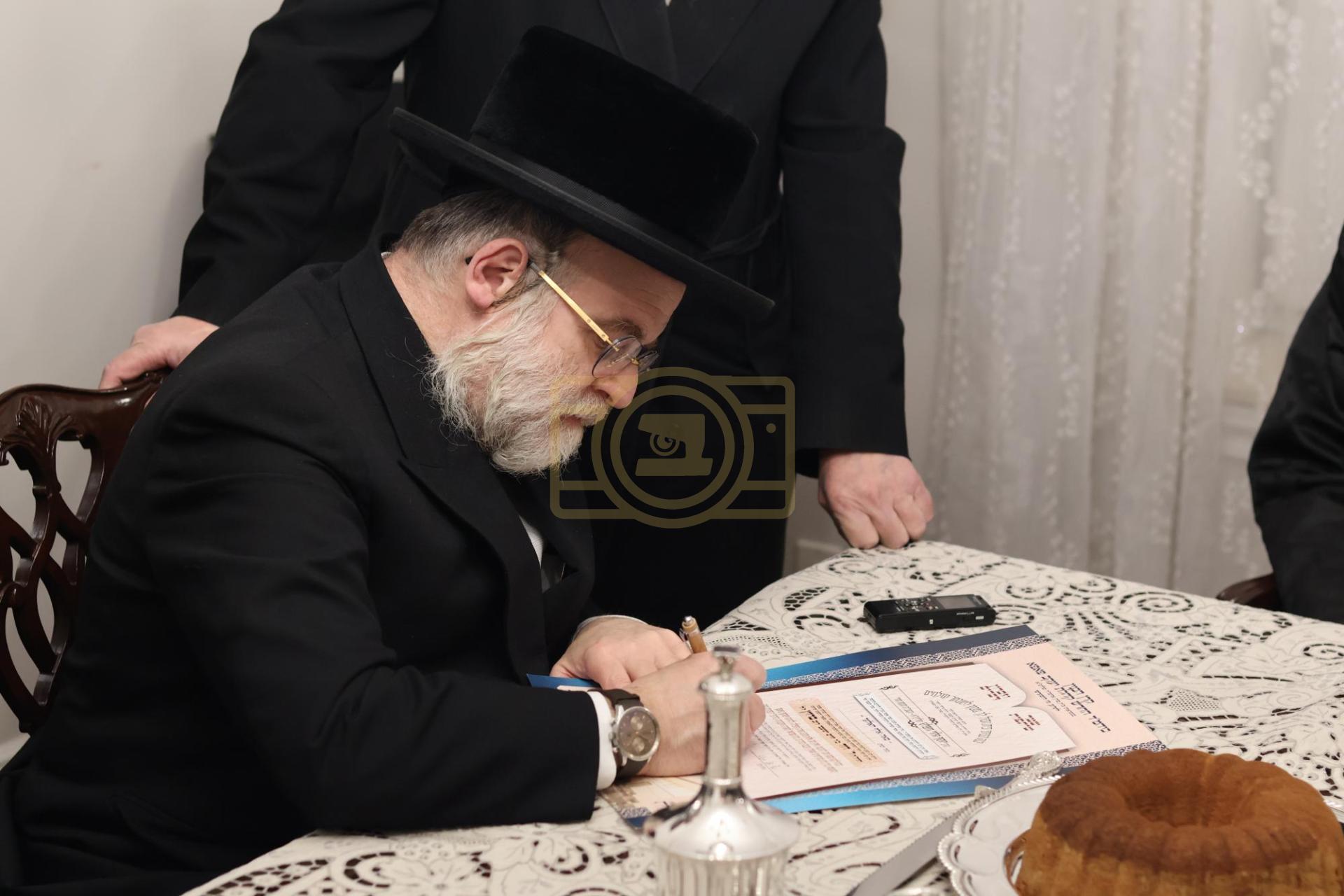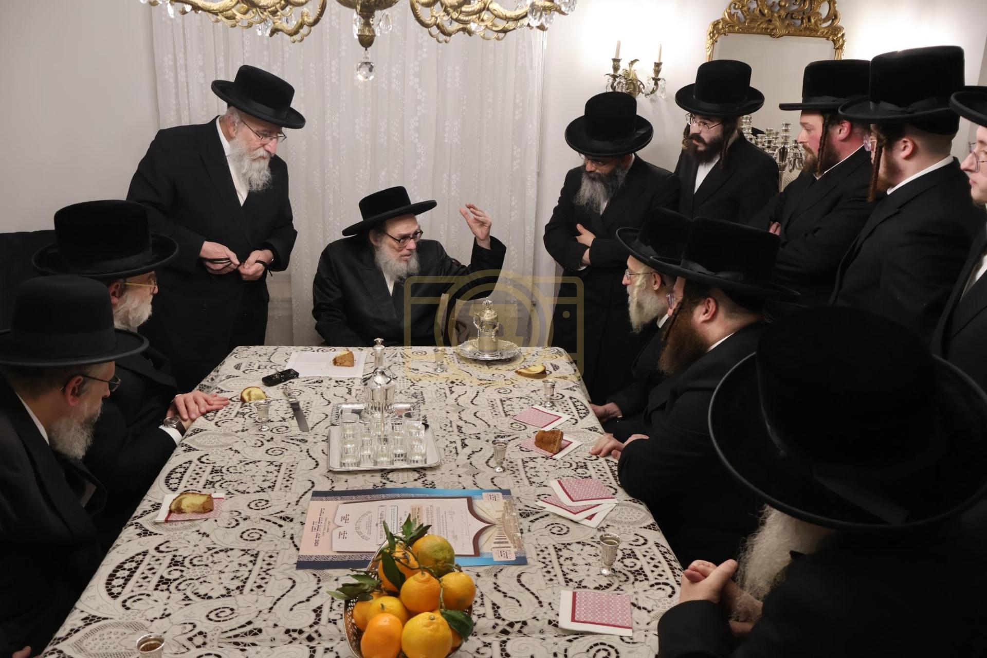 מעמד חתימת שטרות ולחיים בבית הרב יוסף הלוי דופלט שליט''א, לרגל קניית זכות אדיר בביהמ''ד החדש פאפא בלינדען, לע''נ חותנו היקר הרה''ח ר' דוד ברוין ז''ל, בראשות כ''ק האדמו''ר מפאפא שליט''א
