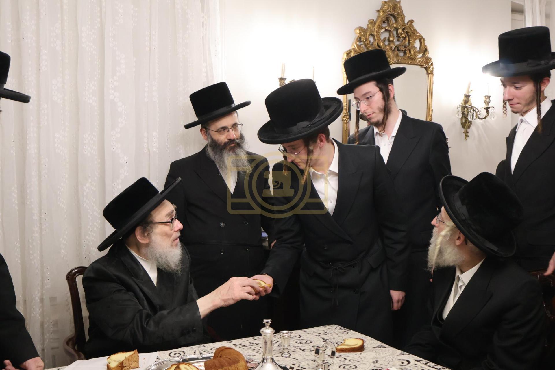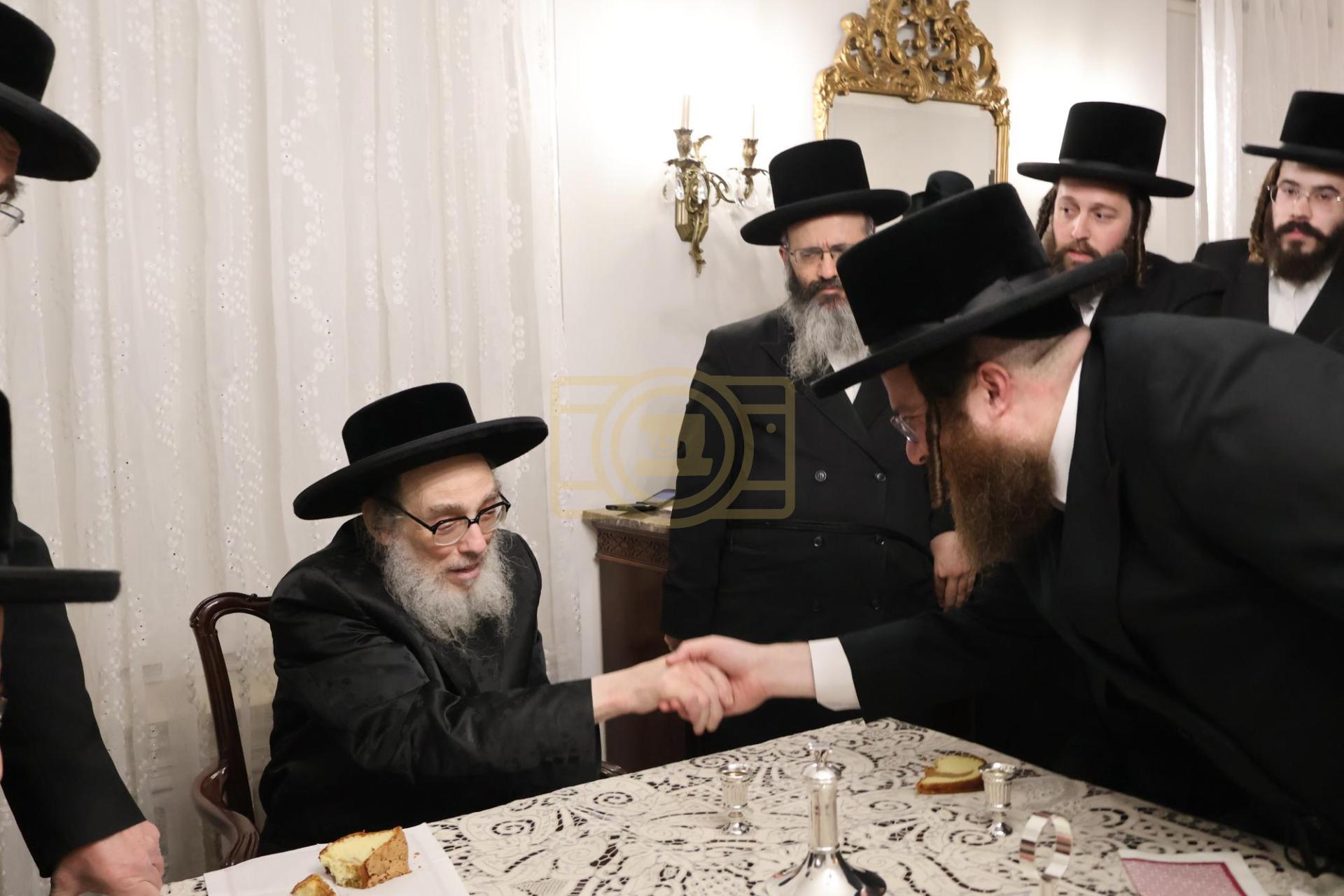מעמד חתימת שטרות ולחיים בבית הרב יוסף הלוי דופלט שליט"א, לרגל קניית זכות אדיר בביהמ"ד החדש פאפא בלינדען, לע"נ חותנו היקר הרה"ח ר' דוד ברוין ז"ל, בראשות כ"ק האדמו"ר מפאפא שליט"א