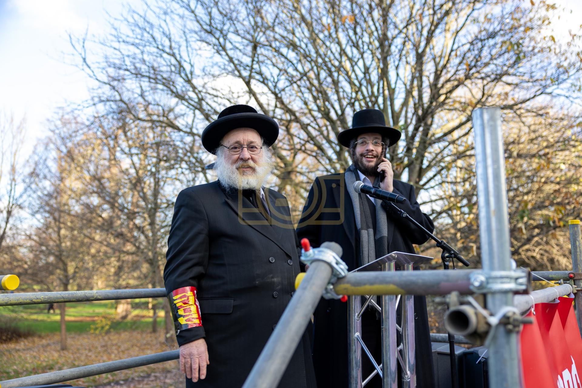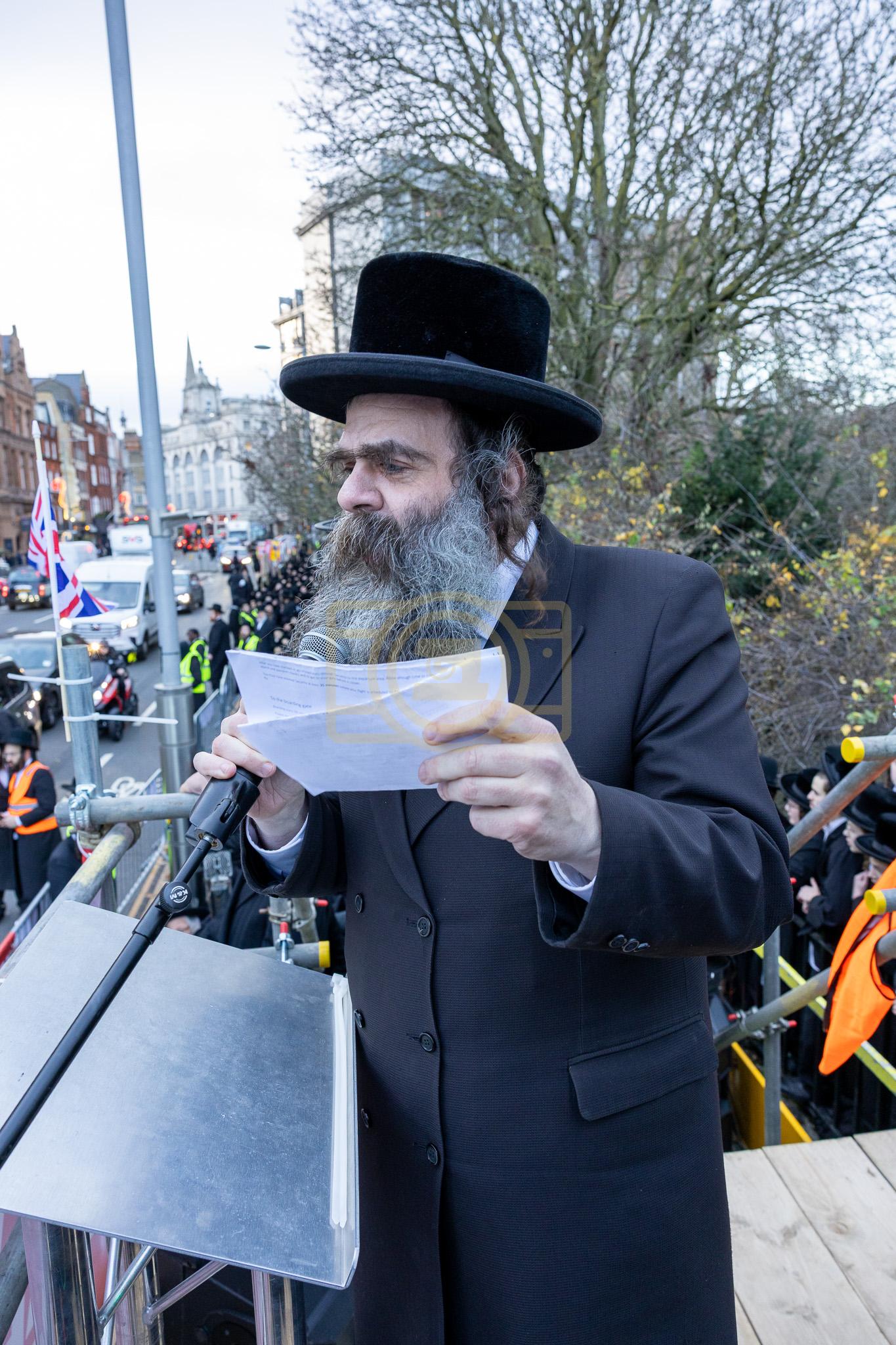 עס האט אויפגעטרעטן הגה"צ ר' חיים פנחס מיללער שליט"א רב חסידי טשערנאביל, און הרה"ג ר' יעקב מארמארשטיין שליט"א רב דקהל אהל משה, וואס האט גערעדט פאר די פרעסע אויף די ענגלישע שפראך. צום שלוס האט מען געזאגט קבלת עול מלכות שמים, פארגעזאגט דורכ'ן זקן רבני ענגלאנד, הגה"צ ר' שלום פריעדמאן שליט"א סגן אב"ד לאנדאן.