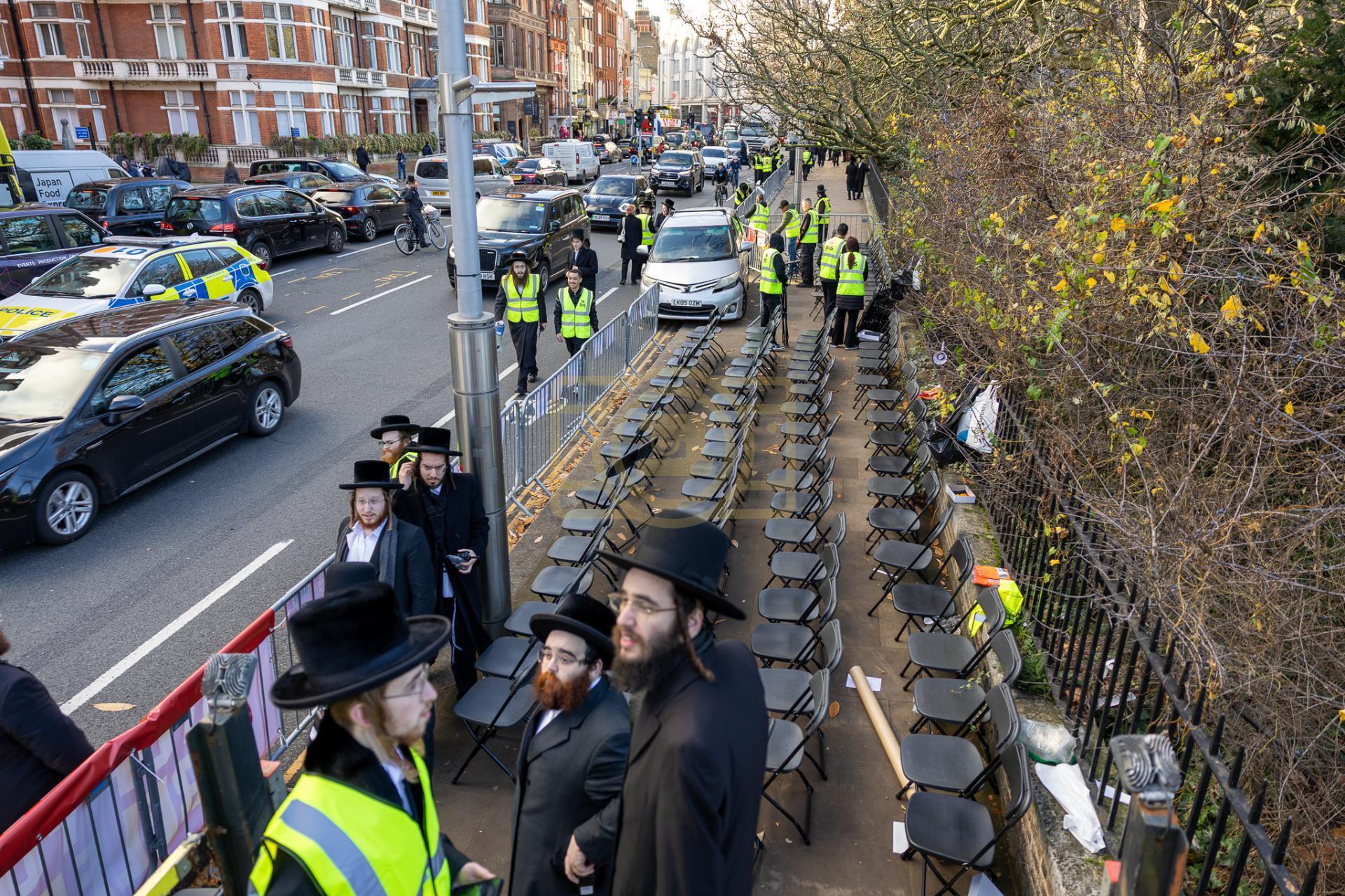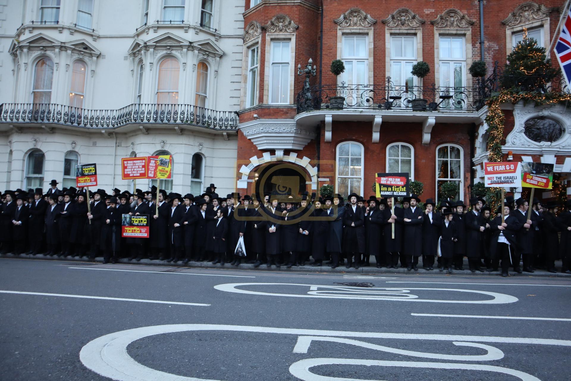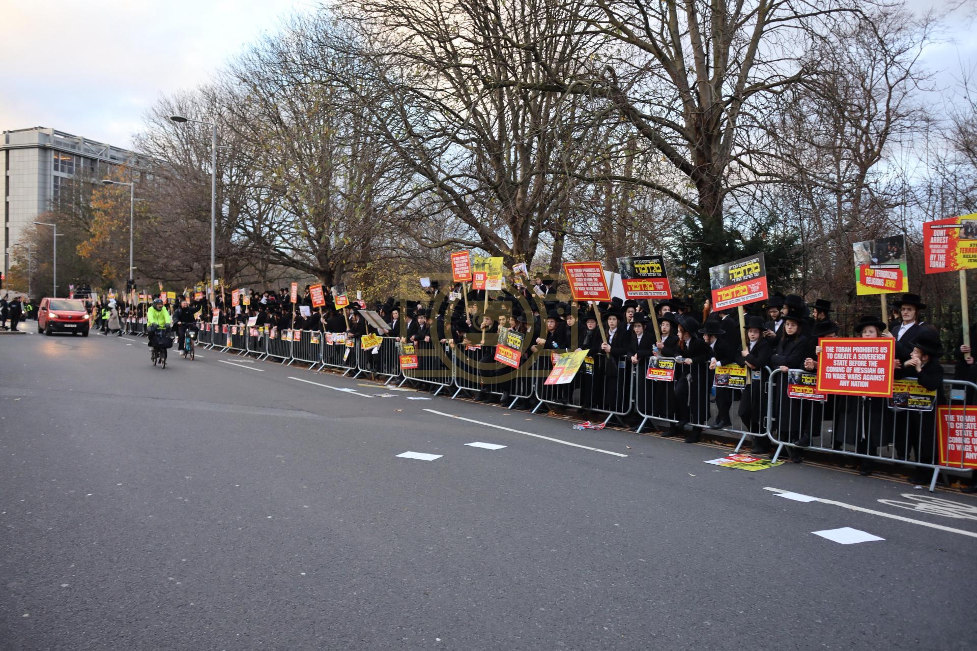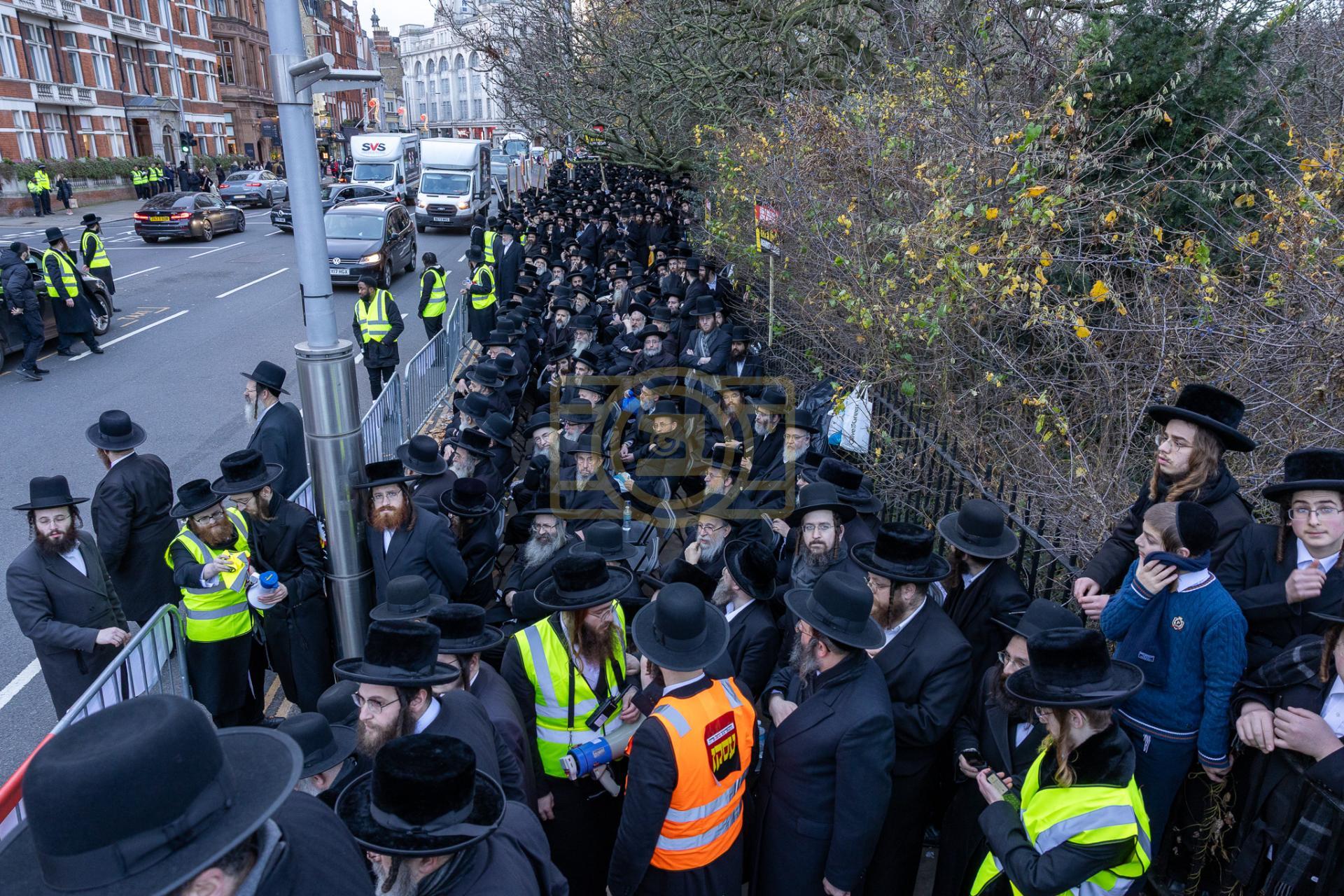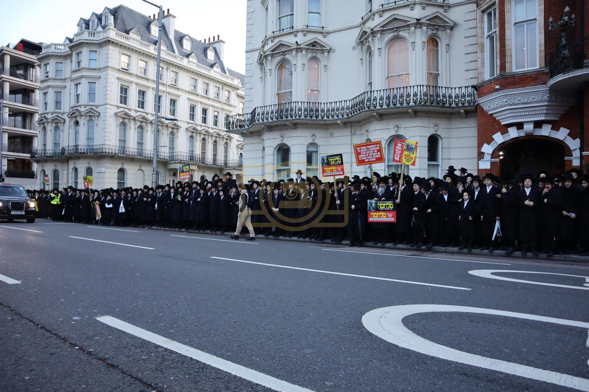 די גאסן פארנט פון די מדינת ישראל קאנסולאט אין לאנדאן סיטי, לענגאויס די פארנומענע קענזינגטאן גאס, איז שווארץ געווארן פון טויזענטער אידן פון אלע חרדישע געגנטער, א פלאטע פון באסעס האט געברענגט דעם ציבור, און אזוי אויך איז מען געקומען צו פארן מיט פאבליק טראנספארטאציע.