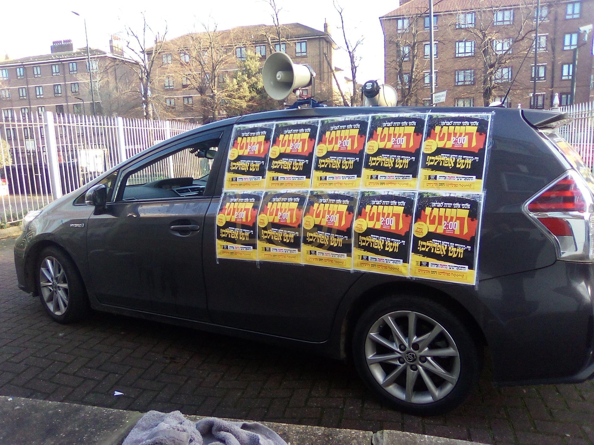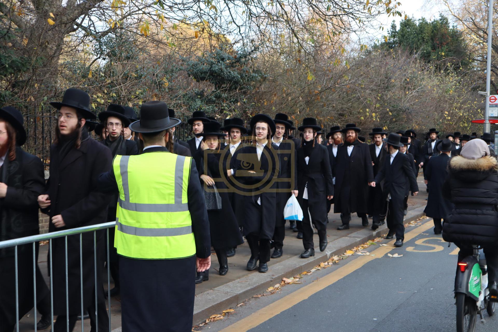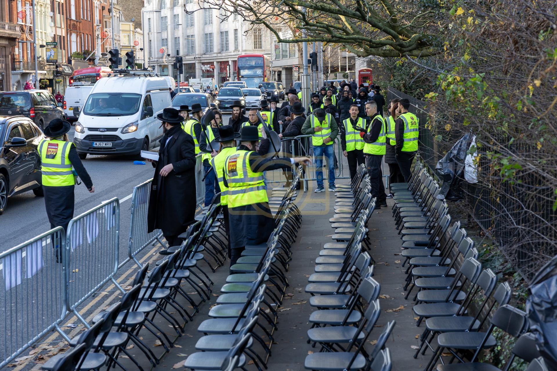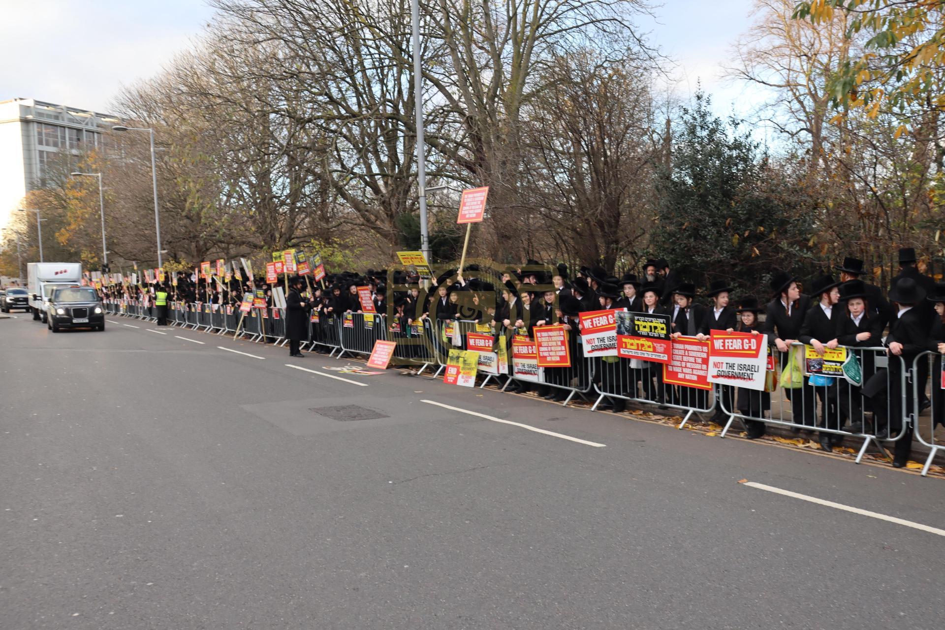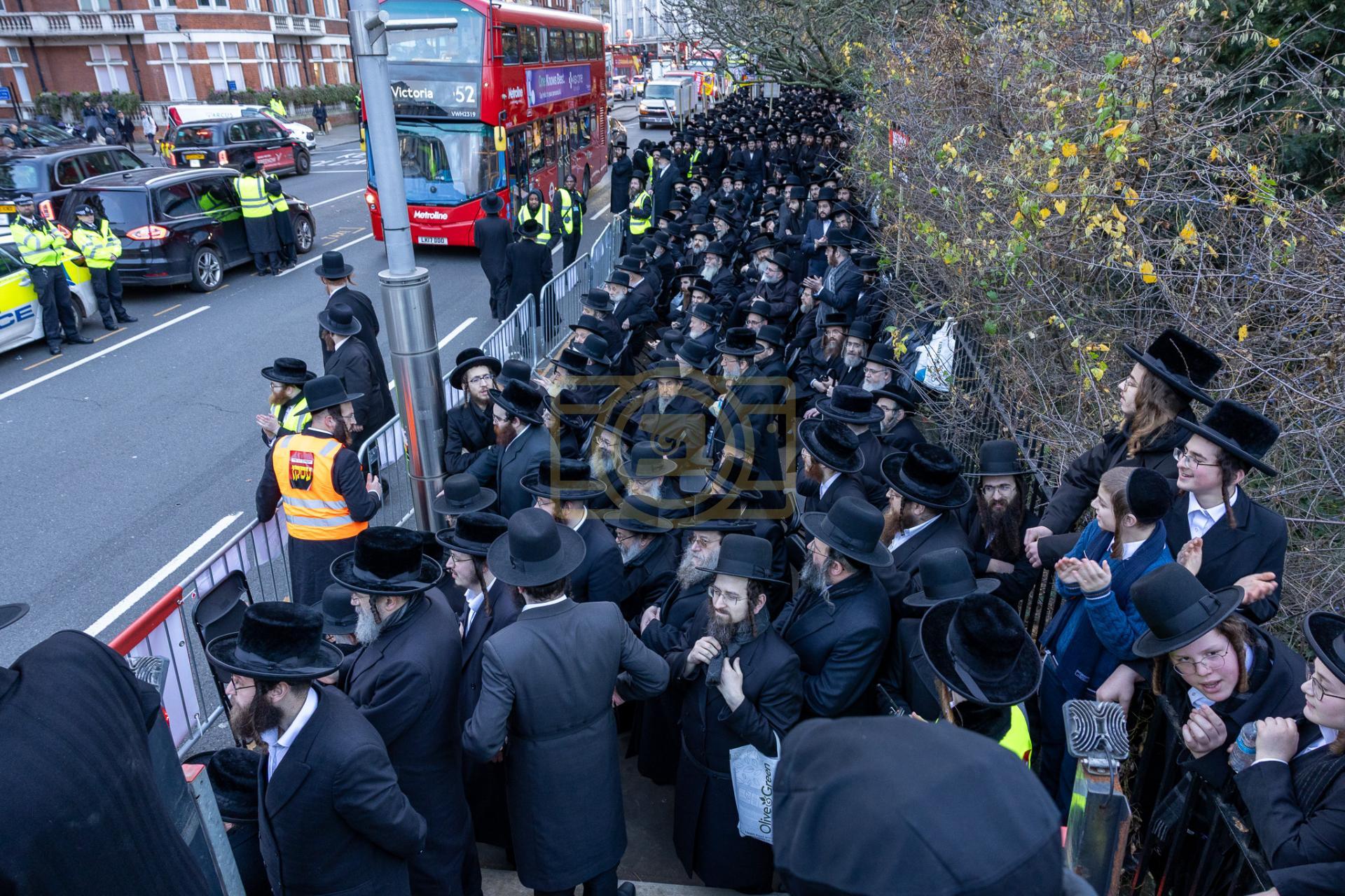 די גאסן פארנט פון די מדינת ישראל קאנסולאט אין לאנדאן סיטי, לענגאויס די פארנומענע קענזינגטאן גאס, איז שווארץ געווארן פון טויזענטער אידן פון אלע חרדישע געגנטער, א פלאטע פון באסעס האט געברענגט דעם ציבור, און אזוי אויך איז מען געקומען צו פארן מיט פאבליק טראנספארטאציע.
