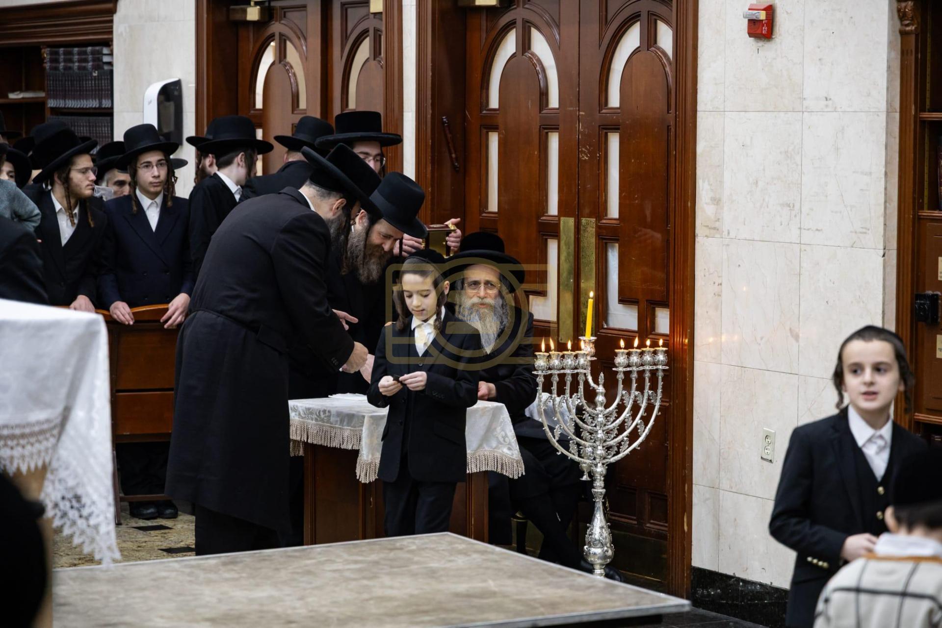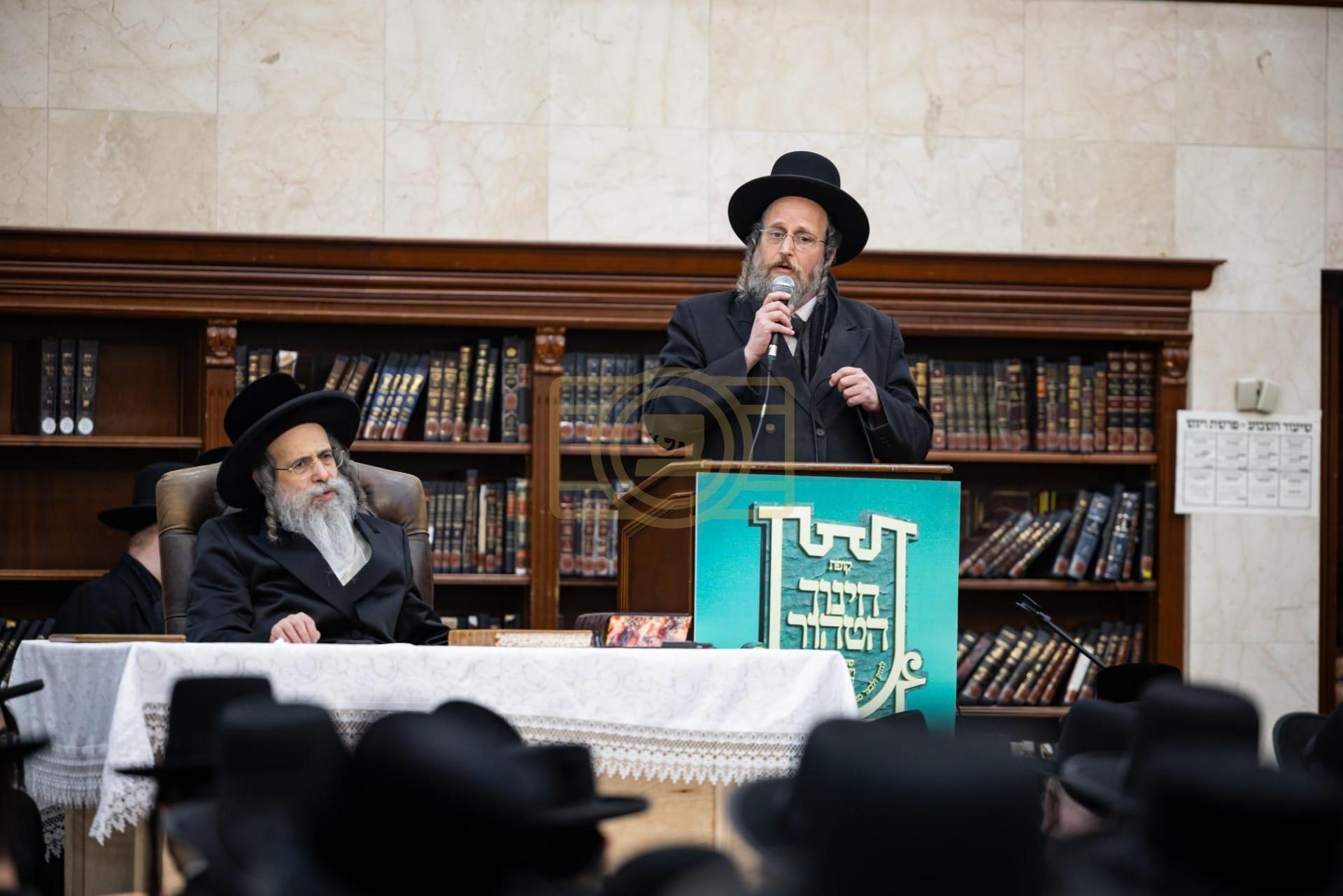 כ"ק גאב"ד מאנסי שליט"א ביי הדלקת נר חנוכה ליל זאת חנוכה בביהמ"ד הגדול, אינאיינעם מיטן מגבית להחזקת קופת חינוך הטהור אפצייכענען'דיג א יאר זינט דער התייסדות הקופה ע"י כ"ק הגאב"ד שליט"א מייסד ונשיא הקופה