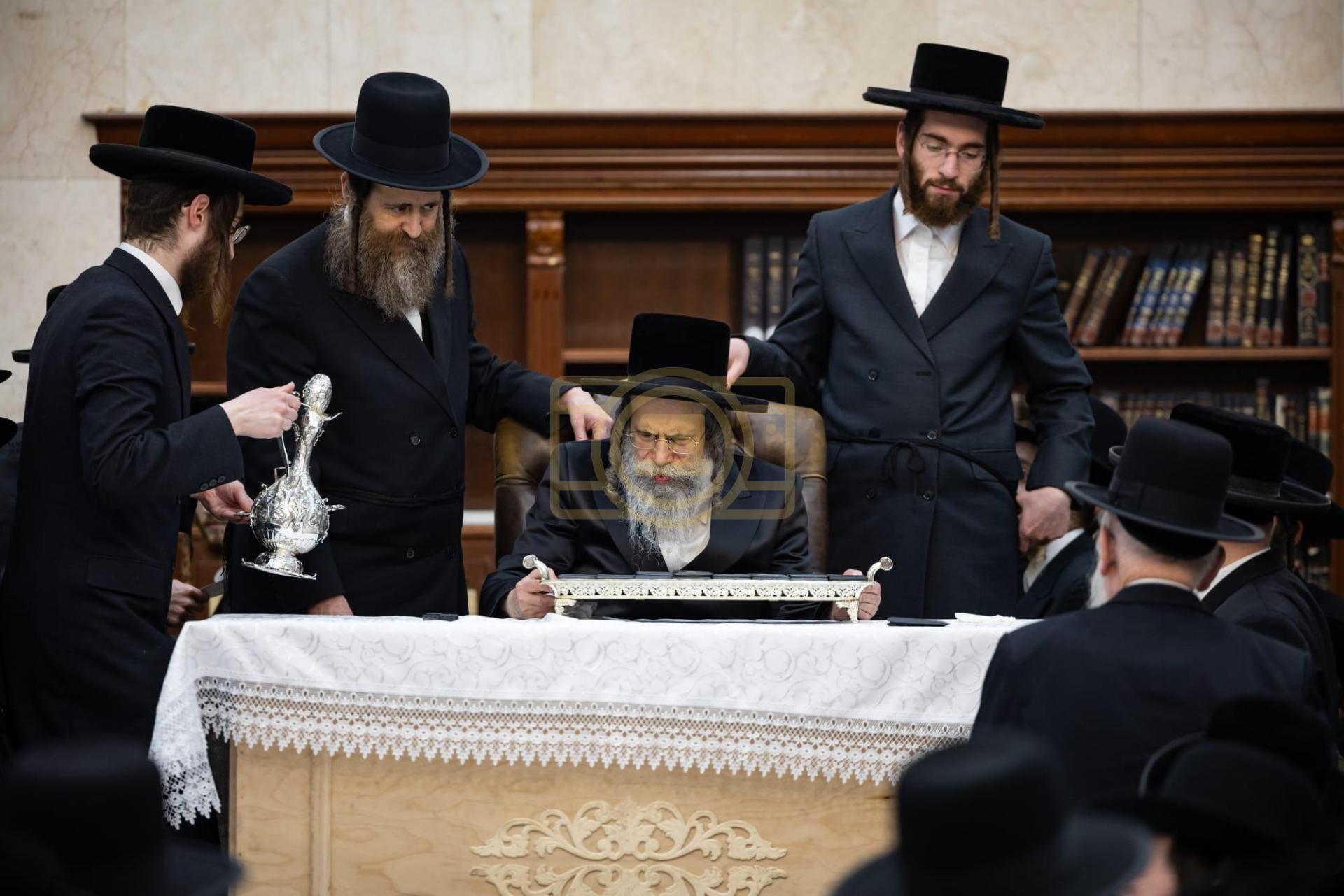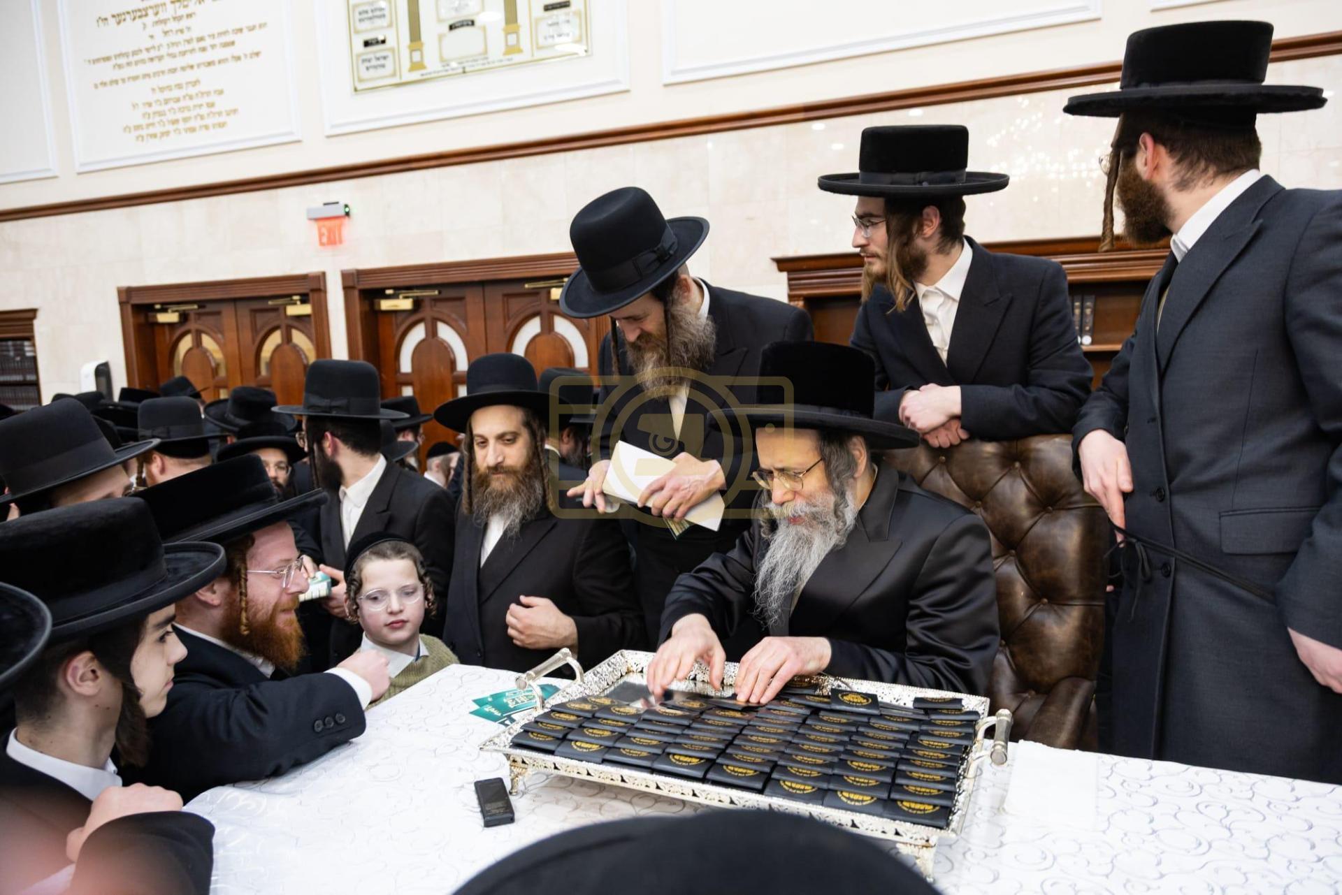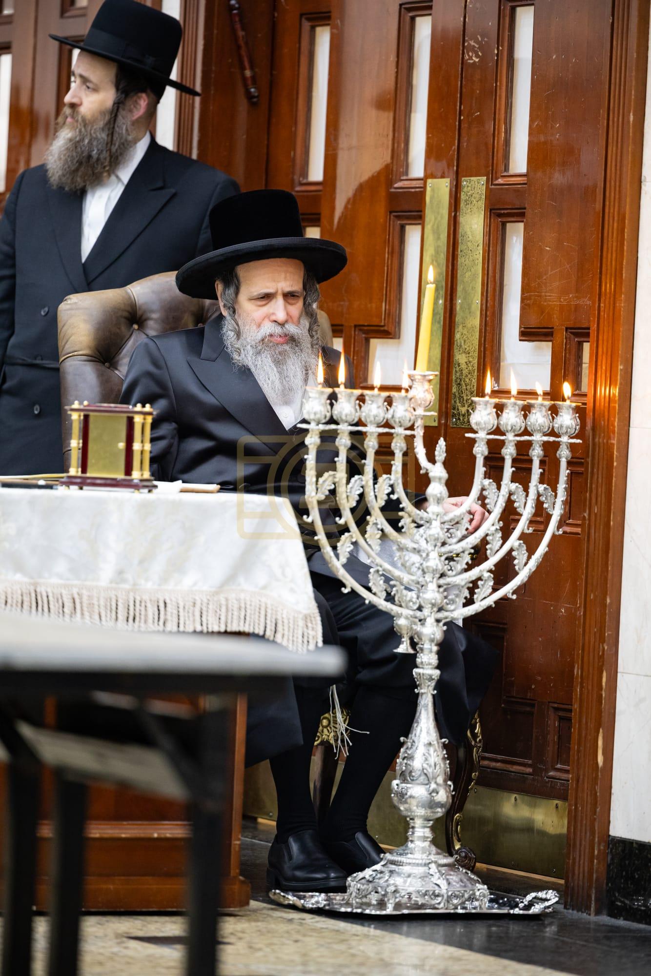 כ"ק מרן גאב"ד סאטמאר שליט"א ביי הדלקת נר חנוכה ליל זאת חנוכה בביהמ"ד הגדול, אינאיינעם מיטן מגבית להחזקת קופת חינוך הטהור אפצייכענען'דיג א יאר זינט דער התייסדות הקופה ע"י כ"ק מרן הגאב"ד שליט"א מייסד ונשיא הקופה.