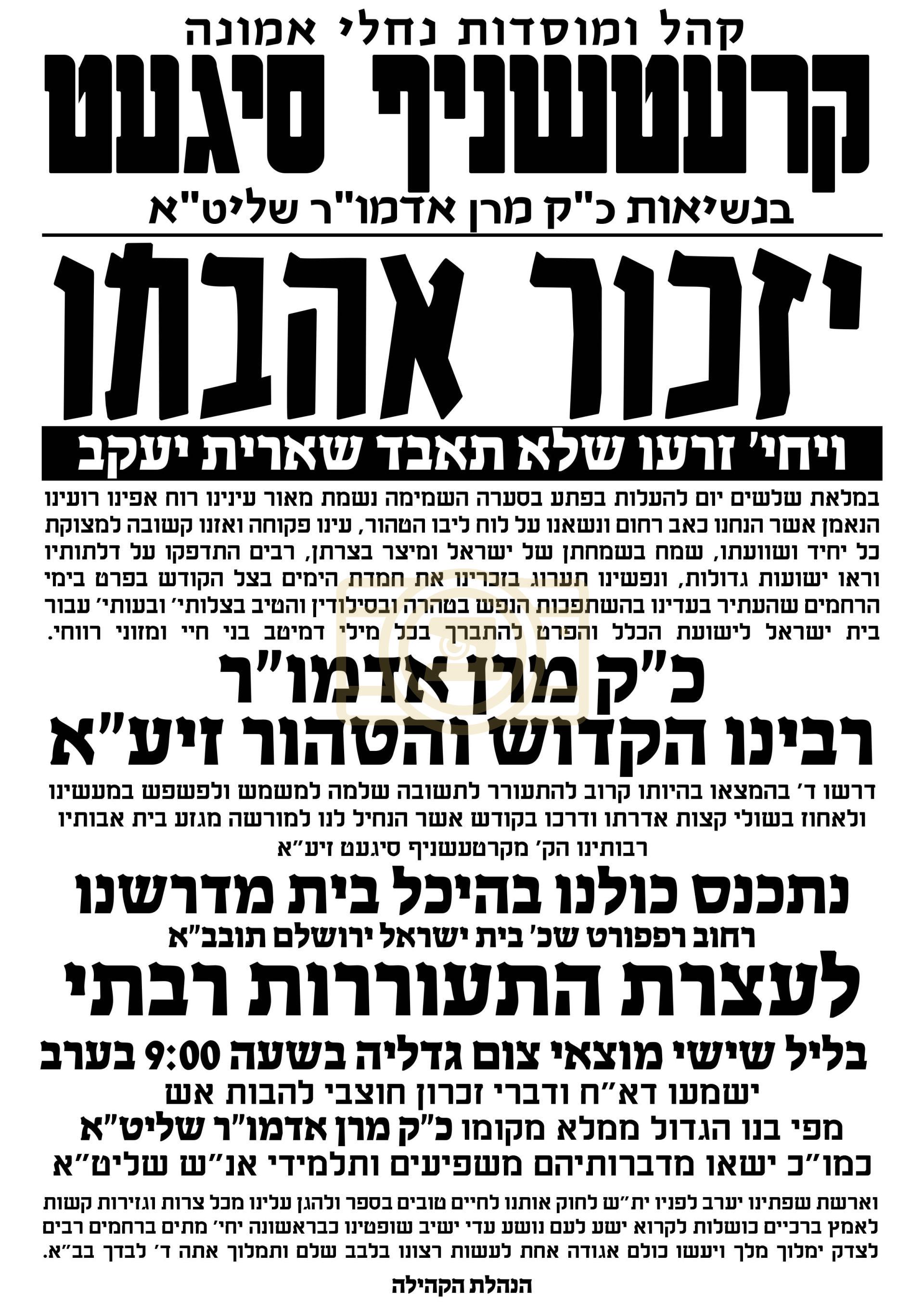 עצרת התעוררות ככלות השלושים להסתלקותו של הרה"ק מקרעטשניף סיגעט זצוק"ל בביהמ"ד קרעטשניף סיגעט