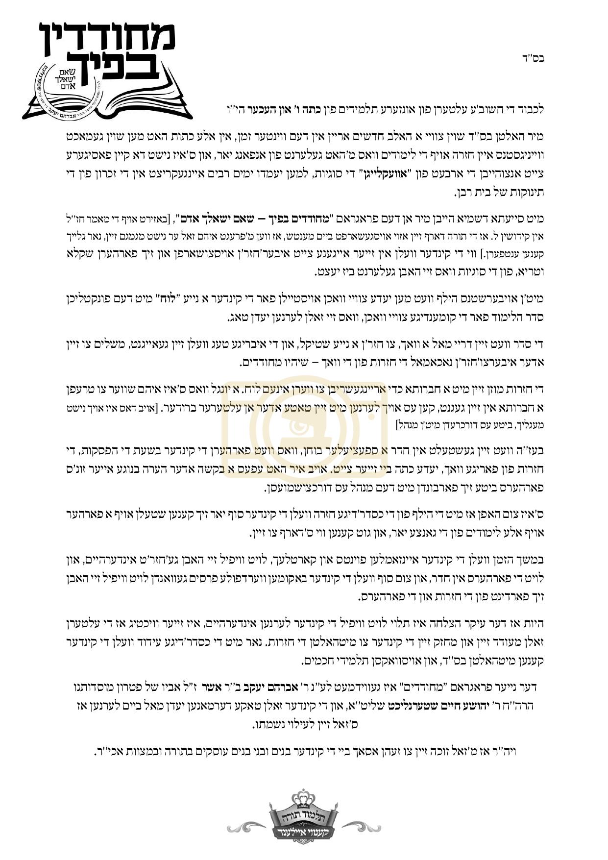 וטריא, פון די סוגיות וואס זיי האבן געלערנט ביז יעצט. דער נייער פראגראם "מחודדים" איז געווידמעט לע''נ ר' אברהם יעקב ב''ר אשר ז"ל אביו של פטרון מוסדותנו