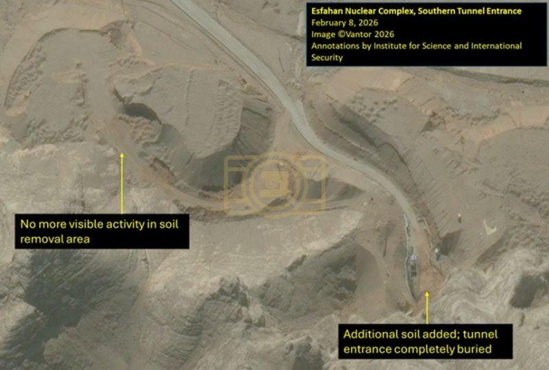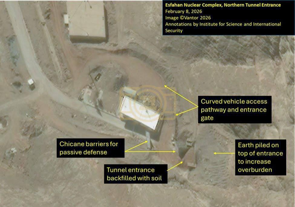 Iran has fully sealed all known entrances to the underground tunnel network at its Esfahan nuclear site, a move widely interpreted as a defensive response to the growing possibility of U.S. or Israeli military action. High-resolution satellite imagery taken on February 8, 2026, shows that all three tunnel entrances at the heavily fortified complex have been buried with soil, effectively concealing access points that were previously visible and active.