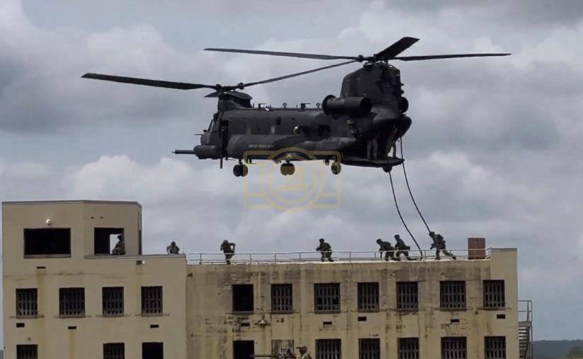 The exercise featured MH-47G Chinook helicopters inserting U.S. Army Rangers and Green Berets onto a heavily defended rooftop target, protected by AH-64 Apache gunships providing overwatch. On the ground, a Special Operations Forces team employed Ground Mobility Vehicles adapted from High Mobility Multipurpose Wheeled Vehicles to secure flanks and control key terrain. The simulated scenario replicated the complexity and intensity of a hostage rescue or high-value target capture in a denied environment.