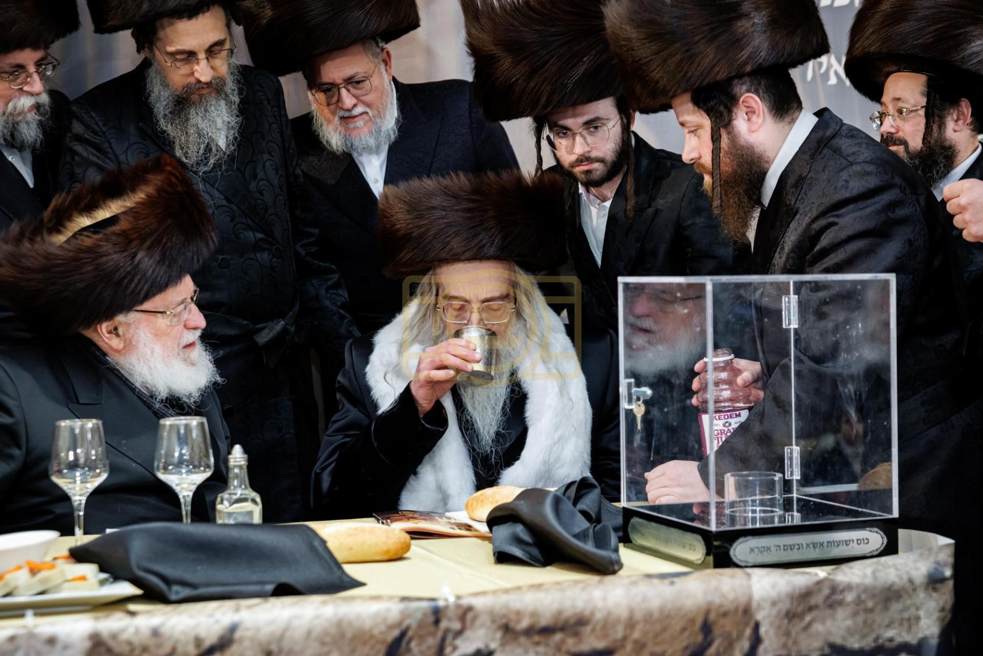 צום שלוס פונעם דיננער איז געווען די דערהויבענע מאמענטן ווען מ'האט פארקויפט די זכות ברכת המזון אויפ'ן הייליגען און היסטארישע בעכער פון קודש הקדשים הרה"ק המגיד ממעזריטש זצוק"ל, וואס איז אריבערגעגאנגען מדור דור און ליגט היינט ביי א חשוב'ע נגיד מגדולי תומכי הכולל וואס האט עס אריבערגעברענגט צום דיננער, די זכות איז פארקויפט געווארן פאר די קלאסאלע סכום פון צעהן טויזענט דאללער און מיטן בענטשען איז מכובד געווארן די בארימטע לאנגיעריגע גזבר הכולל ונעים זמירות ישראל הרה"ח המפורסם ר' אבוש בראדט שליט"א, דער זכות הגבהת הכוס אויפן כוס הישועות האט געקויפט בנש"ק הרבני הנגיד הרב שמואל ישעי' פריעדמאן שליט"א און באלד דערנאך האבן זיך הונדערטער אידן געשטיפט אין די שורות מקבל צו זיין כוס של ברכה מיט א נתינה פון $180 און אן עקסטער זכי' צו קענען טרינקן פונעם הייליגן בעכער דירעקט מיט די השתתפות פון $500 לטובת הכולל.