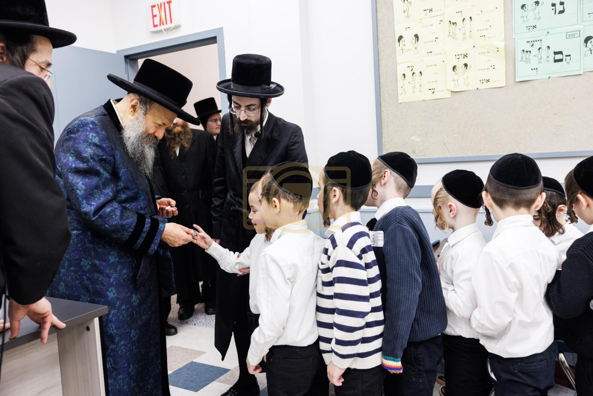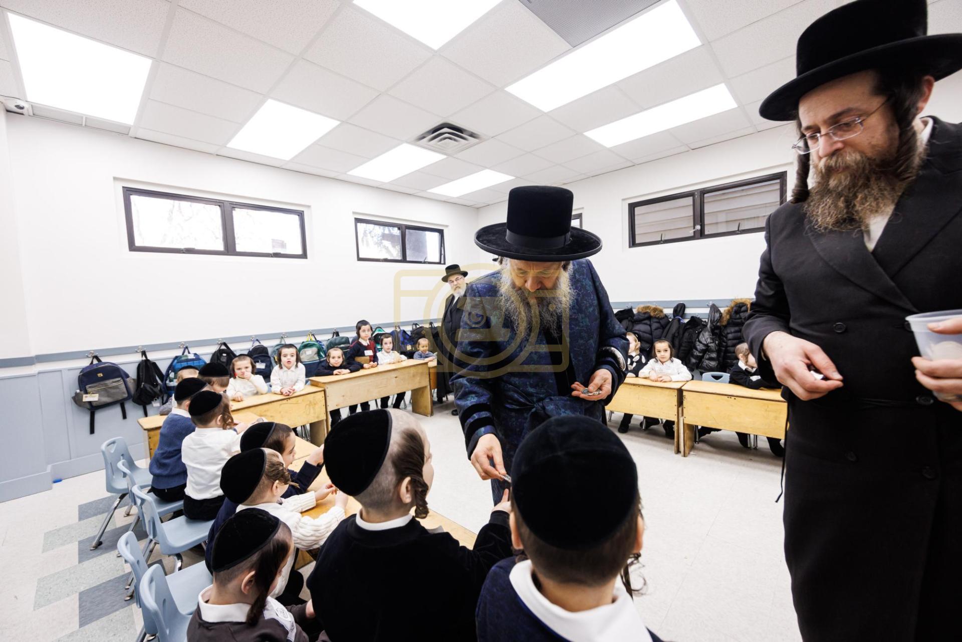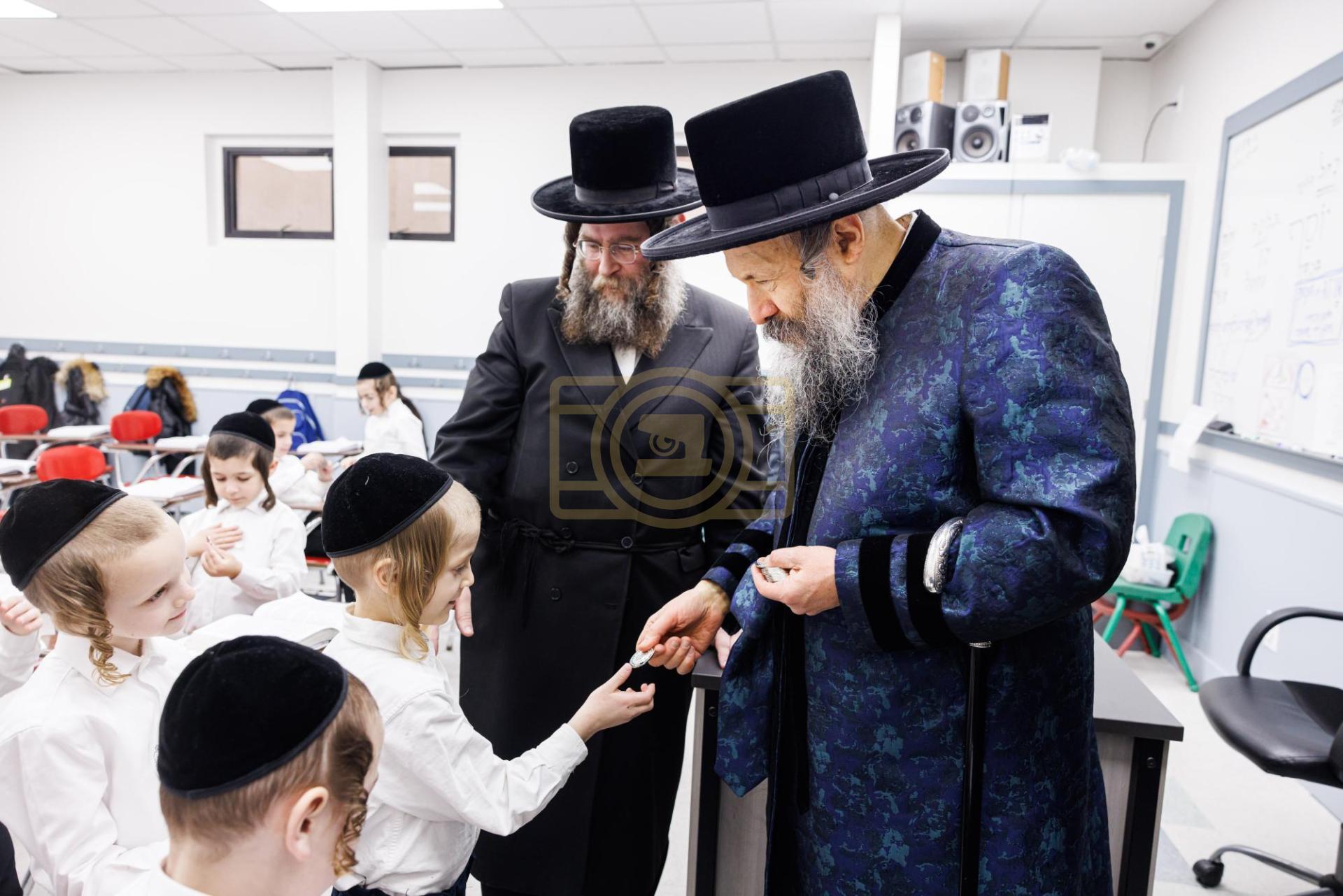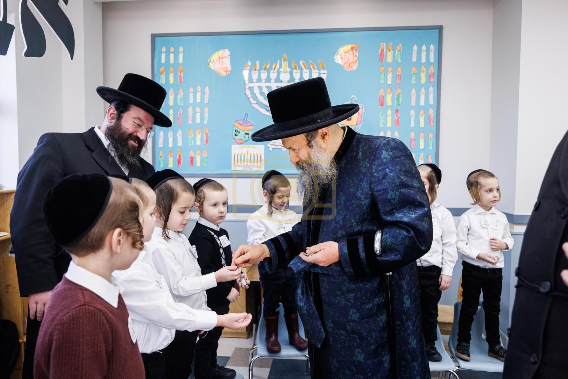 חלוקת חנוכה געלט לתלמידים עד גיל כיתה ב' בבנין הת"ת ברח' 20 ששופץ לאחרונה, וכן קביעת מזוזה ע"י האדמו"ר וע"י הרב יעקב יוסף שטיינמעץ מנכ"ל המוסדות