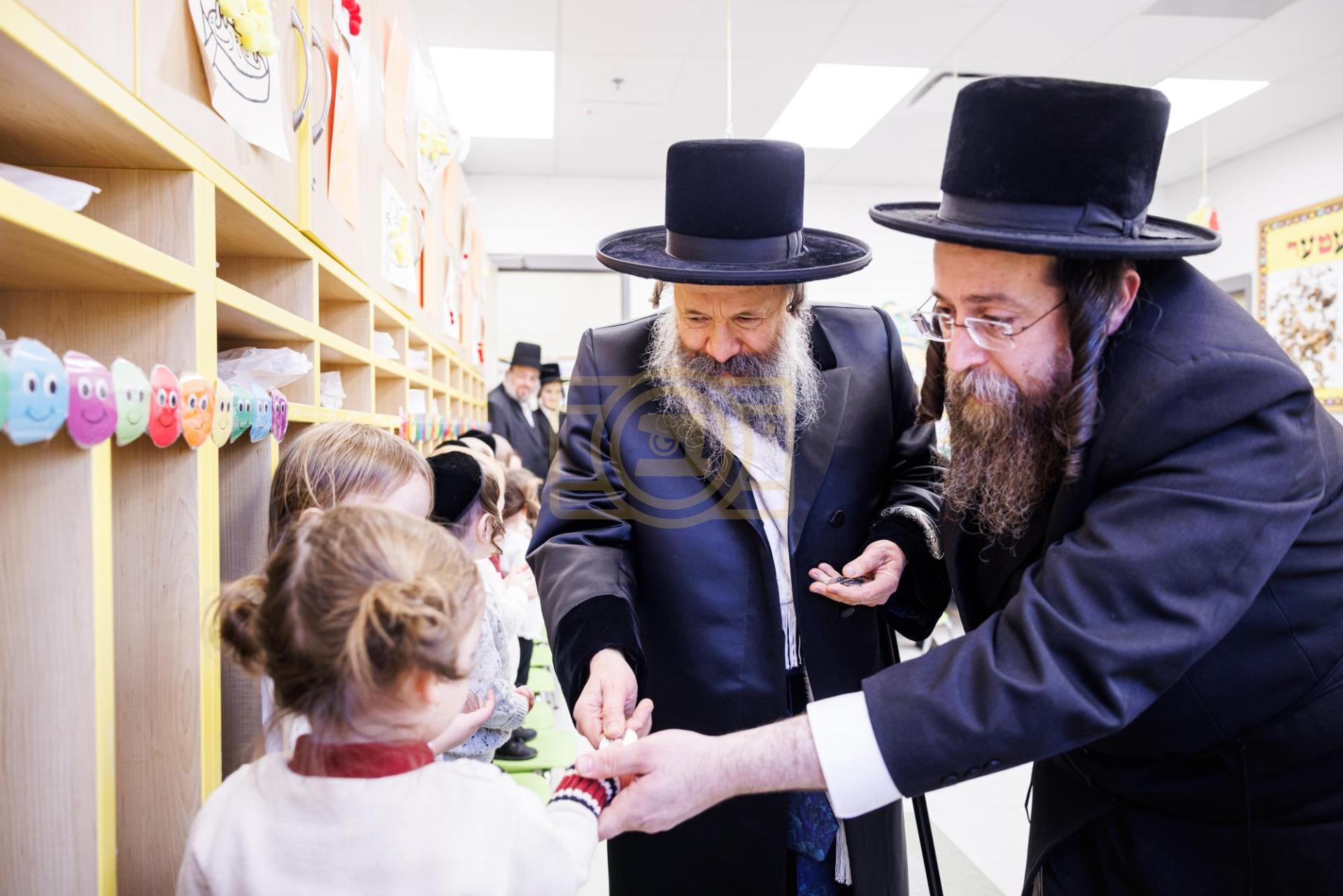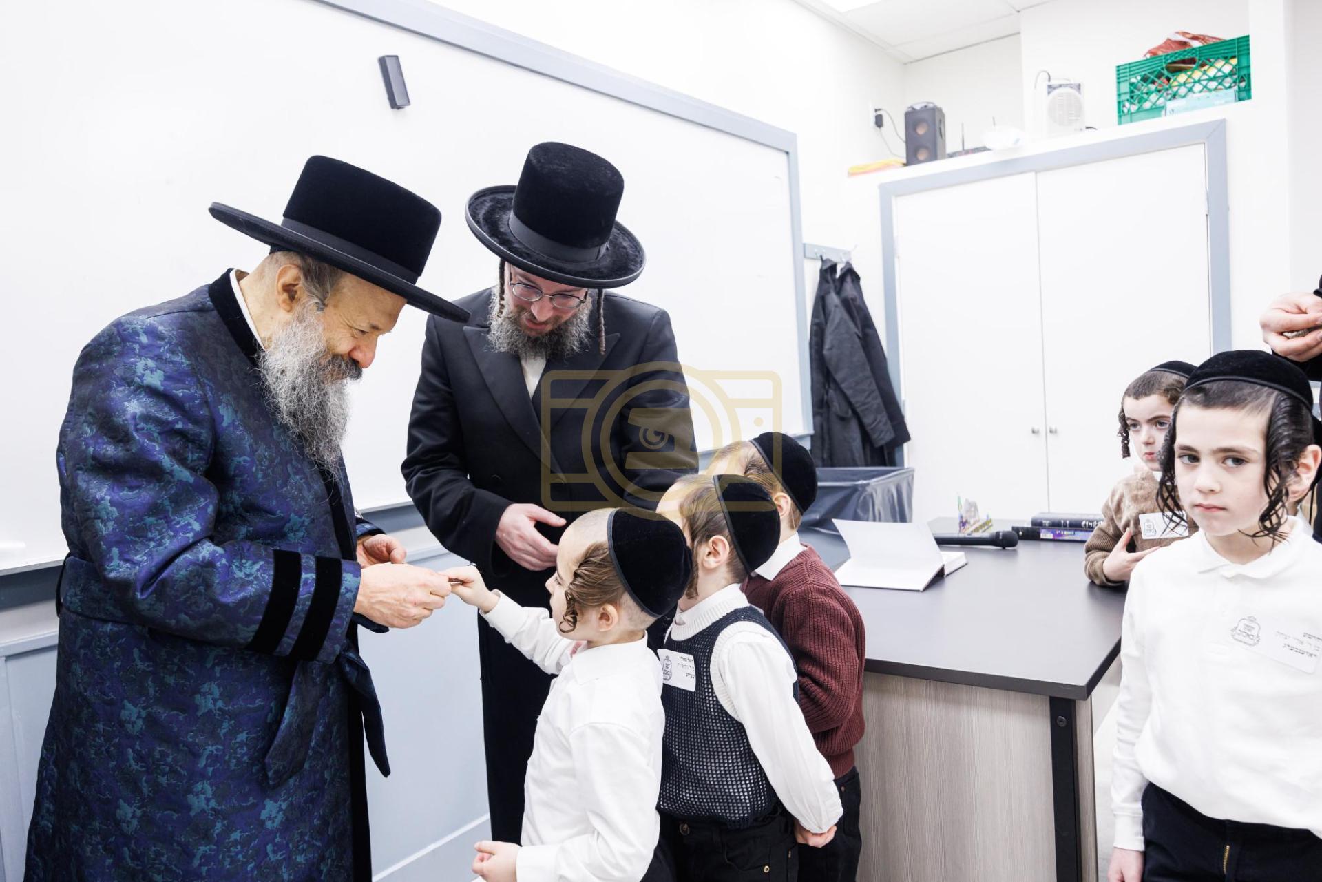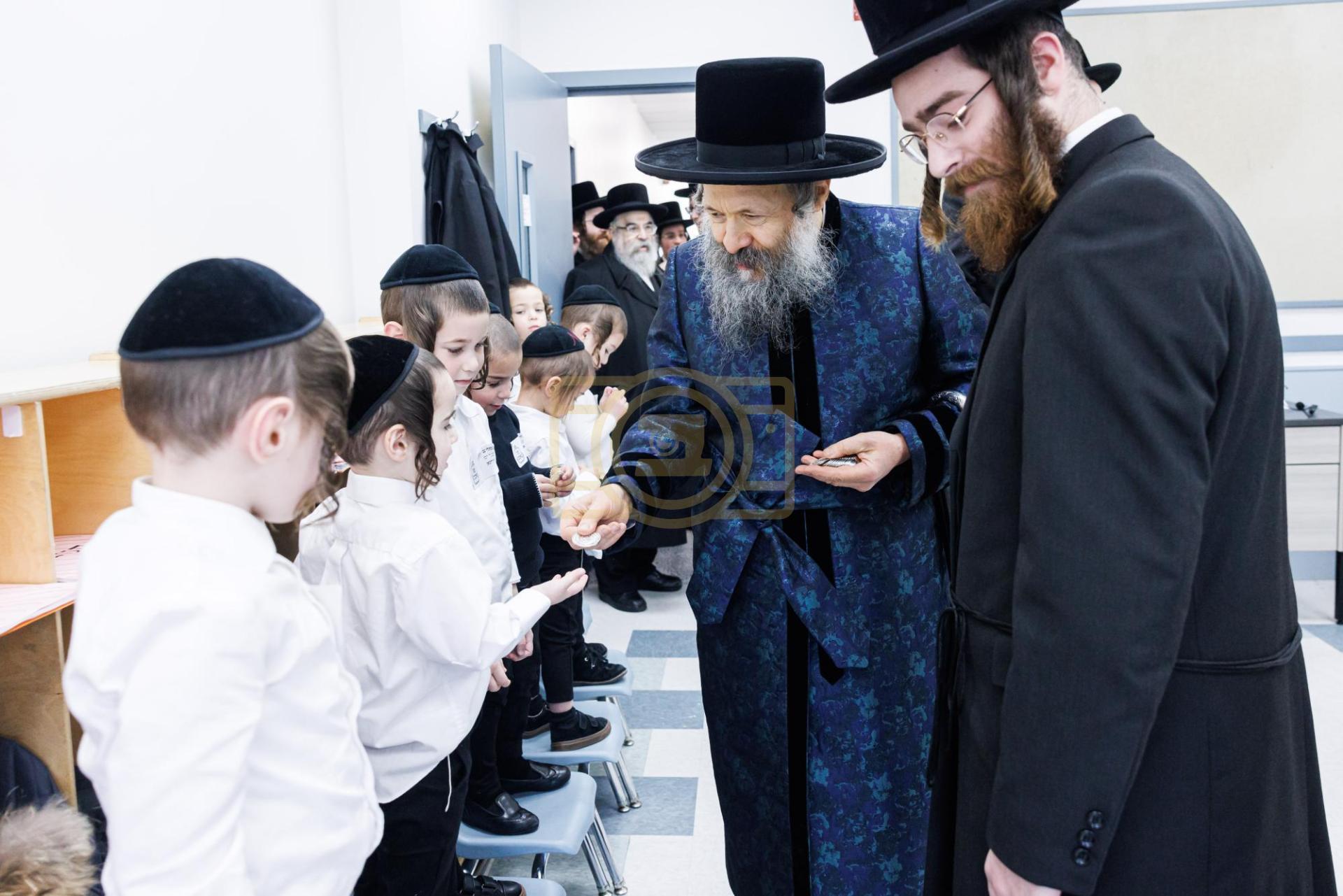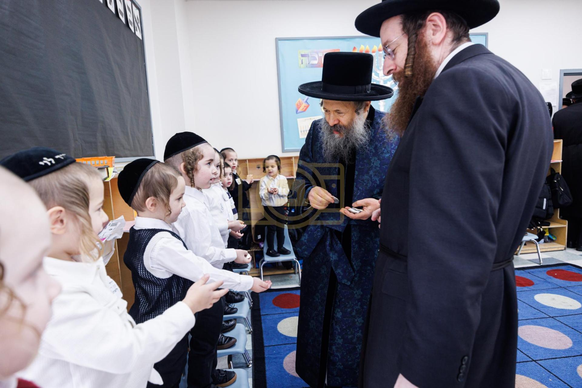 חלוקת חנוכה געלט לתלמידים עד גיל כיתה ב' בבנין הת"ת ברח' 20 ששופץ לאחרונה, וכן קביעת מזוזה ע"י האדמו"ר וע"י הרב יעקב יוסף שטיינמעץ מנכ"ל המוסדות