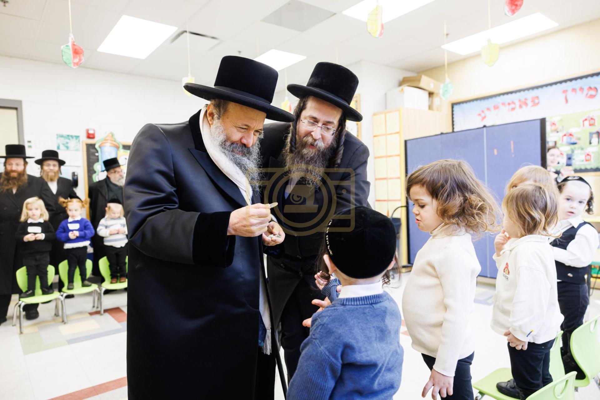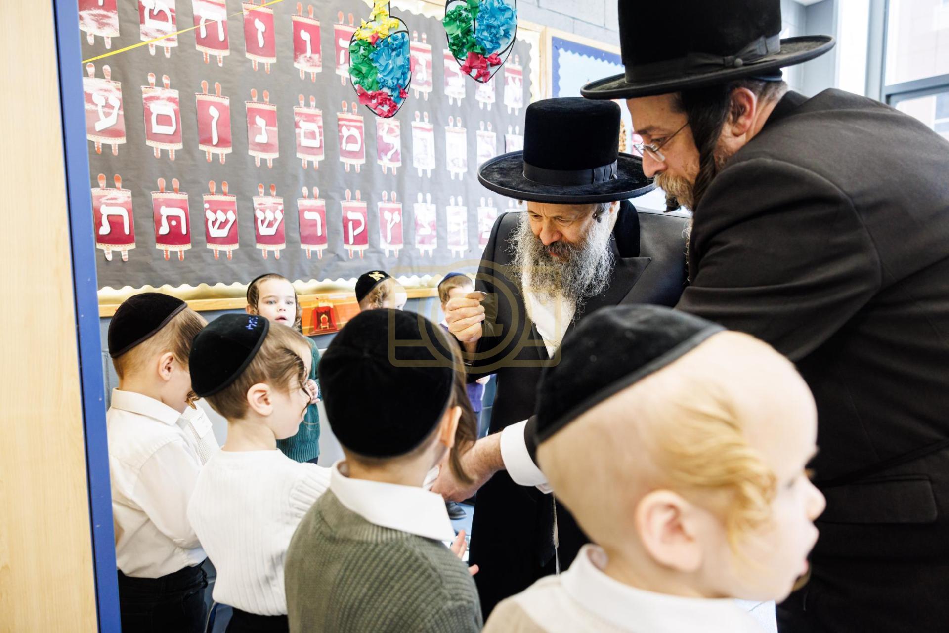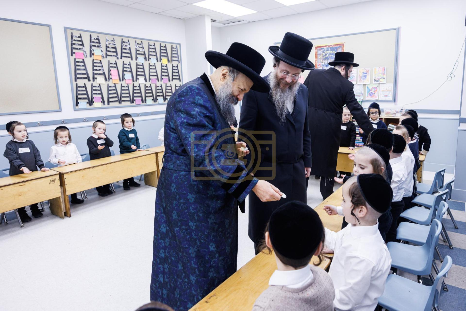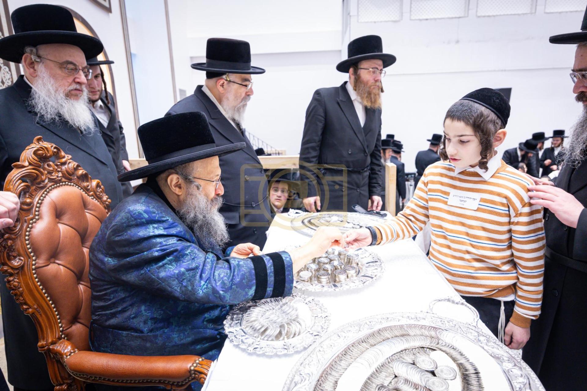חלוקת חנוכה געלט לתלמידים עד גיל כיתה ב' בבנין הת"ת ברח' 20 ששופץ לאחרונה, וכן קביעת מזוזה ע"י האדמו"ר וע"י הרב יעקב יוסף שטיינמעץ מנכ"ל המוסדות