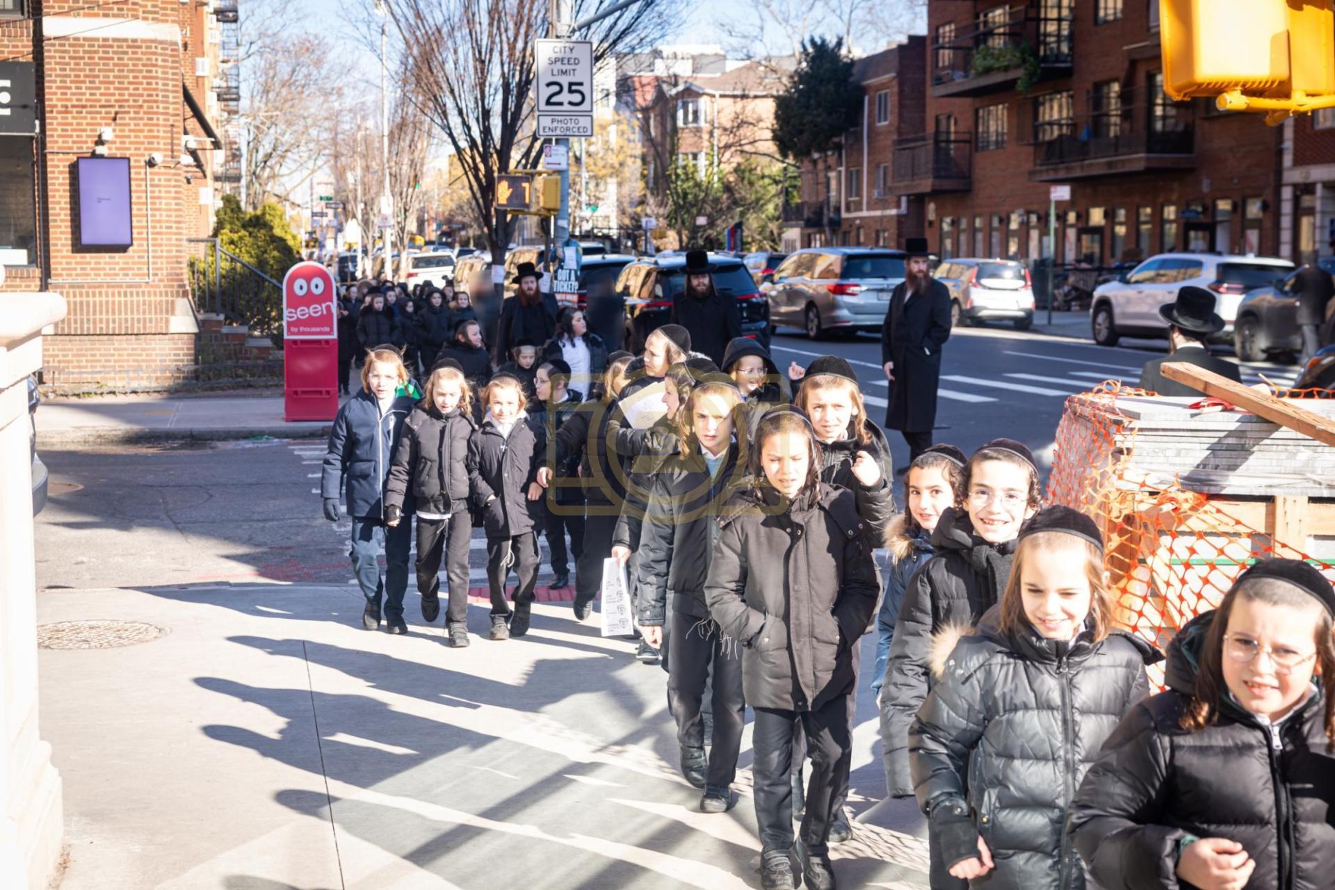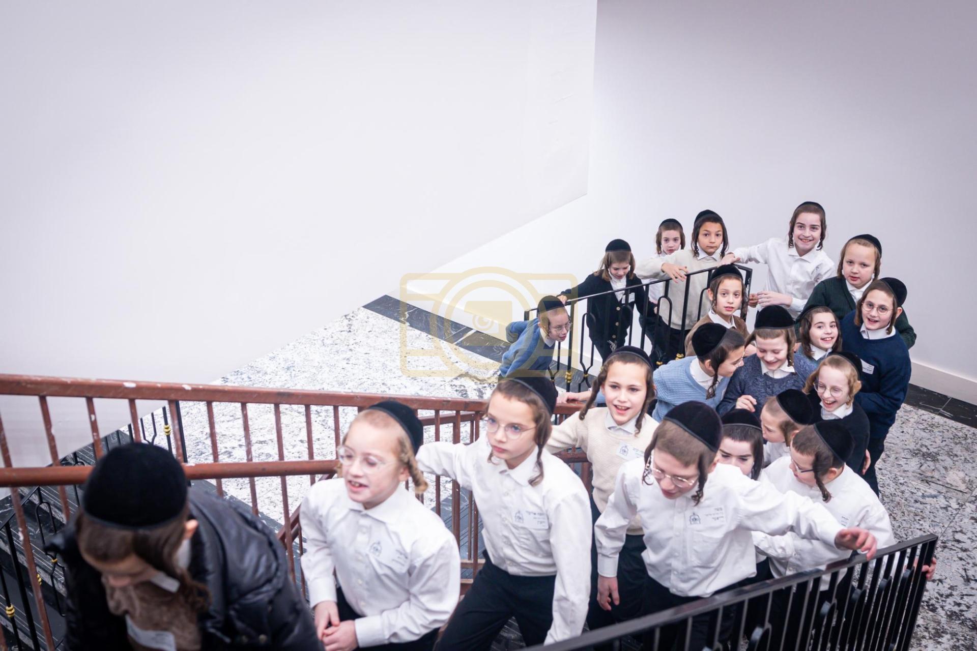 חלוקת חנוכה געלט לתלמידים הצעירים בבנין המוסדות ברח' 62, וביקור במחלקה החדשה 'קינדער ווינקעל' בתוככי בנין המוסדות.