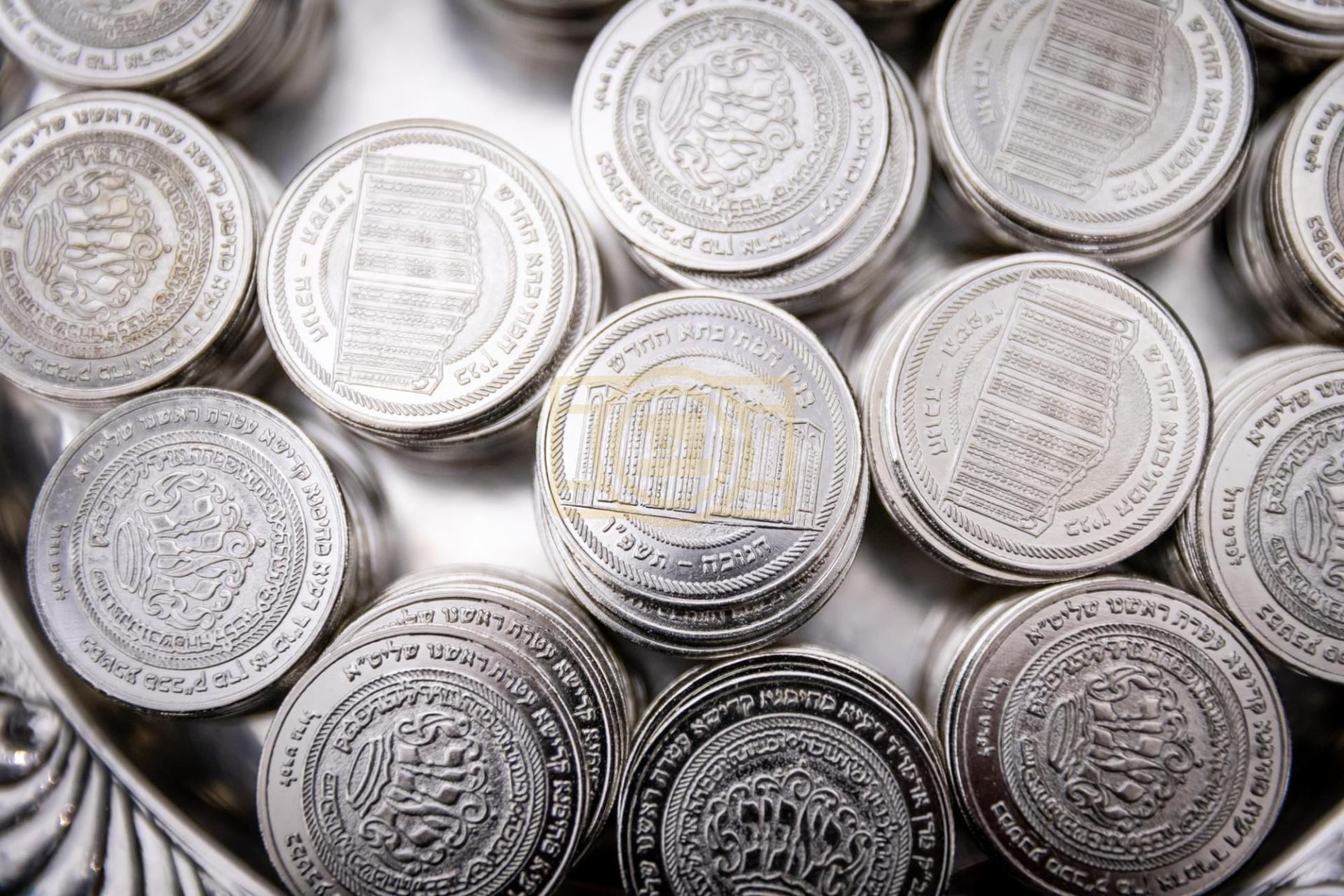 המטבע המיוחדת שחילק האדמו"ר חנוכה געלט לכל סניפי המוסדות, עם צורת בנין המתיבתא החדש ההולך ונבנה בימים אלו