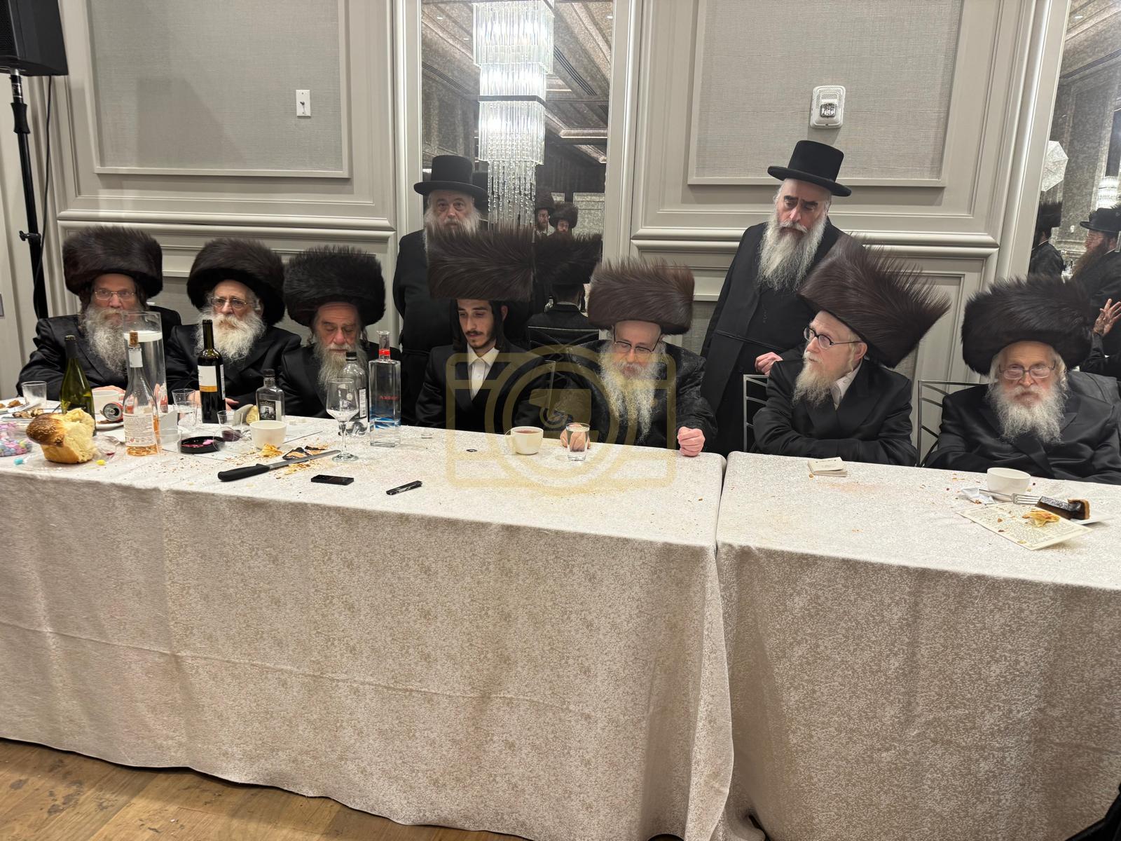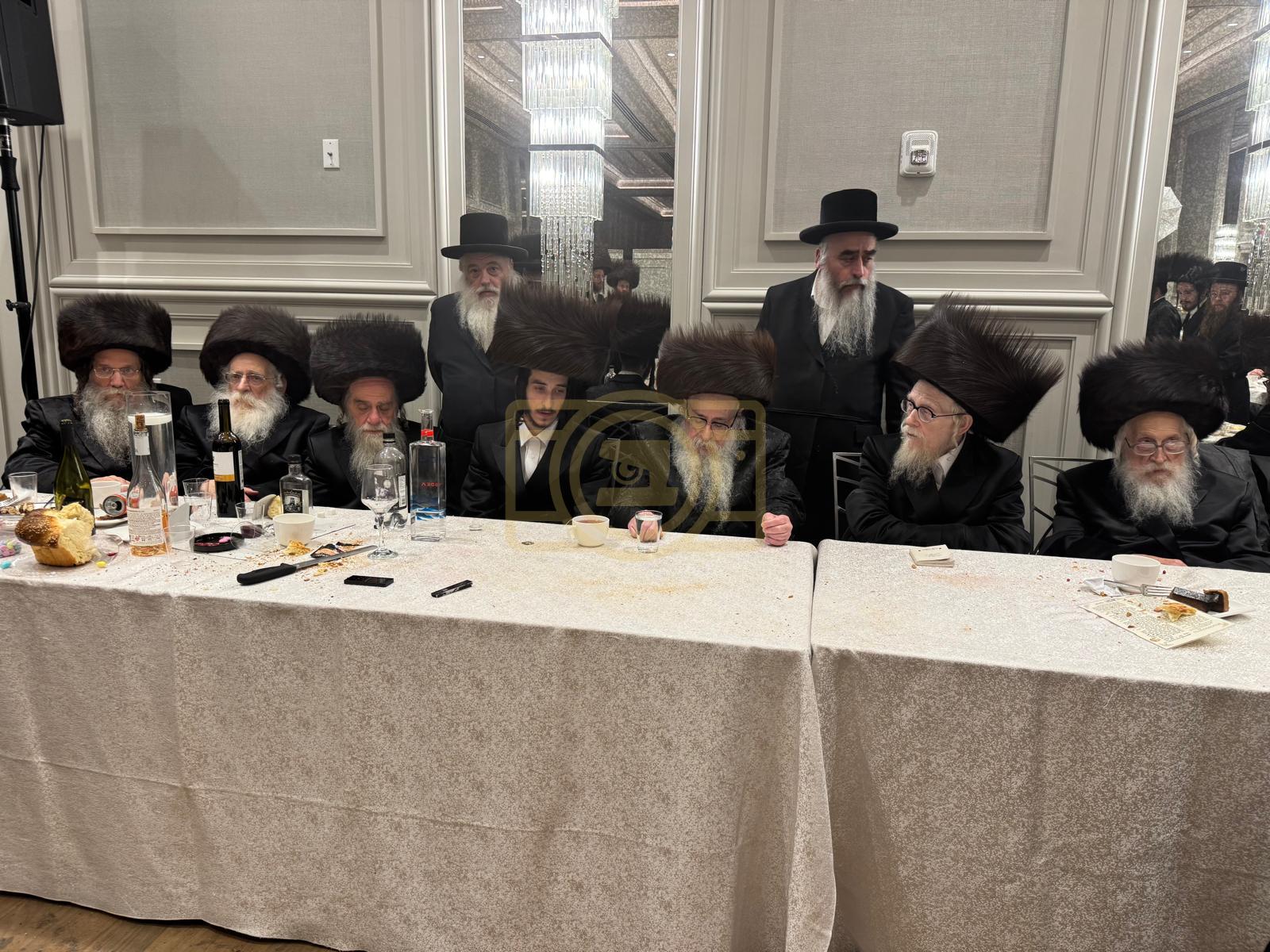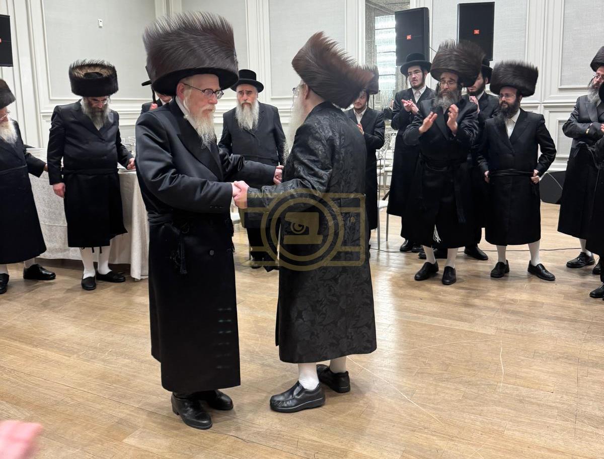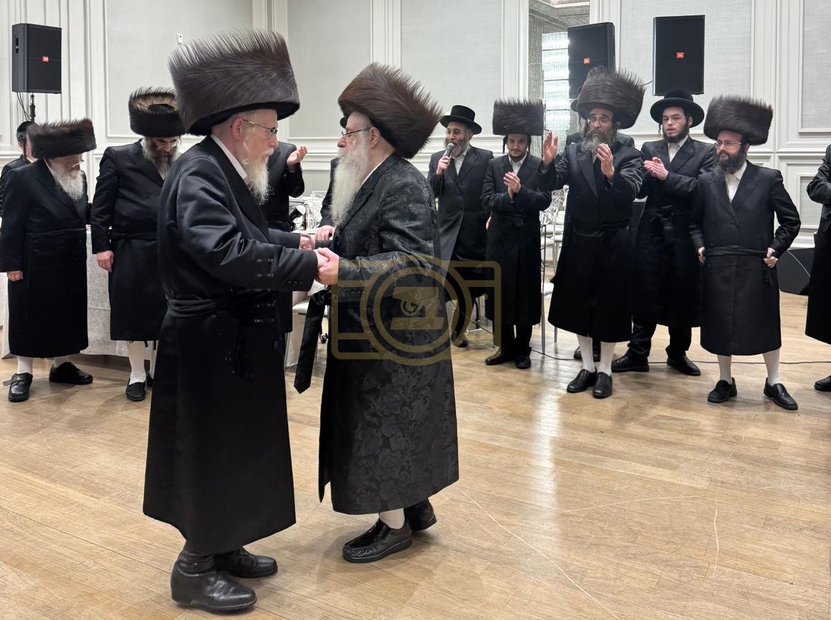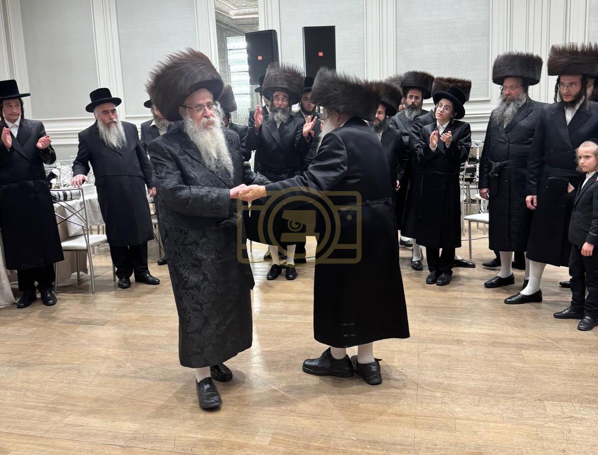 כ"ק אדמו"ר מצאנז קלויזענבורג שליט"א באטייליגט זיך ביים שמחת החתונה פון החתן נכד גיסו אב"ד לינז וומס"ב מיט הכלה נכדת דומ"ץ סקווירא ב"פ